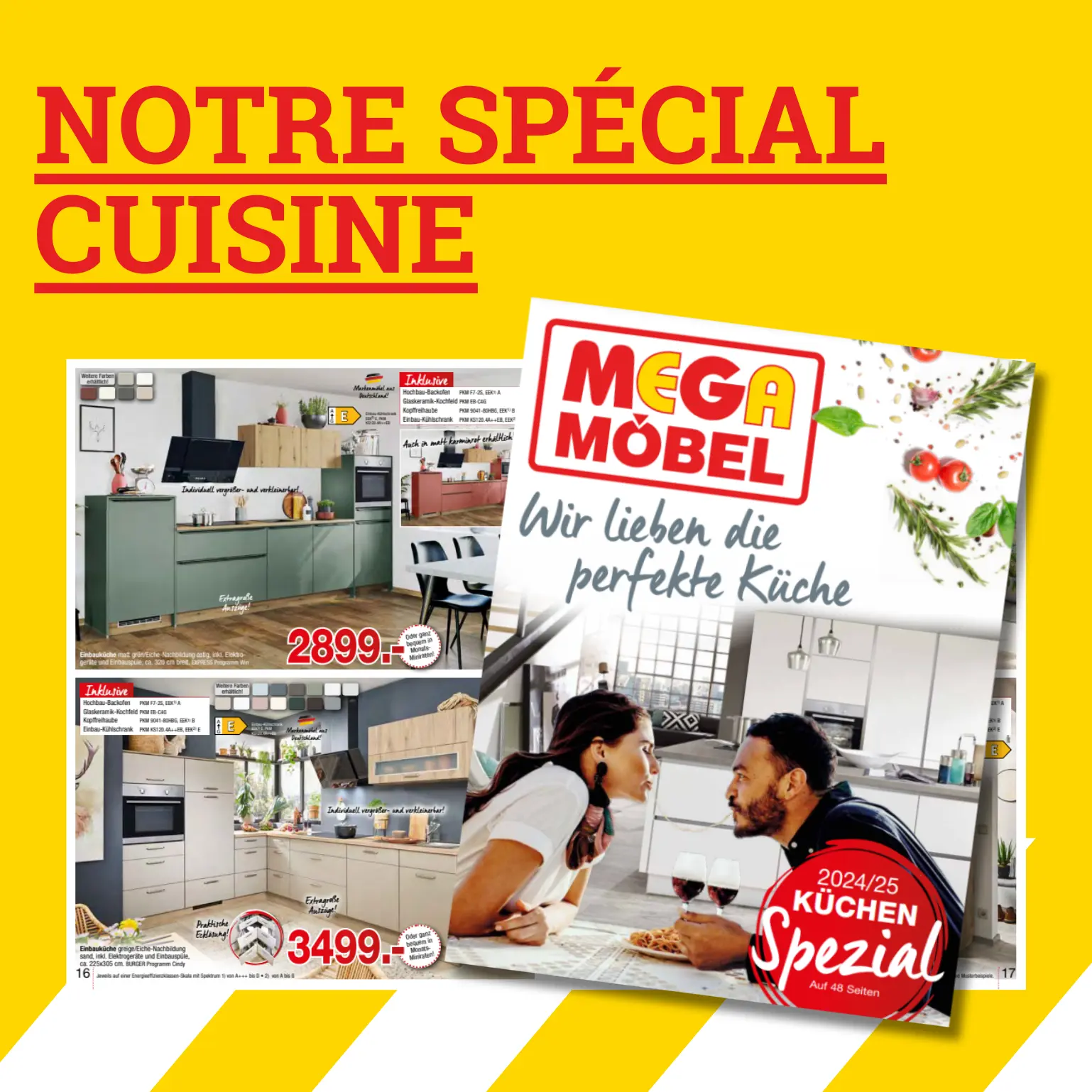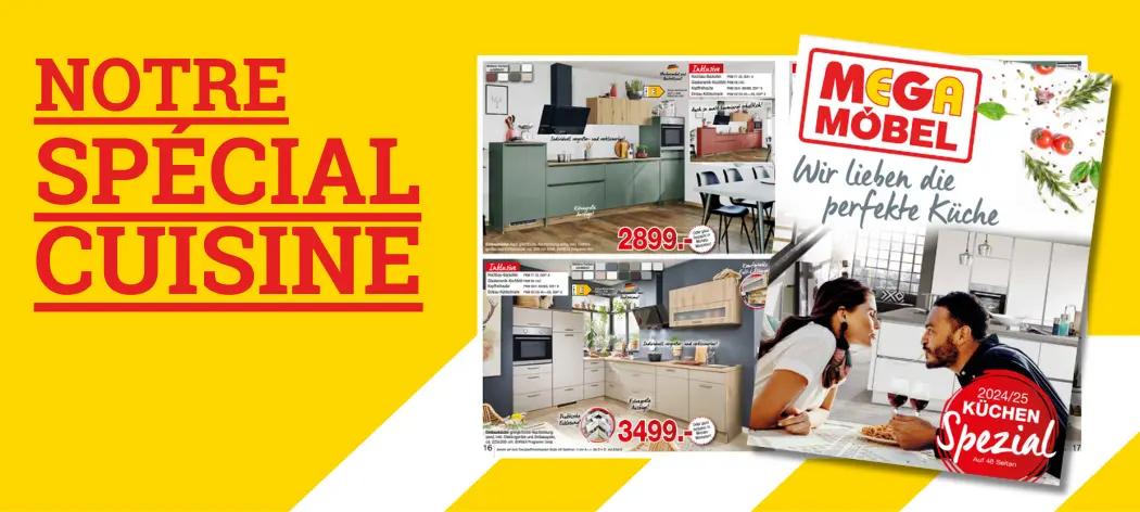 La garantie du meilleur prix MEGA Möbel signifie que nous vous offrons non seulement un service de première classe mais aussi les meilleurs prix possibles pour nos cuisines. Et voici comment cela fonctionne : Si, pendant une période donnée, vous trouvez l'article identique avec les mêmes prestations chez un autre fournisseur à un prix moins élevé, nous vous remboursons la différence. N'hésitez pas à nous contacter. Chut ! Chez nous, vous trouverez également des offres spéciales ou de superbes cuisines de déstockage à des prix MEGA.