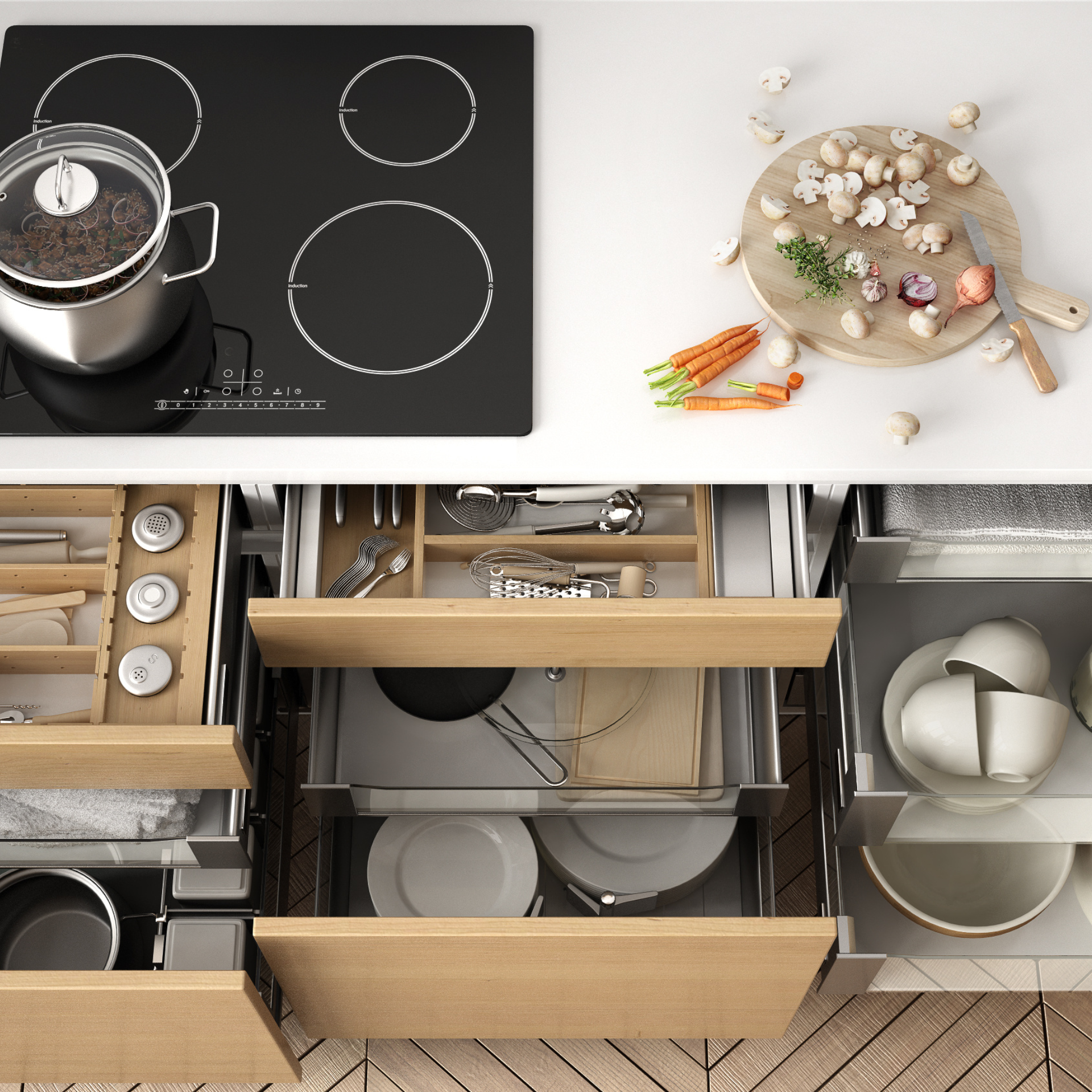 Les armoires et les tiroirs sont la clé d'une cuisine bien rangée. La recherche énervante d'ustensiles de cuisine importants et le désordre dans les armoires appartiennent ainsi au passé. Des solutions d'angle coulissantes, des tiroirs judicieusement subdivisés, des étagères rabattables ou une armoire haute coulissante (armoire de pharmacie) permettent d'avoir une vue d'ensemble parfaite et d'utiliser l'espace de rangement jusque dans les moindres recoins.