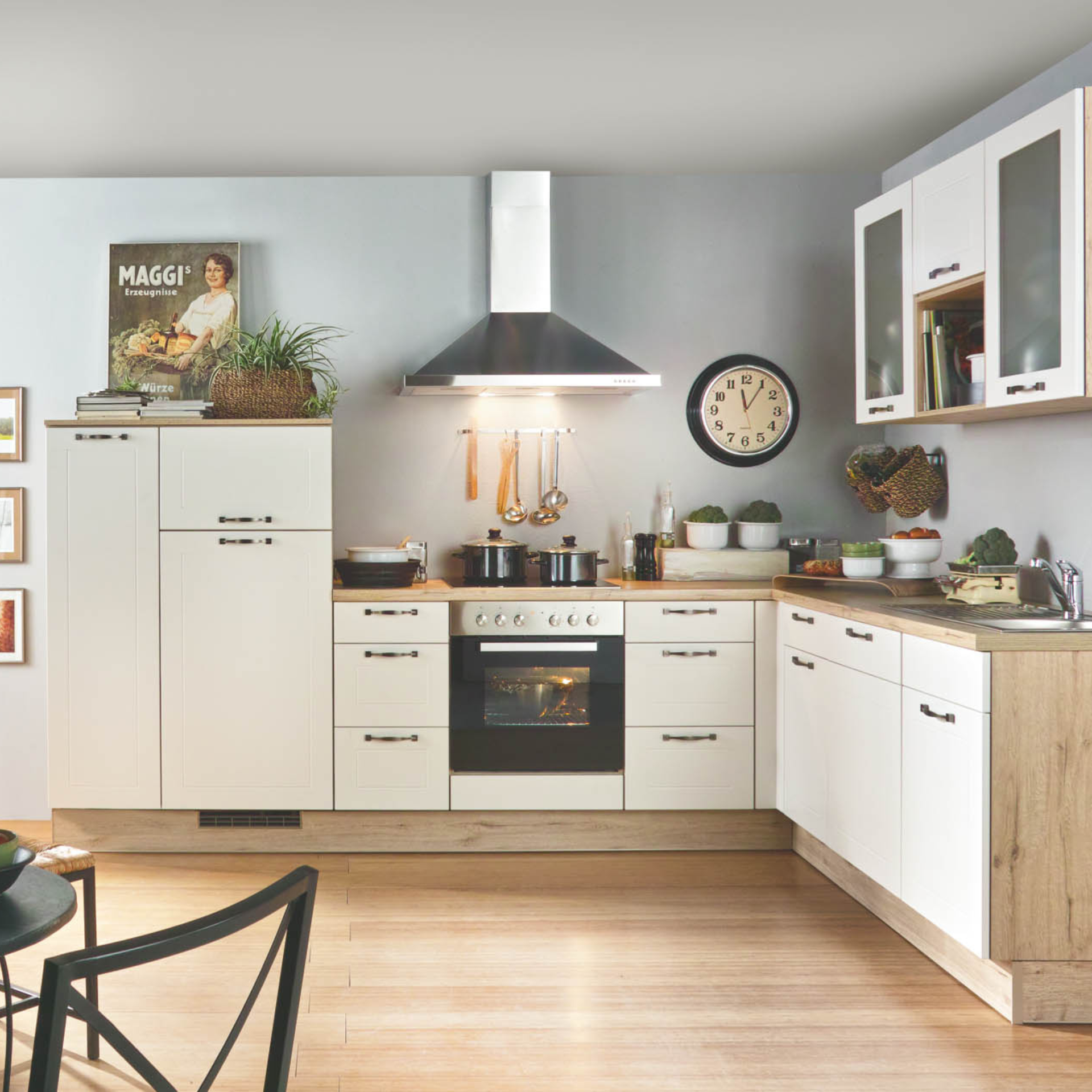 Le choix de la cuisine qui vous convient le mieux dépend en grande partie du style d'aménagement de l'espace ouvert. Les façades de cuisine jouent un rôle important. Les styles les plus appréciés sont la maison de campagne classique réinterprétée, le style moderne avec ses surfaces métalliques, le béton et la pierre naturelle et le "look classique" intemporel avec beaucoup de blanc et des tons clairs de bois naturel. Ce dernier apporte de la légèreté dans la maison et s'adapte à de nombreux styles d'aménagement.