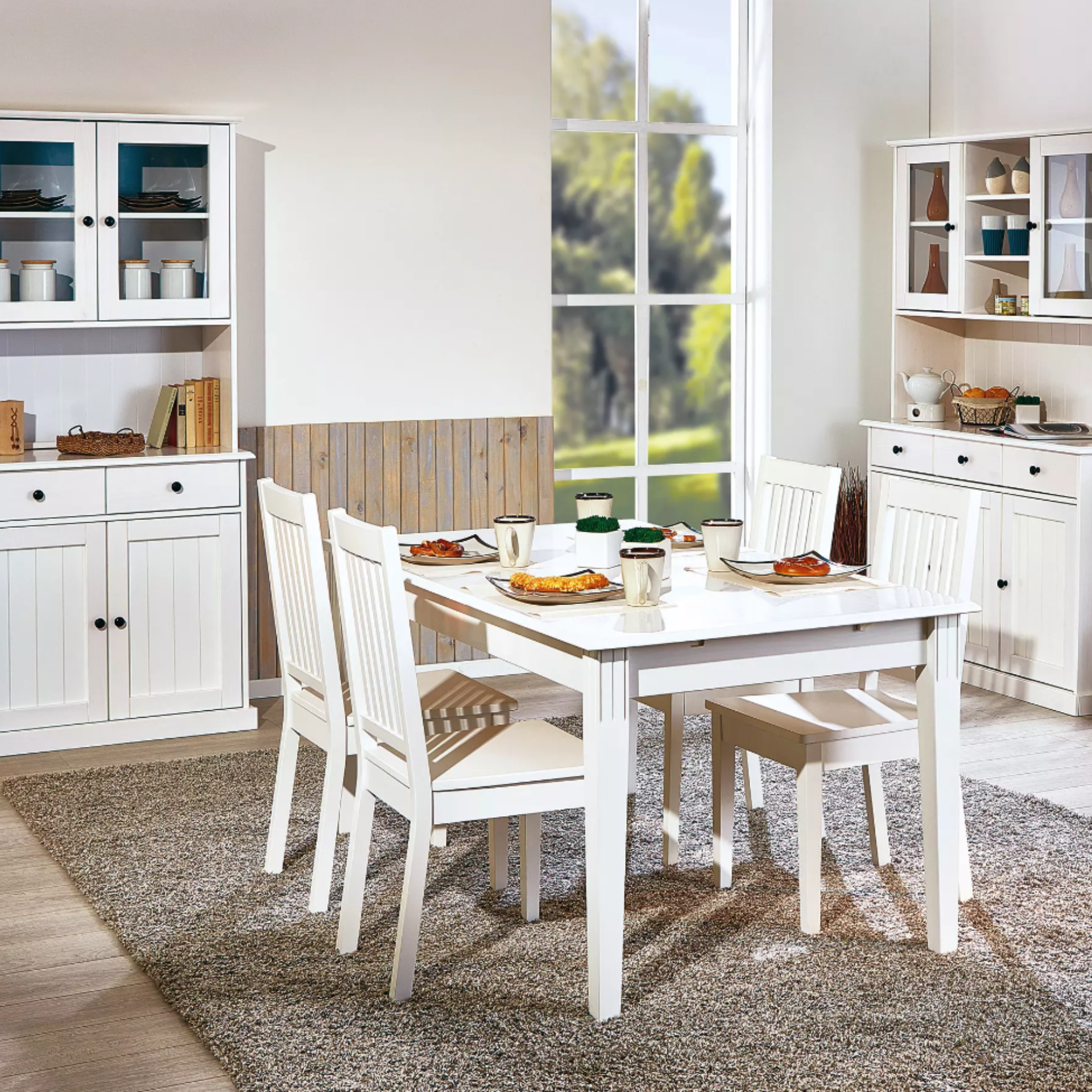 Dans les cuisines de style campagnard romantique, on trouve souvent des meubles en bois véritable avec des façades à cassettes blanches ou de couleur pastel ainsi que des plans de travail en bois ou en pierre naturelle. Des armoires suspendues avec des fenêtres à croisillons et des moulures décoratives ludiques soulignent le style. Les buffets avec des éléments décoratifs et des poignées filigranes complètent parfaitement le look.