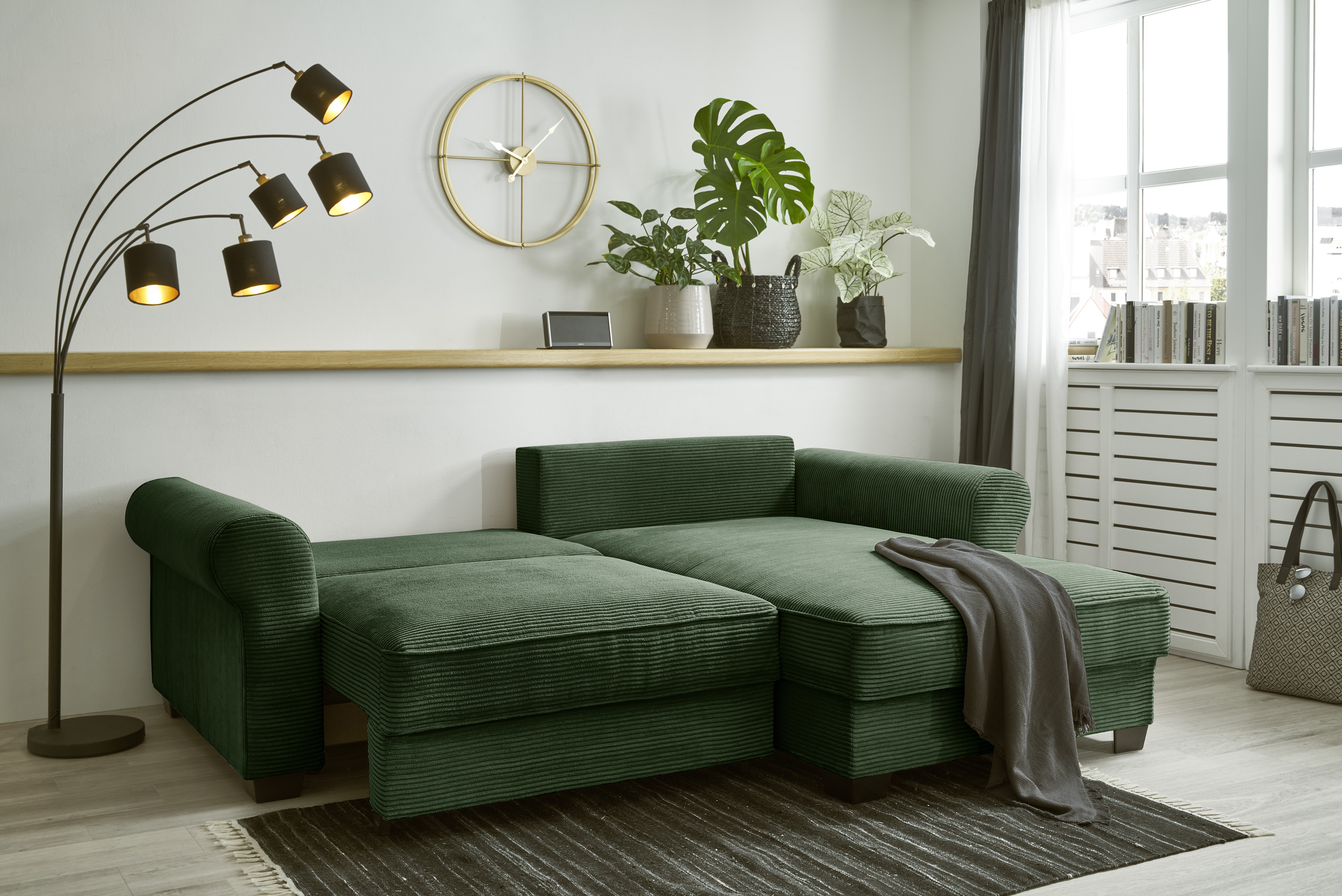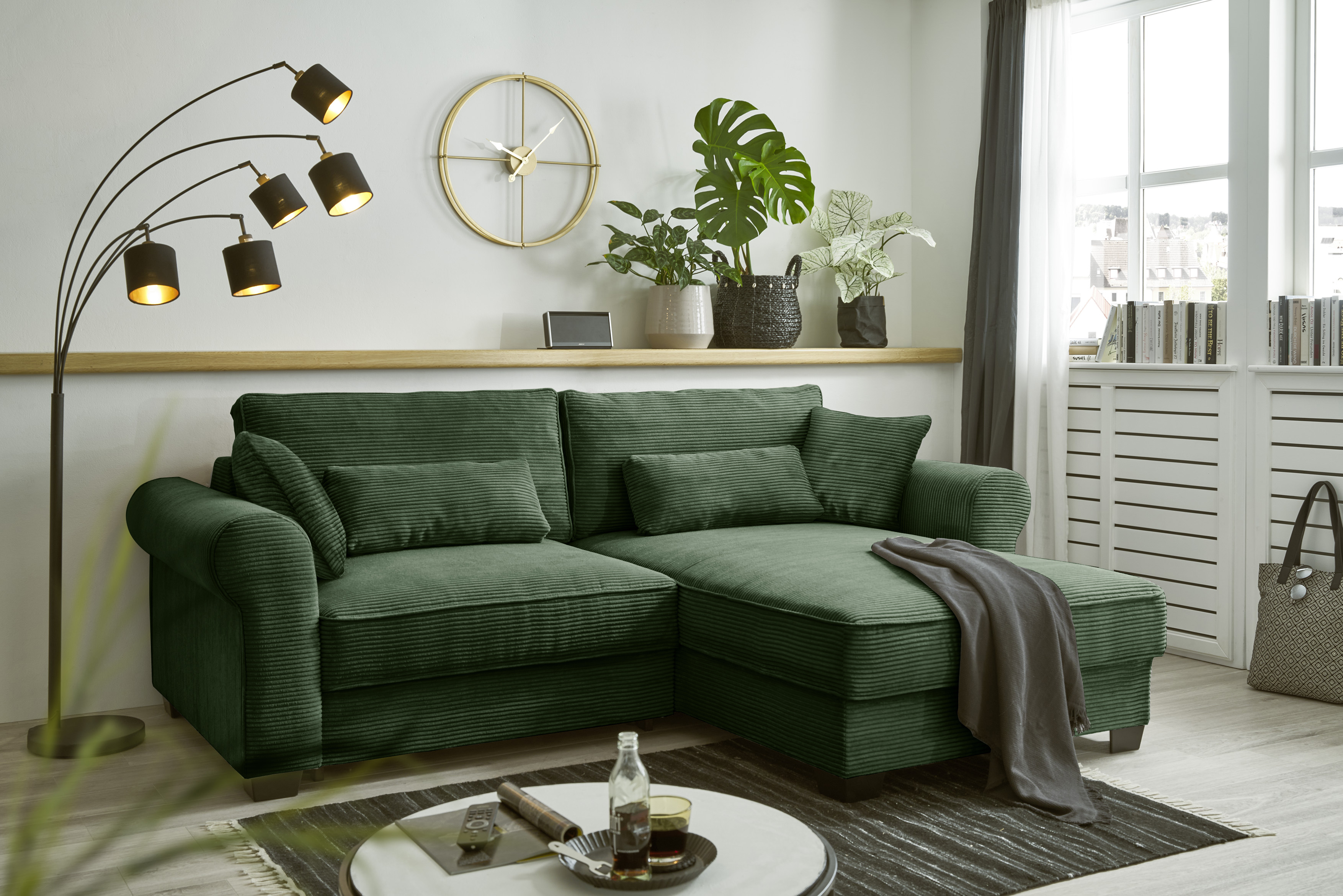 Equipement canapés: | Dos habillé, Méridienne à droite ou à gauche, incl. coffre de lit, incl. coussins |