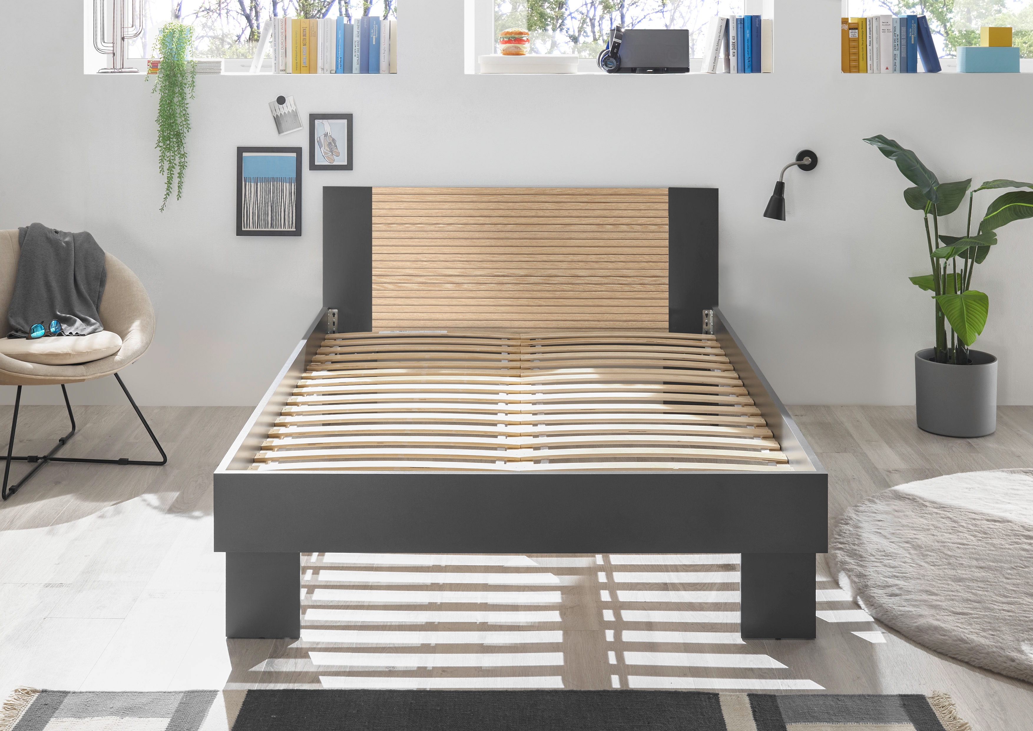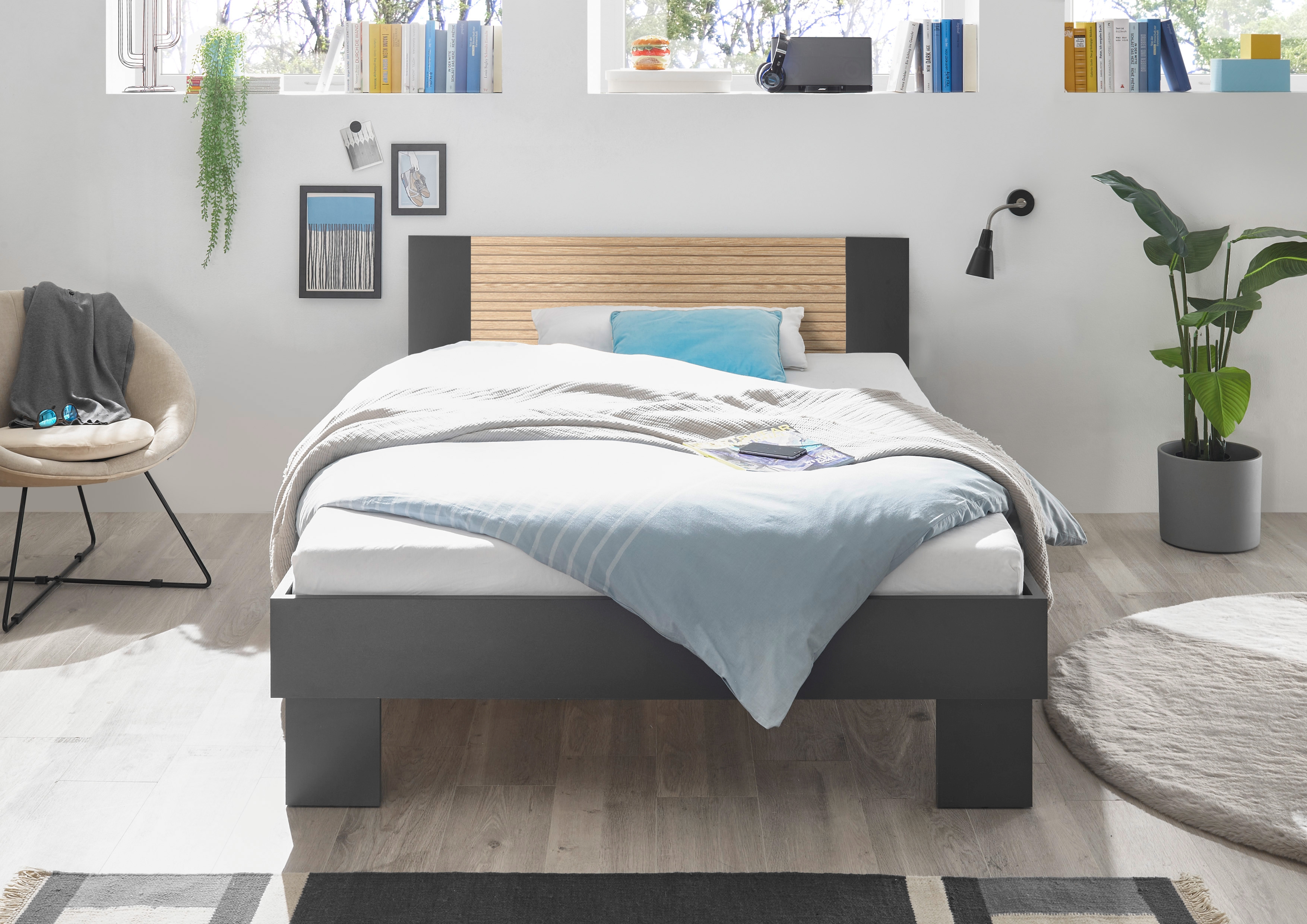 ton graphite avec tête de lit décor lamelles de chêne, revêtement mélaminé