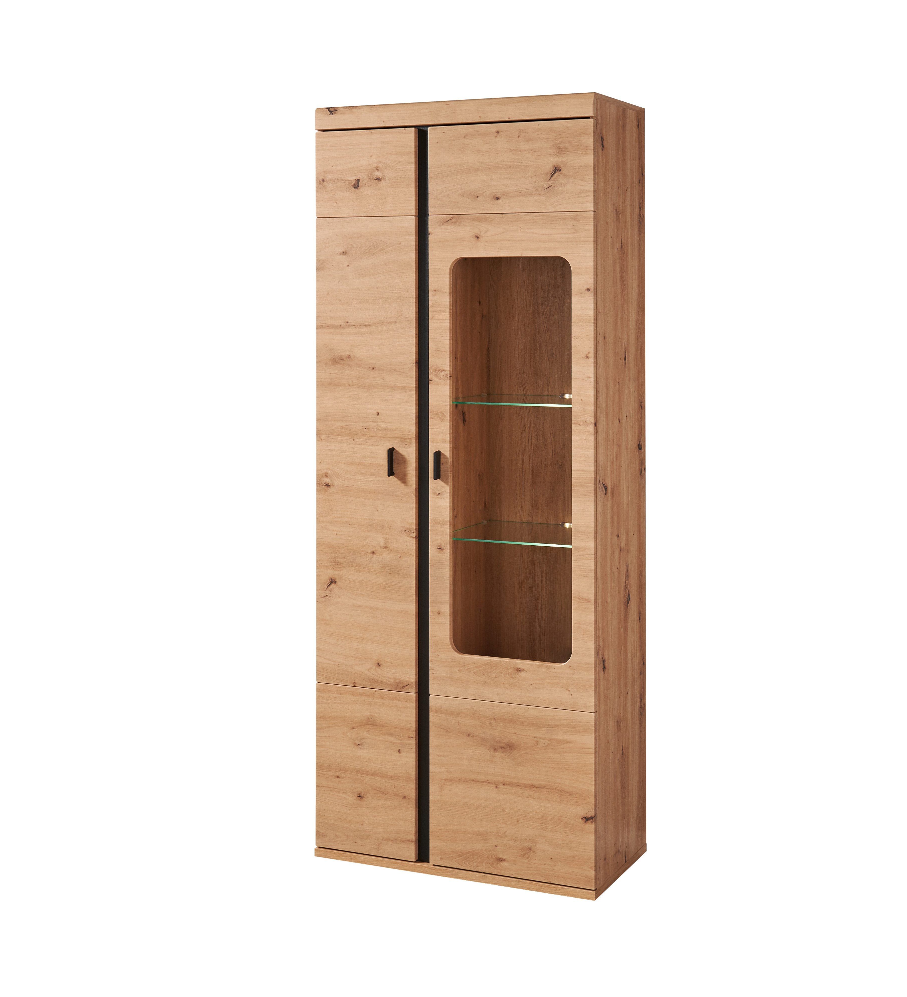 Façade : décor chêne Artisan, MDF (panneau de fibres de bois de densité moyenne) pelliculé avec contrastes ton noir (panneau de particules surfacé mélaminé (PPSM))/ verre