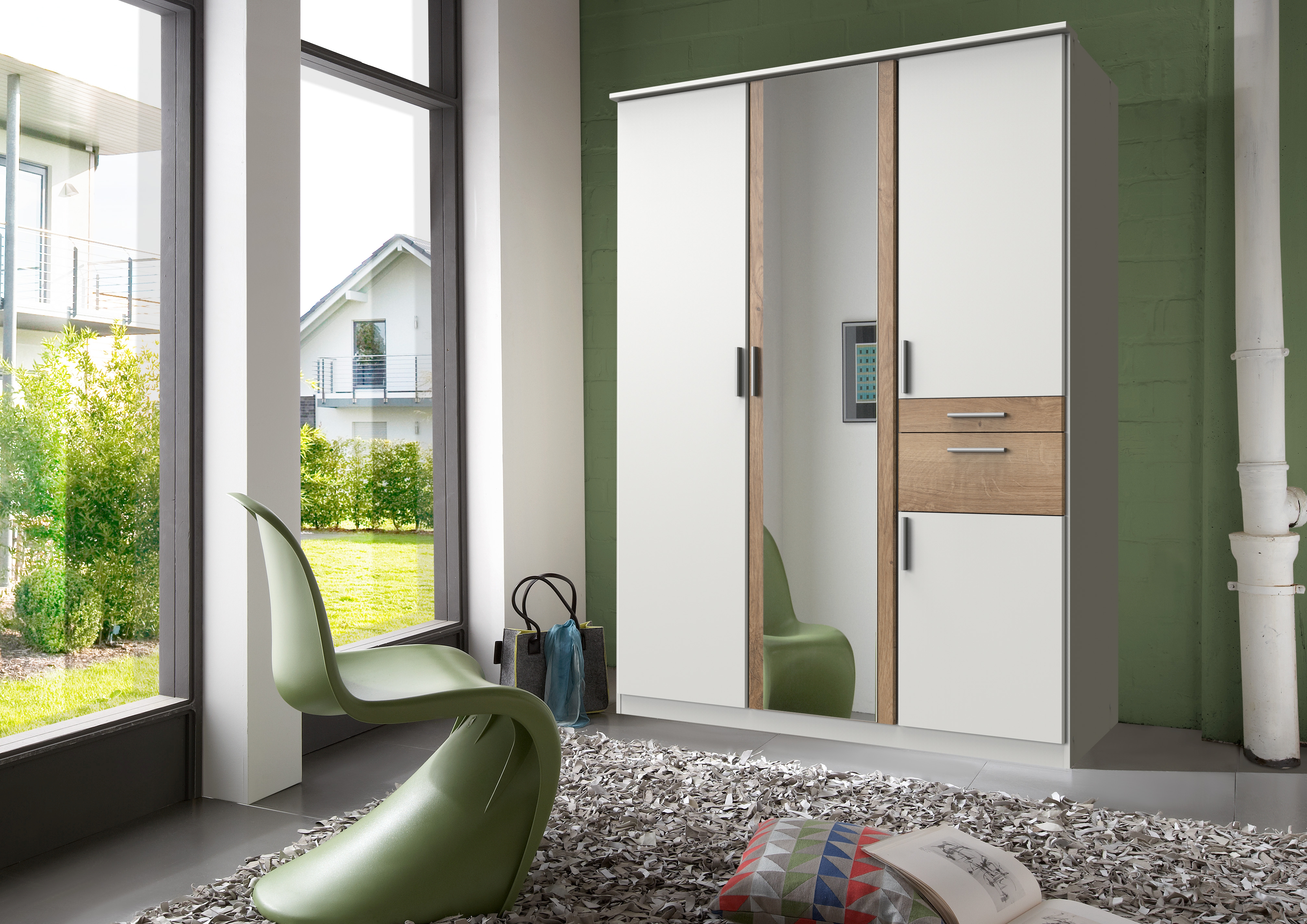 Caisson et façade : ton blanc avec contrastes décor planches de chêne / miroir