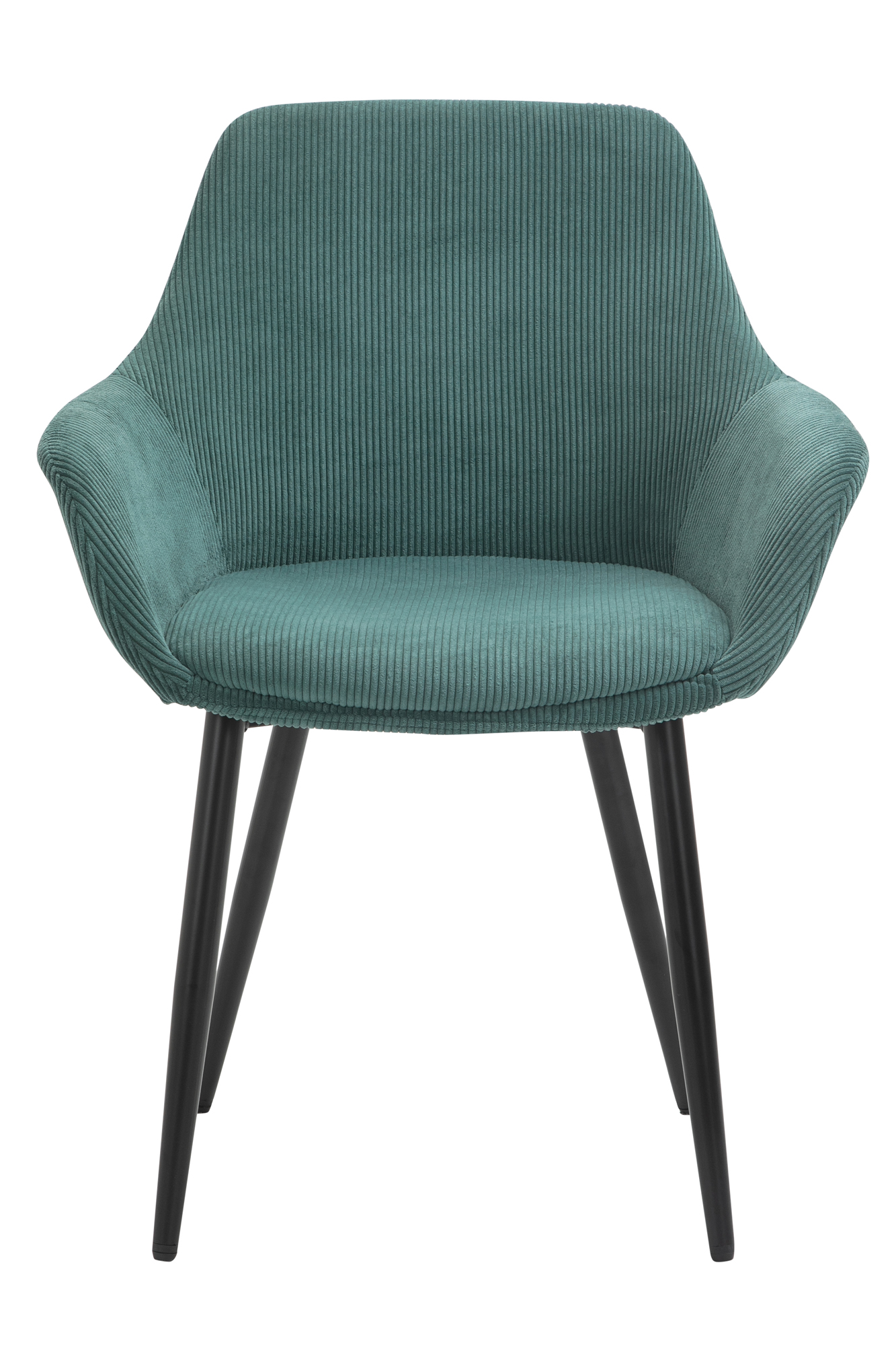 Ce lot de 2 chaises à accoudoirs tendance est proposé dans un tissu texturé aspect velours côtelé. Le piètement fin à 4 pieds en métal finition époxy ton noir mat garantit une excellente stabilité tout en offrant un superbe contraste avec le revêtement de la chaise. Grâce au dossier arrondi et au rembourrage confortable, vous bénéficierez d'un excellent confort d'assise. Les accoudoirs légèrement évasés sont un vrai point fort visuel. Grâce à leur design stylé, les chaises peuvent être placées dans un coin repas, une salle d'attente ou même une salle de réunion. Ce meuble attirera également tous les regards en guise de chaise solo. Vous et vos invités allez adorer votre nouveau siège.