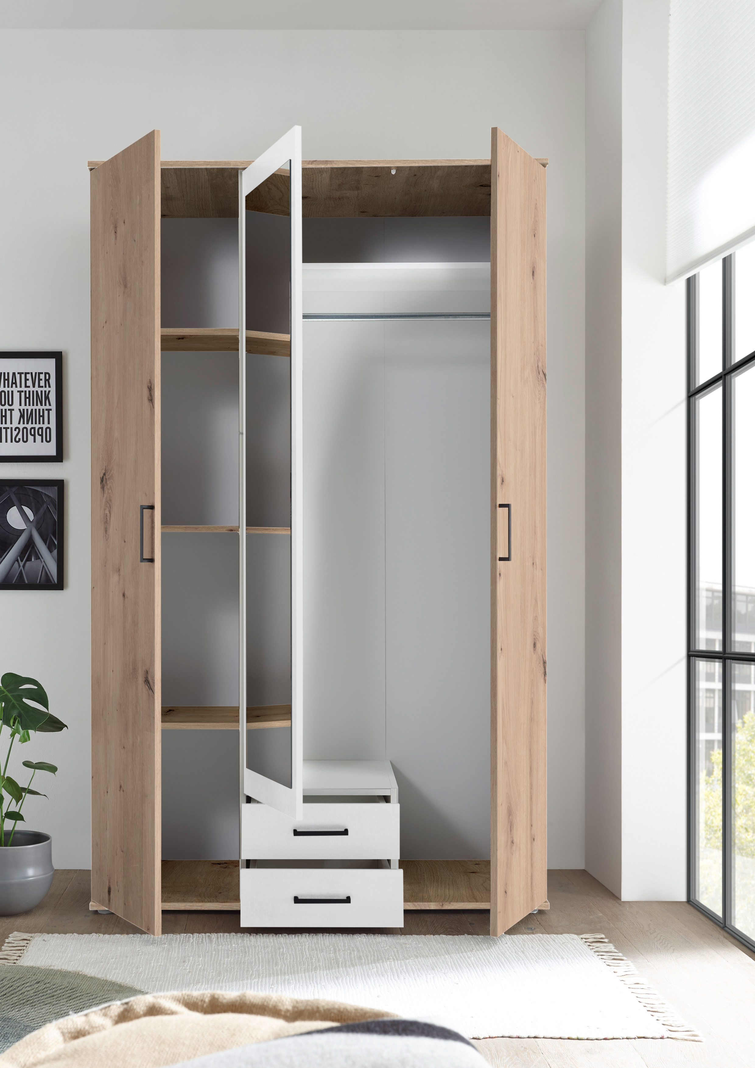 CHICAGO : armoire à vêtements élégante et spacieuse dans un décor chêne Artisan avec contrastes ton blanc (dimensions : L/H/P : 120 x 197 x 54 cm)