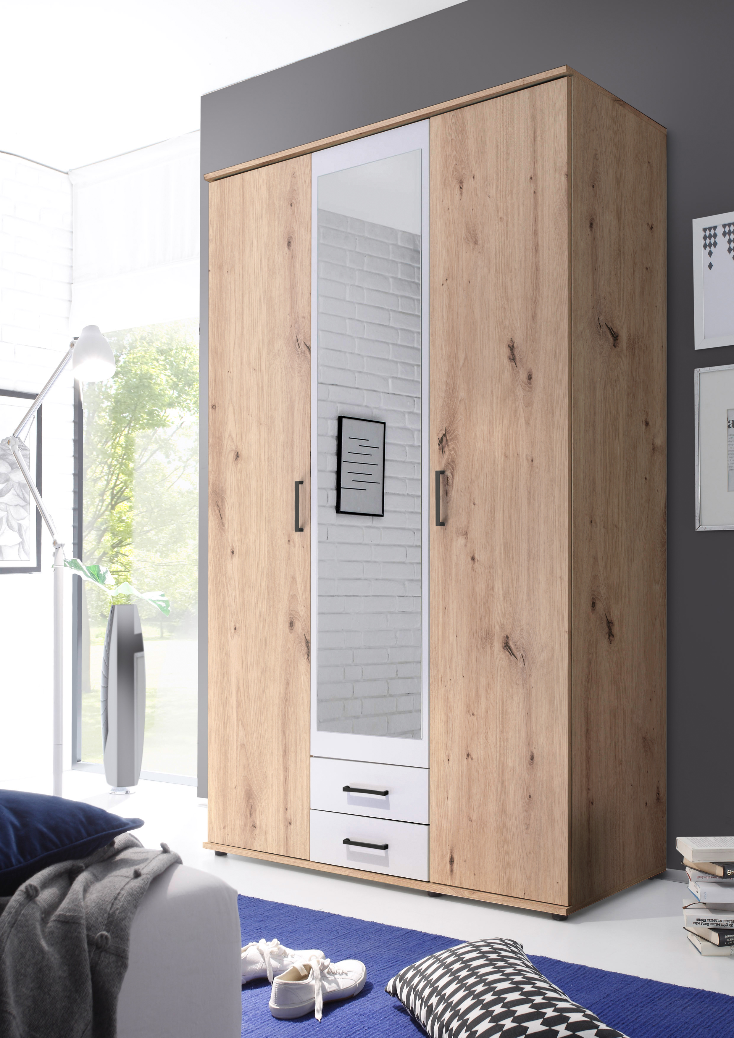 Avec cette armoire moderne, vous pourrez aménager votre chambre ou la chambre d’ado avec goût. Ce joli modèle équipé d’un miroir sur la porte centrale est proposé dans un style intemporel. Les tiroirs et les compartiments derrière les portes offrent un vaste espace de rangement pour les vêtements et autres effets personnels. Cette armoire tendance s’intègre harmonieusement dans la chambre junior, la chambre à coucher ou le premier studio. Vous avez le choix puisque ce modèle est disponible en version 3 ou 4 portes.