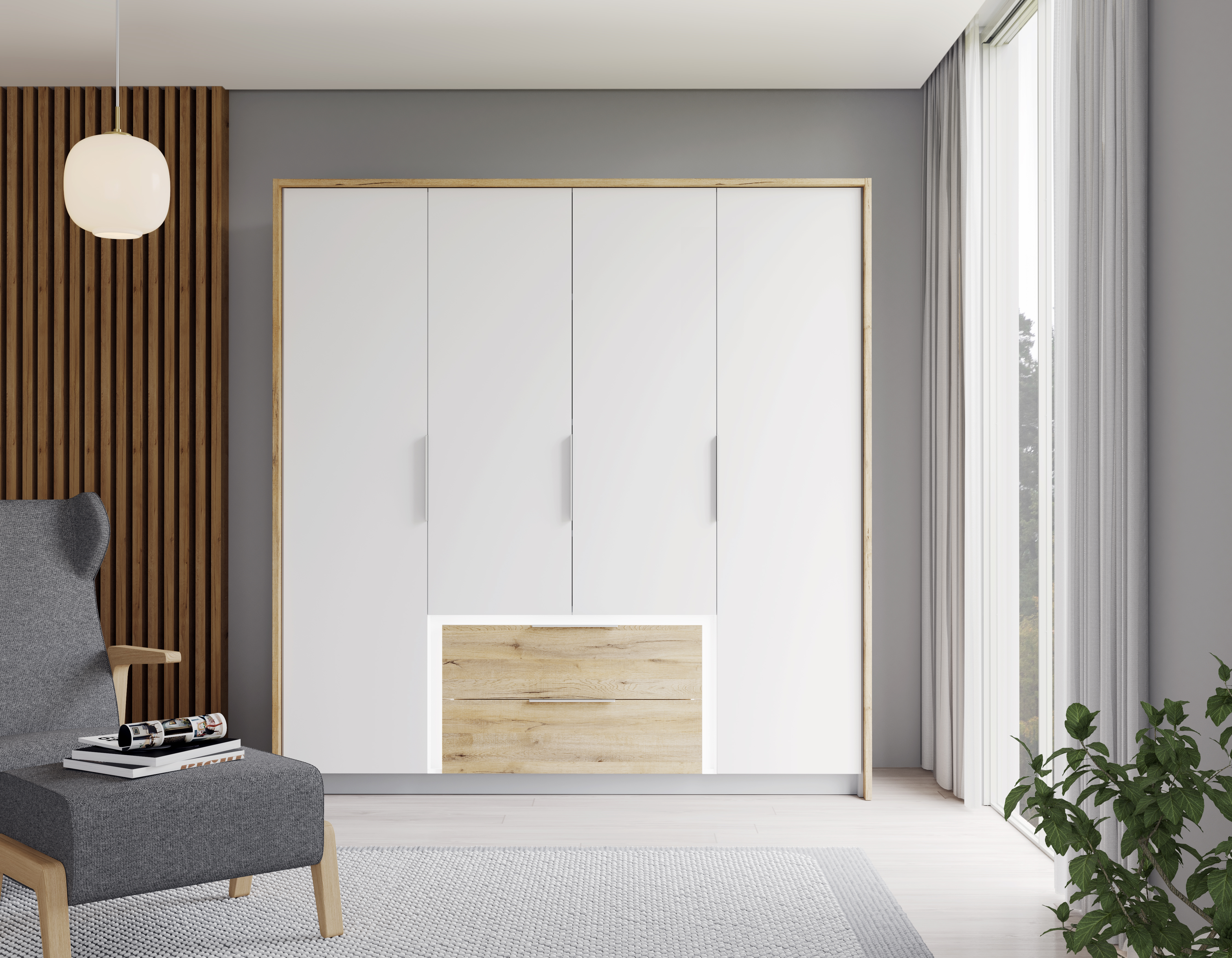 Façade et caisson : M581 ton blanc et décor chêne Bartex
