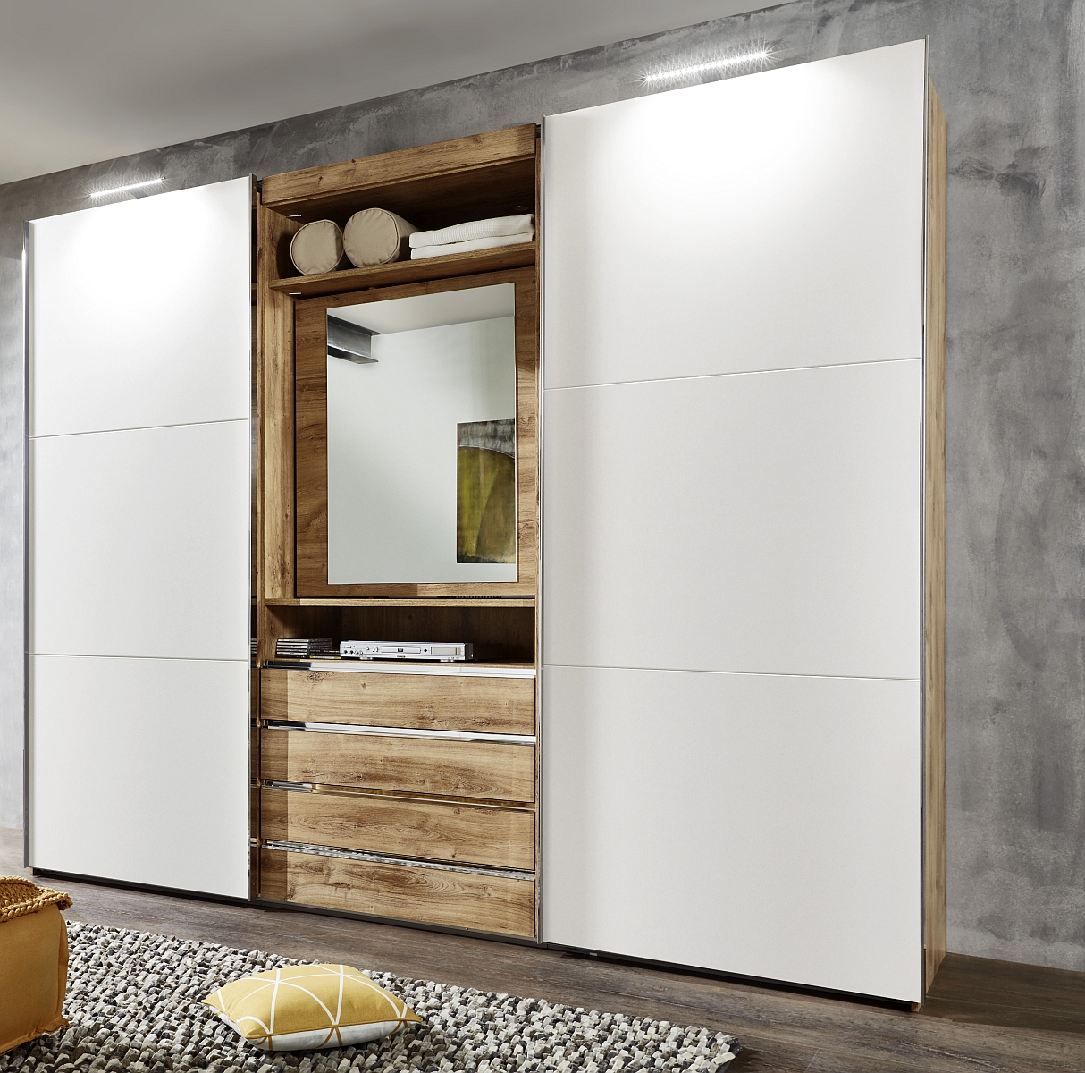 au centre : en haut, 1 casier ouvert et 1 élément miroir pivotant (derrière : 3 casiers ouverts), pouvant être monté au choix avec ouverture à droite ou à gauche; en bas : 4 tiroirs
