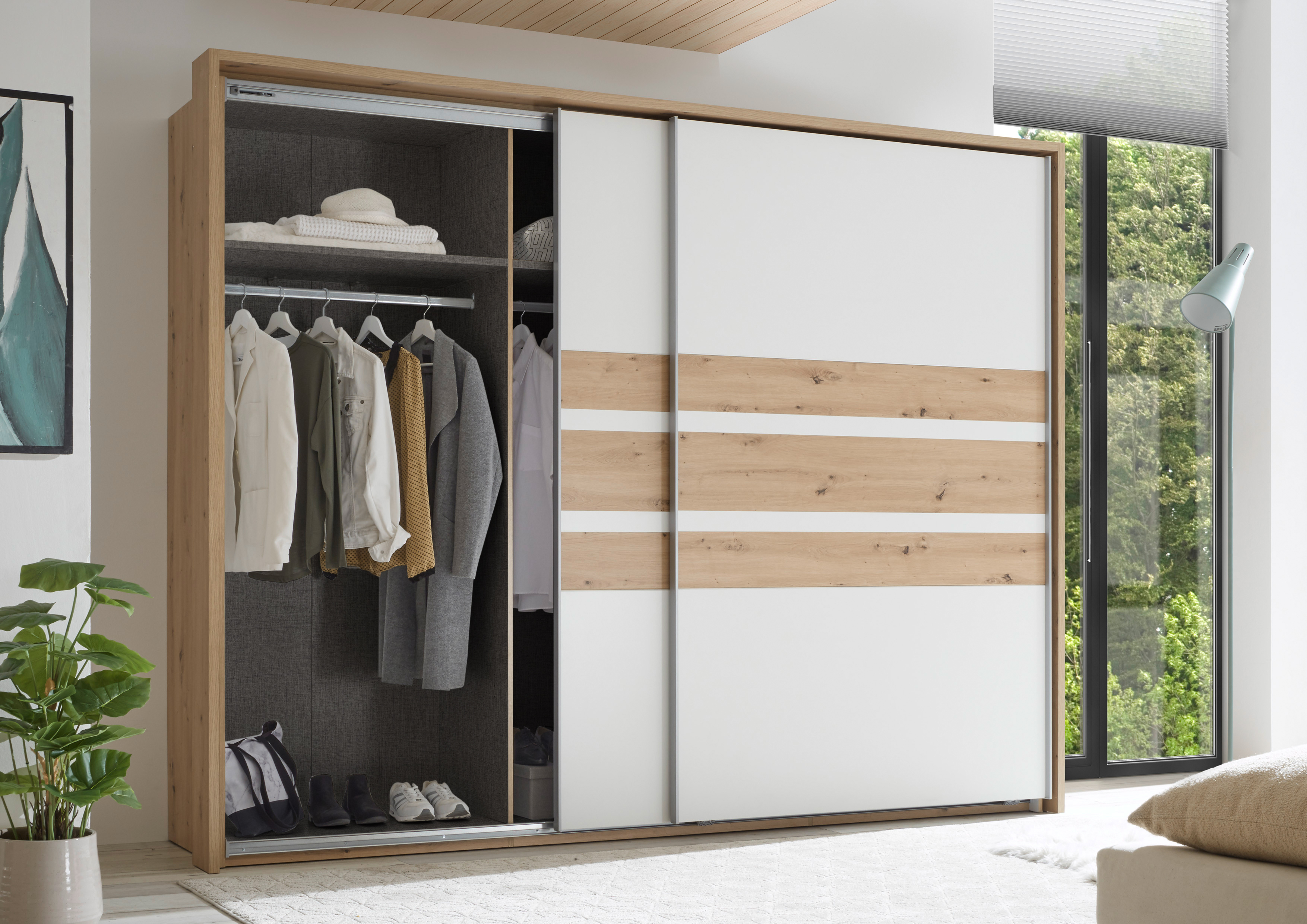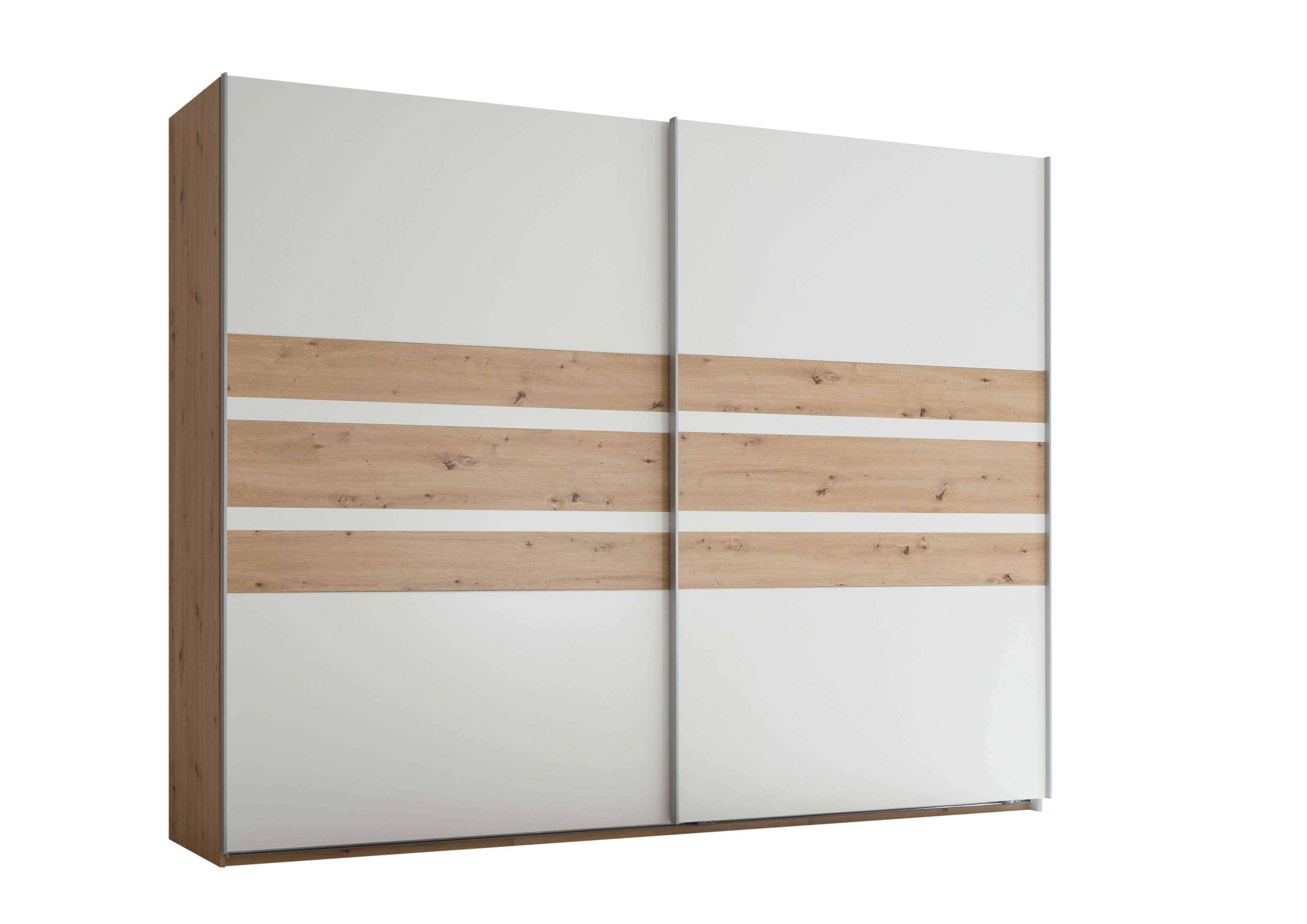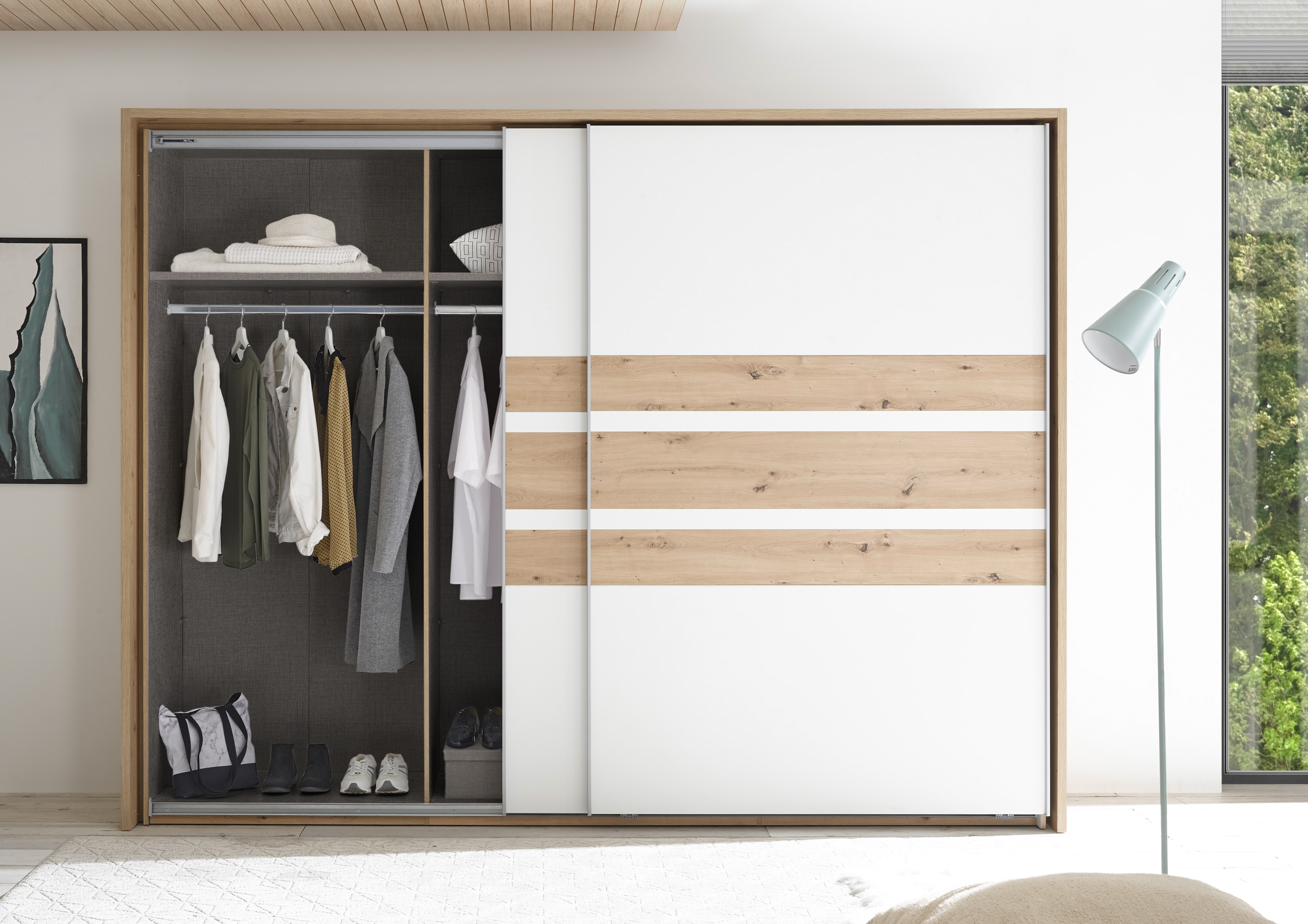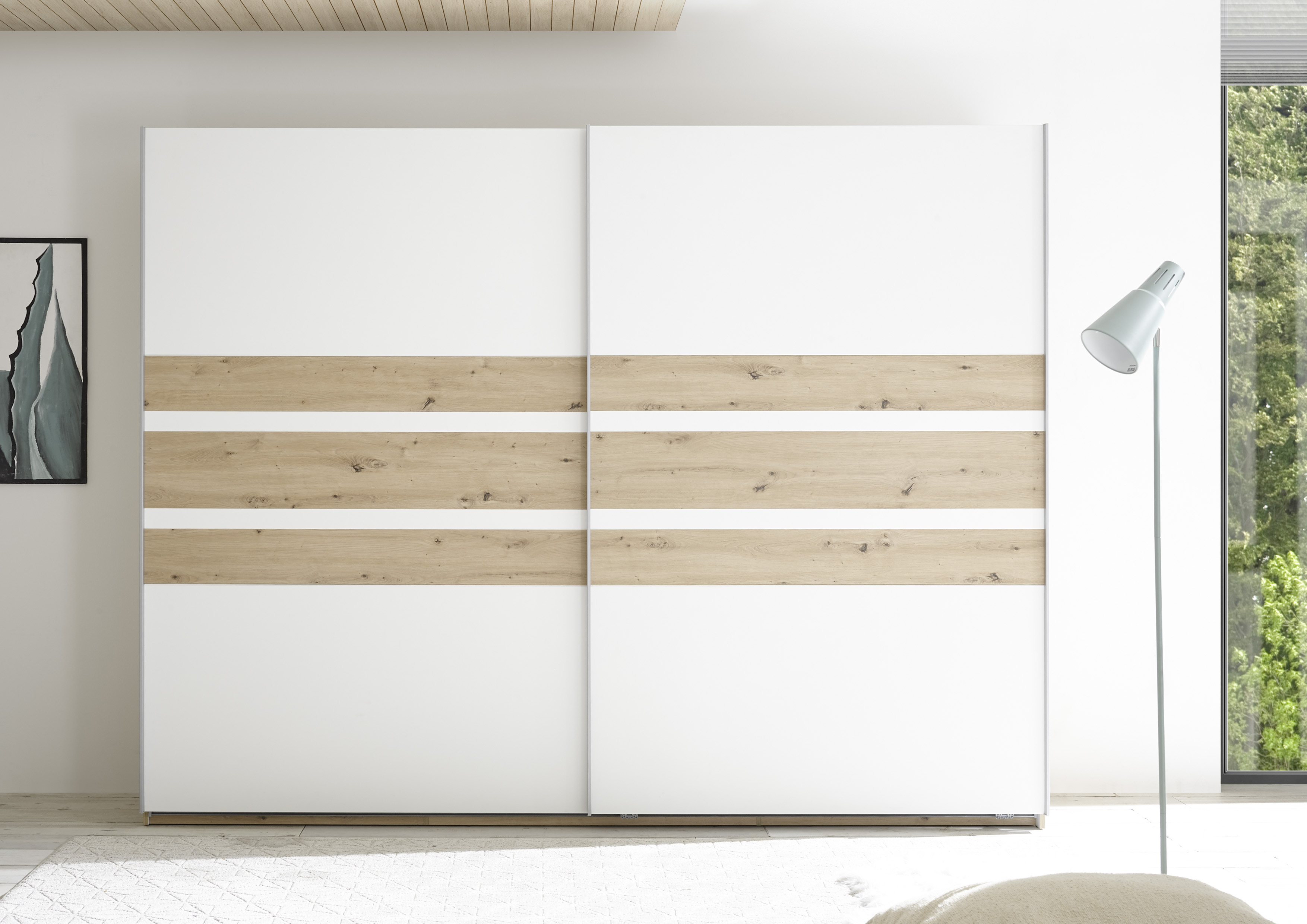 Offrez à votre chambre à coucher une touche d'élégance : armoire à portes coulissantes Corps en imitation chêne Artisan, façade en blanc/imitation chêne Artisan. L'imitation bois clair contrastant avec le blanc crée une atmosphère conviviale et lumineuse.