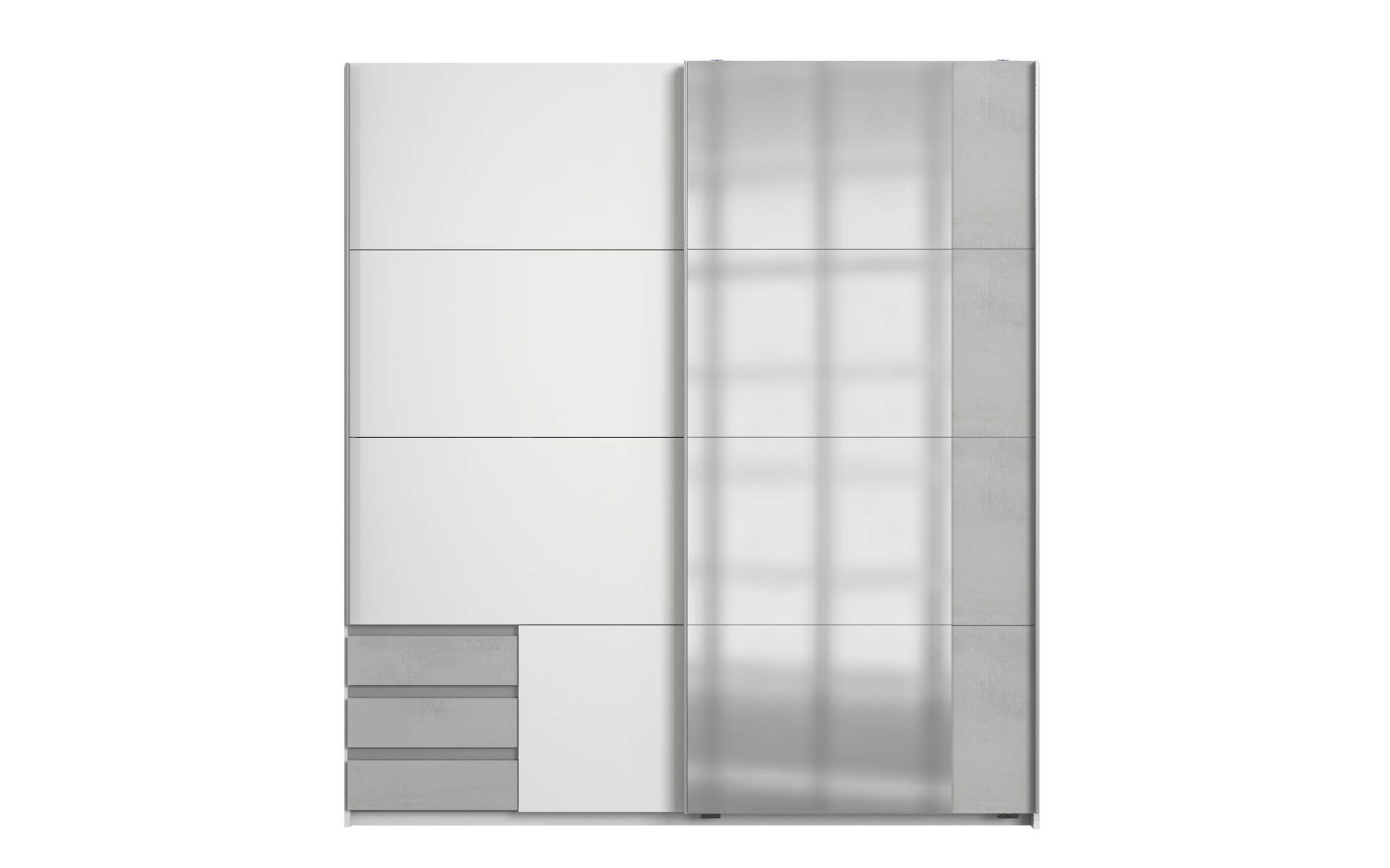 Ton blanc et contrastes (porte de droite et tiroirs) ton béton gris clair / miroir