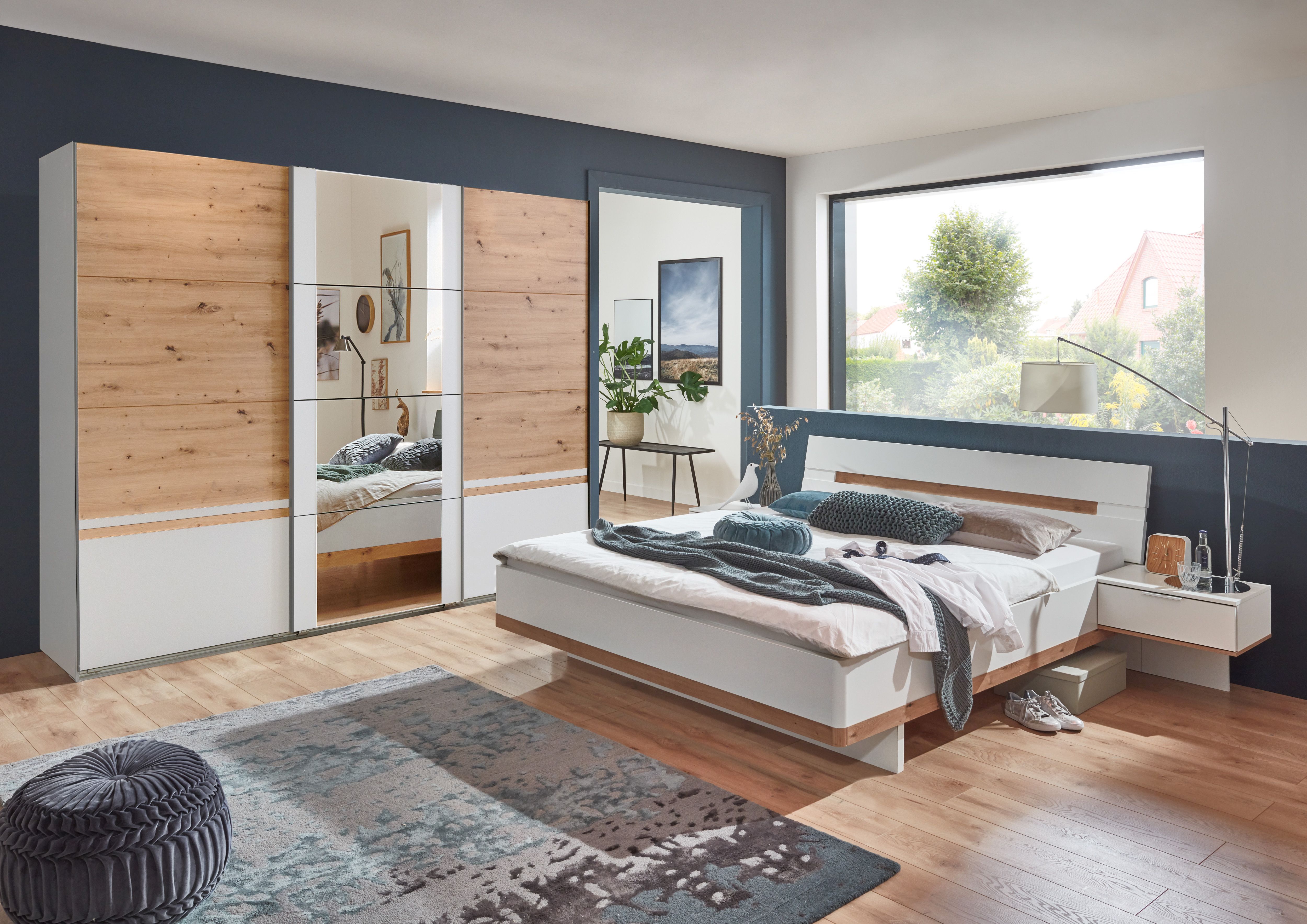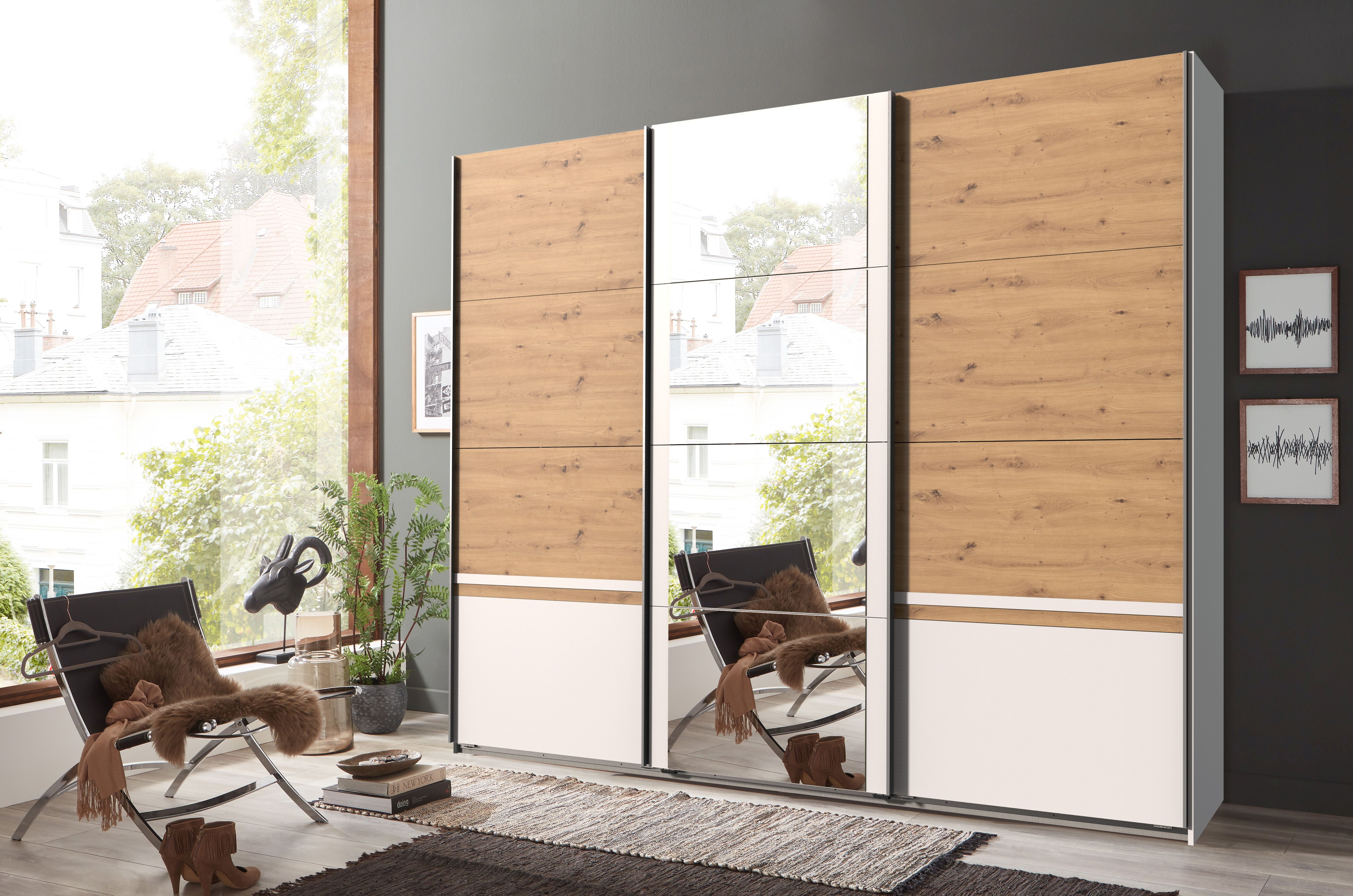 Caisson et façade : ton blanc avec contrastes décor chêne Artisan / miroir