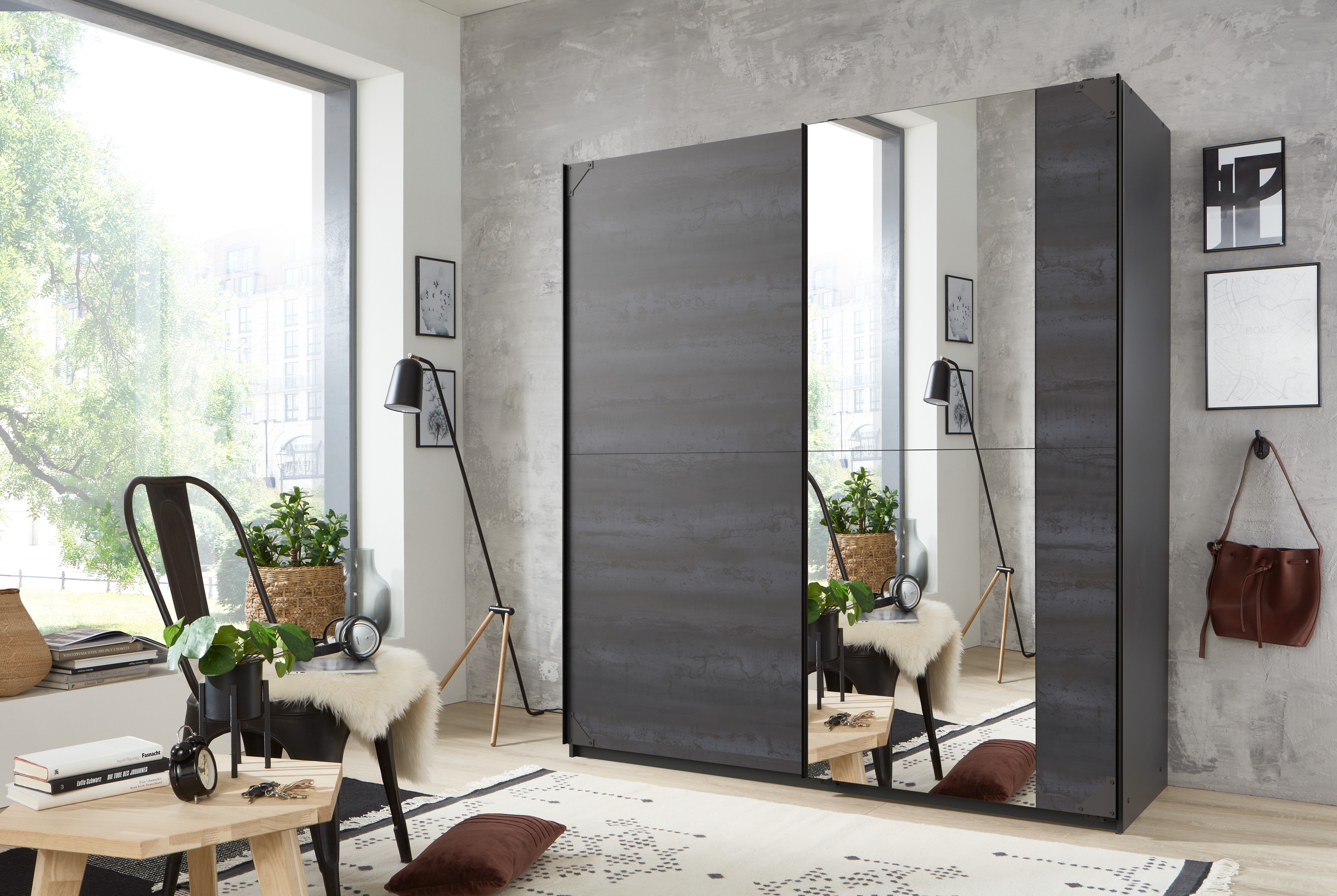 Cette armoire à portes coulissantes allie un espace de rangement fonctionnel à un look marquant de style industriel. Le corps en graphite est rehaussé par des façades à l'aspect Digi-Steel avec des contrastes assortis, conférant à la chambre à coucher un aspect moderne. Derrière ses deux portes coulissantes – dont l'une est miroitée –, l'armoire offre suffisamment d'espace pour les vêtements et les accessoires. Deux étagères et deux tringles permettent un rangement clair et organisé. Avec un poids d'environ 136 kg, l'armoire est stable et solide. Une solution pratique et économique pour tous ceux qui accordent de l'importance à l'espace de rangement et à un design épuré.