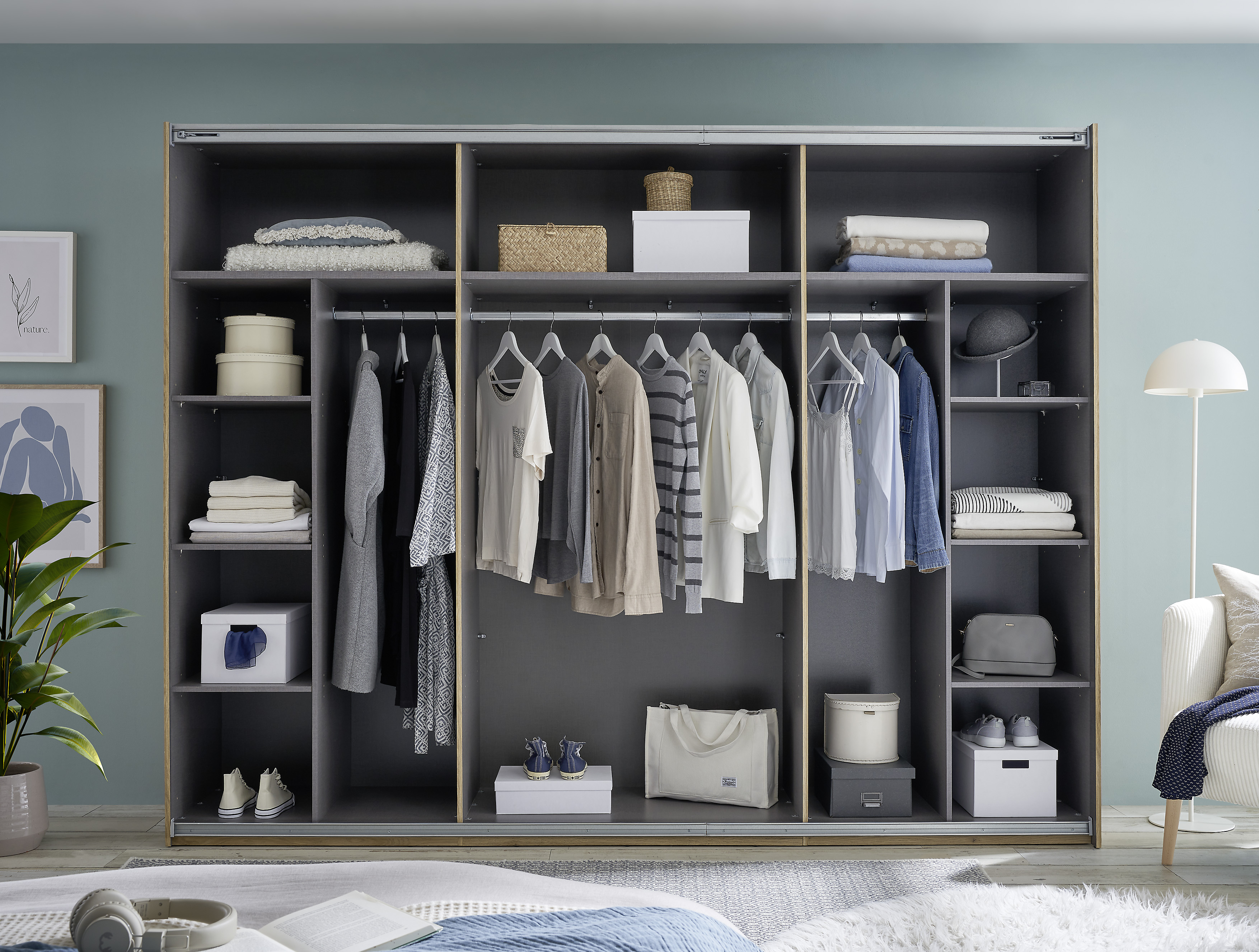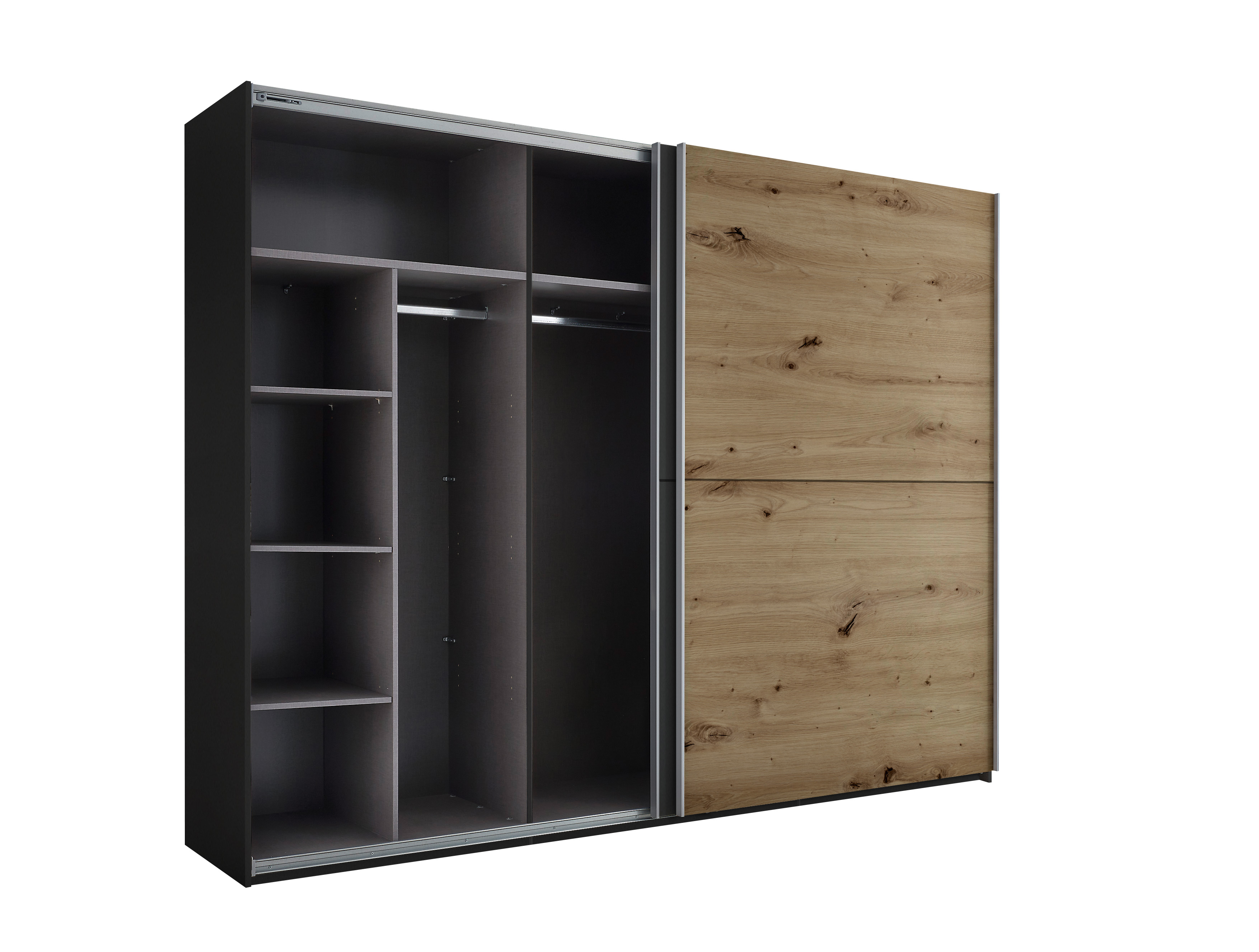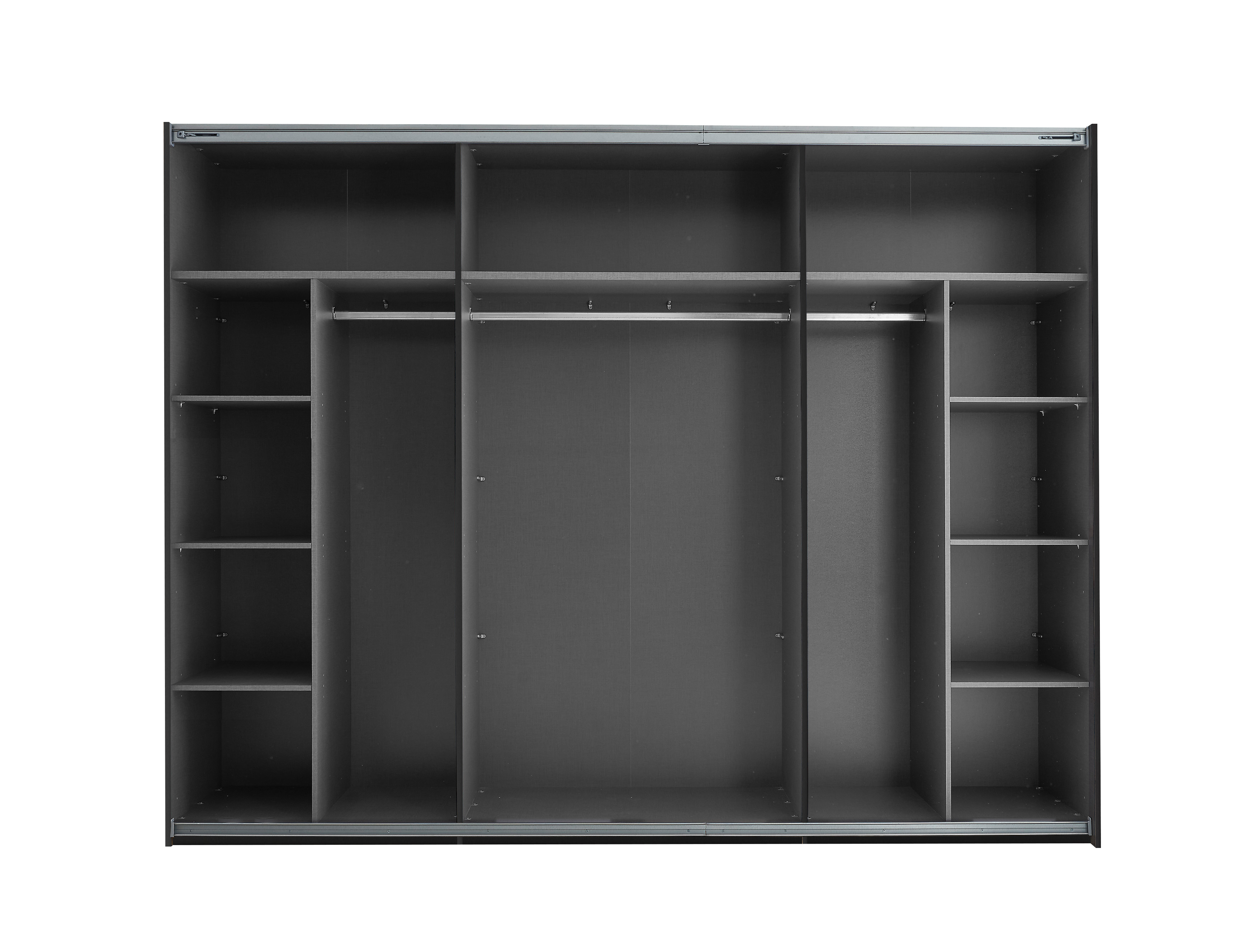 Répartition intérieure : 2 parois médianes, à gauche et à droite, à chaque fois 1 grande tablette, 3 petites tablettes et 1 barre de penderie avec, au centre, 1 tablette et 1 barre de penderie