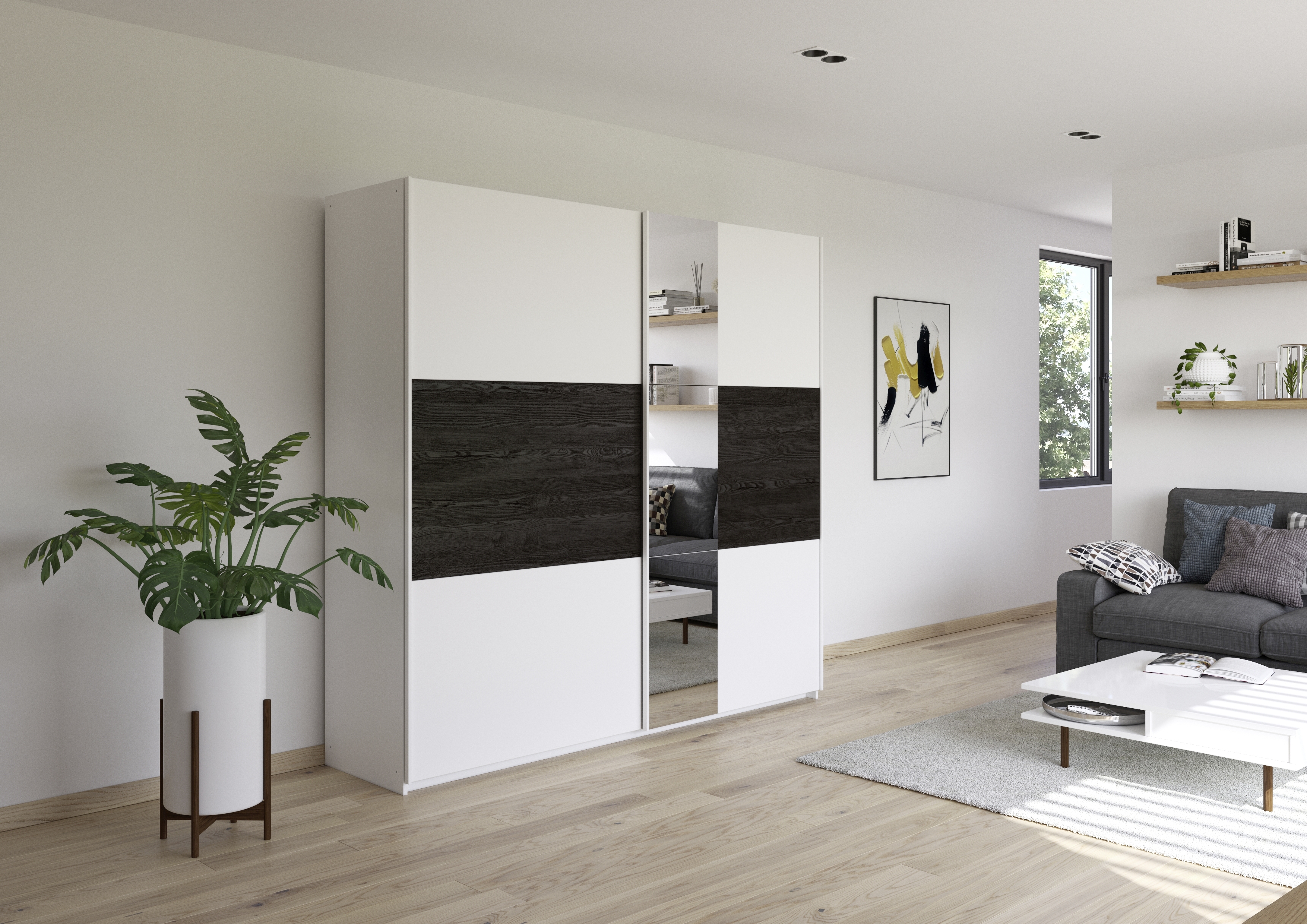 Façade et caisson : ton blanc alpin avec contrastes décor chêne noir