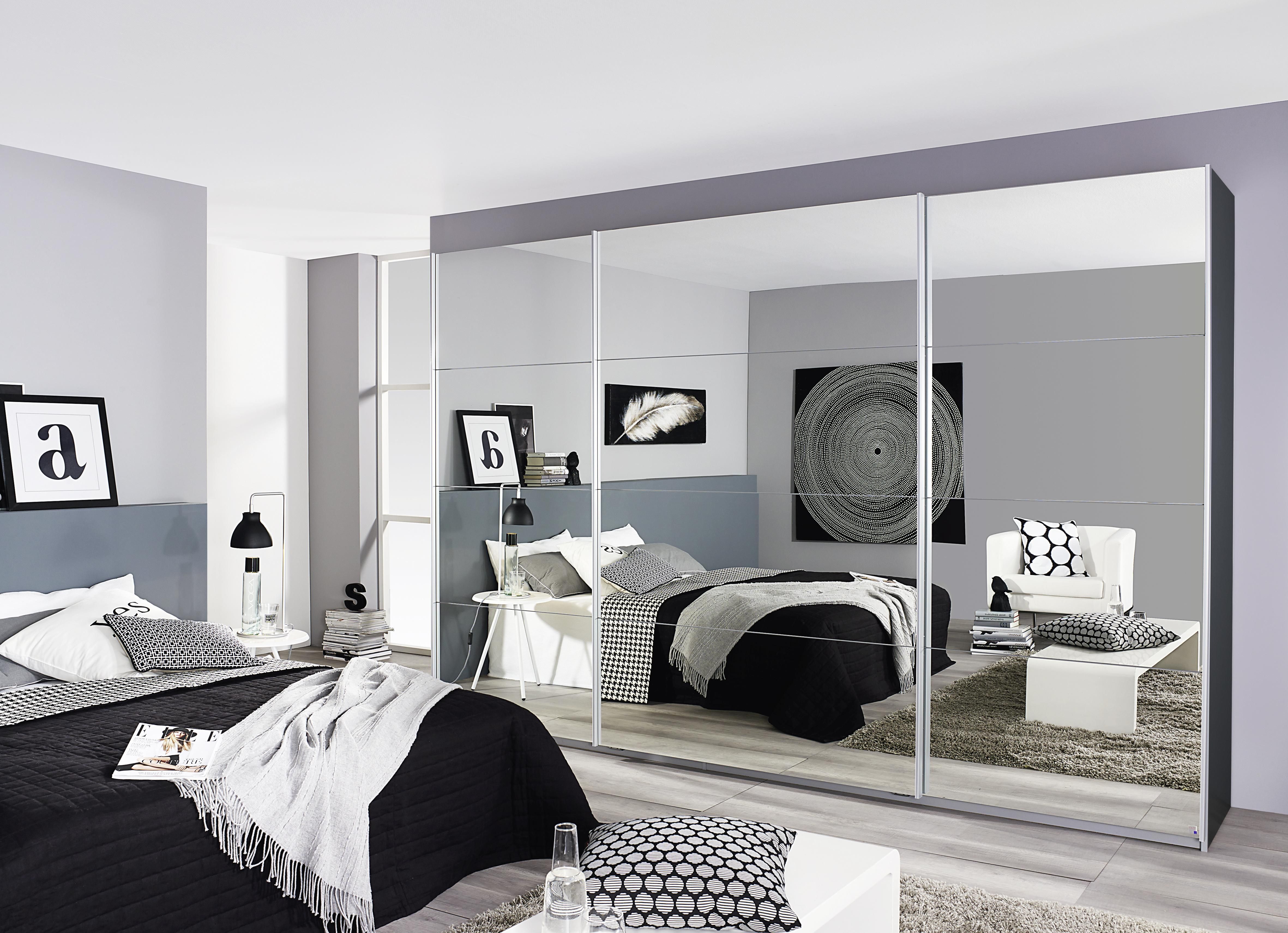 Les armoires à portes coulissantes de la marque Rauch, comme le modèle QUADRA avec son caisson ton gris métallisé, remportent un vif succès, et pour cause : cette armoire à portes coulissantes avec miroir intégral dispose non seulement d'un design soigné de haute qualité, mais offrira également un espace considérable à votre chambre à coucher pour accueillir, entre autres, un grand dressing, vos accessoires et vos chaussures. Enfin, l’espace de rangement peut être rempli sur une largeur de 3,15 m. Ultra pratique : les portes coulissantes avec miroir intégral s’ouvrent facilement et représentent un véritable gain de place - idéal pour les pièces étroites.