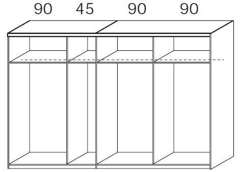- Un espace de rangement en 4 parties : 3 compartiments de 90 cm et 1 compartiment de 45 cm