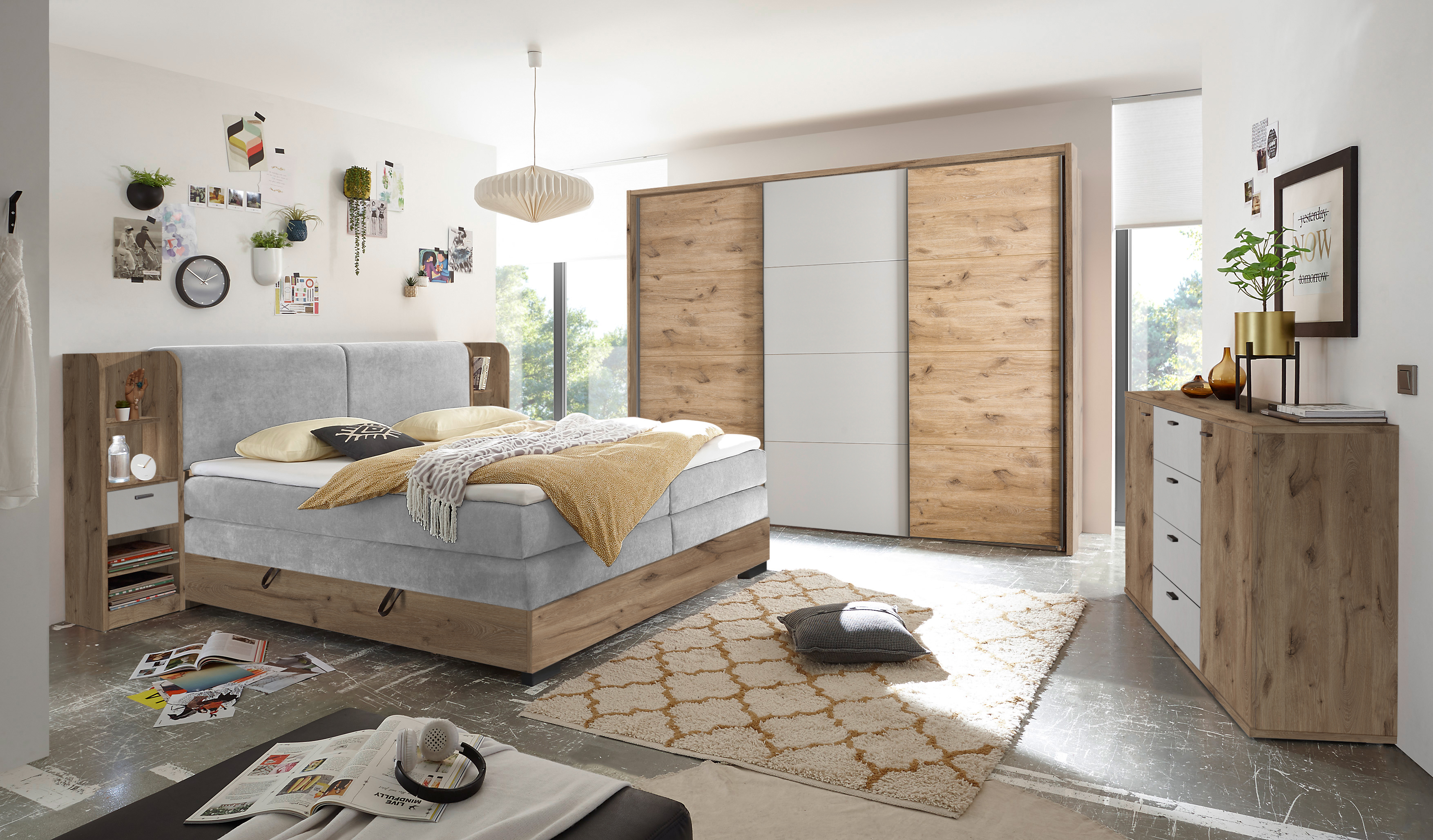 Offrez à votre chambre à coucher une transformation élégante : armoire à portes coulissantes en imitation bois Viking Oak clair, façade également en Viking Oak clair, avec contrastes Ash Grey. La combinaison harmonieuse des couleurs s'adapte à différents styles d'aménagement.