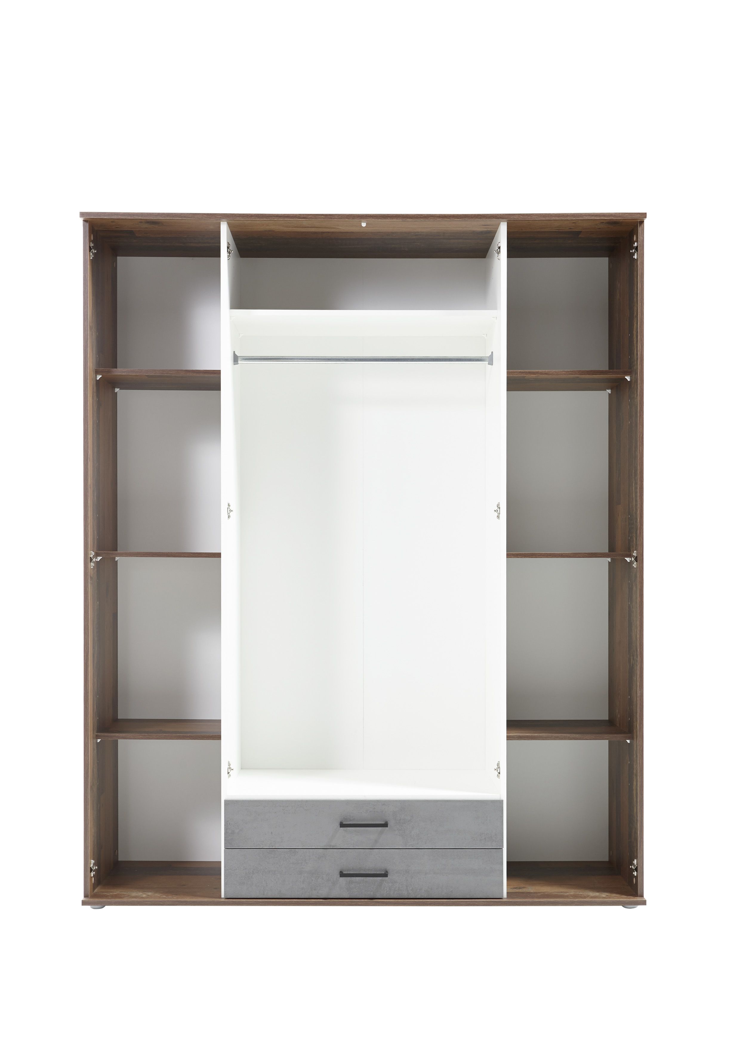 Répartition intérieure : 2 parois médianes ; à gauche et à droite, à chaque fois, 3 tablettes ; au centre : 1 tablette et 1 barre de penderie