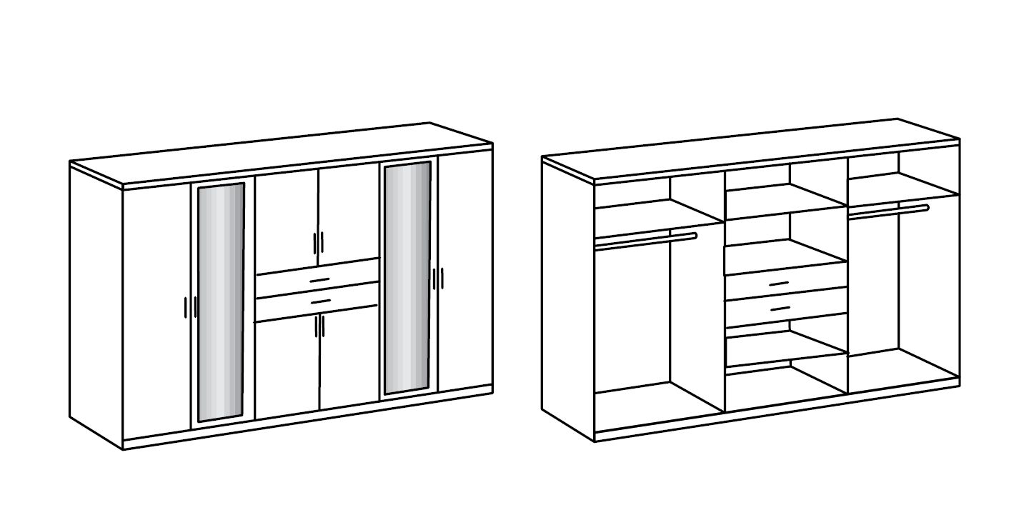 Ce modèle est une armoire spacieuse à portes battantes d'une largeur de 270 cm et d'une hauteur de 208 cm. Elle dispose de 8 portes, dont 2 portes avec des façades miroir. Les portes de l'armoire s'ouvrent et se ferment facilement à l'aide de poignées barres. À l'intérieur de l'armoire se trouvent 4 tablettes, 2 barres de penderie et 2 tiroirs. L'équipement de l'armoire comprend donc tout ce dont vous avez besoin pour vos vêtements et accessoires.