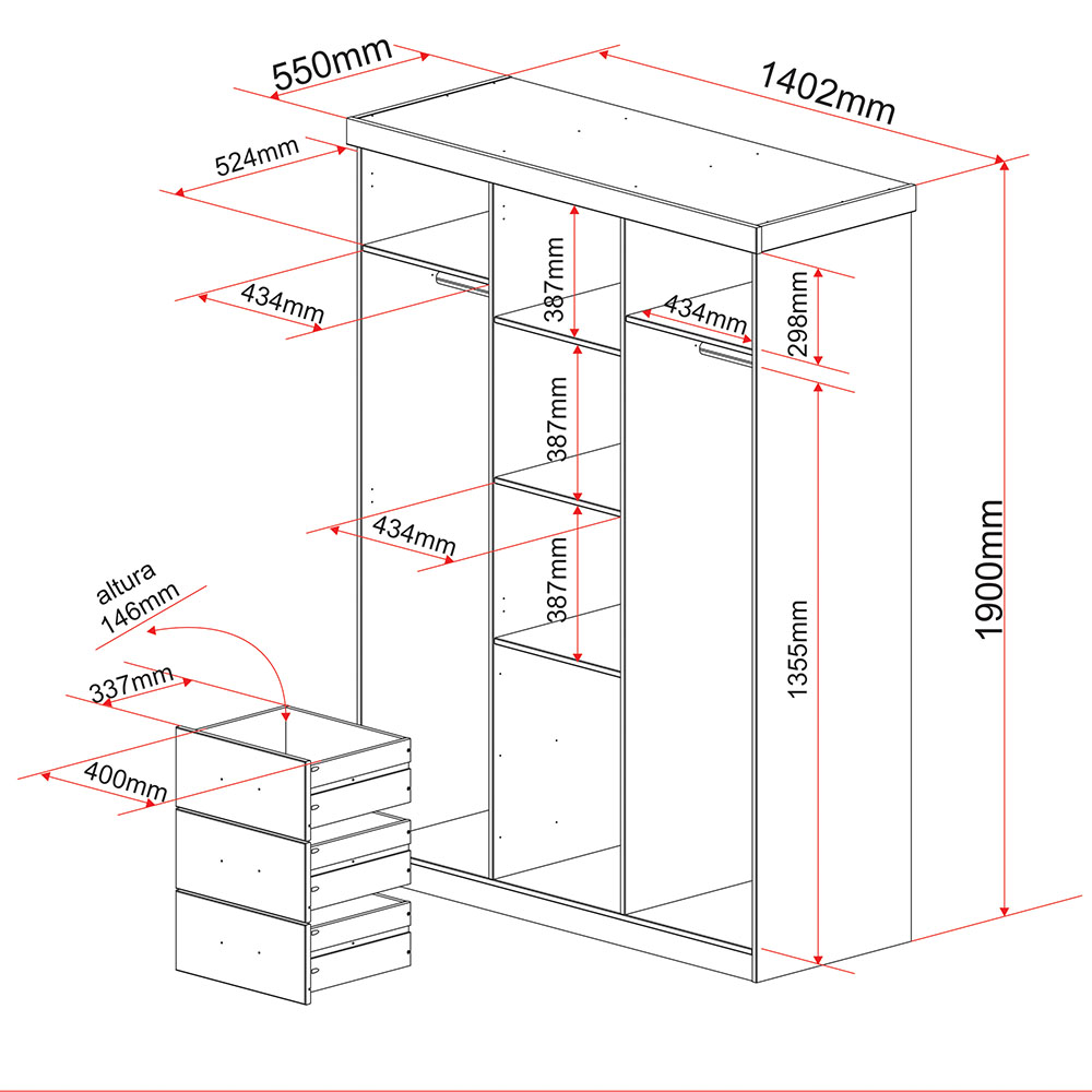 - Grande armoire avec trois portes, trois tiroirs et un miroir. Grâce à sa disposition intérieure, cette armoire offre beaucoup de place de rangement pour les vêtements et les accessoires.
