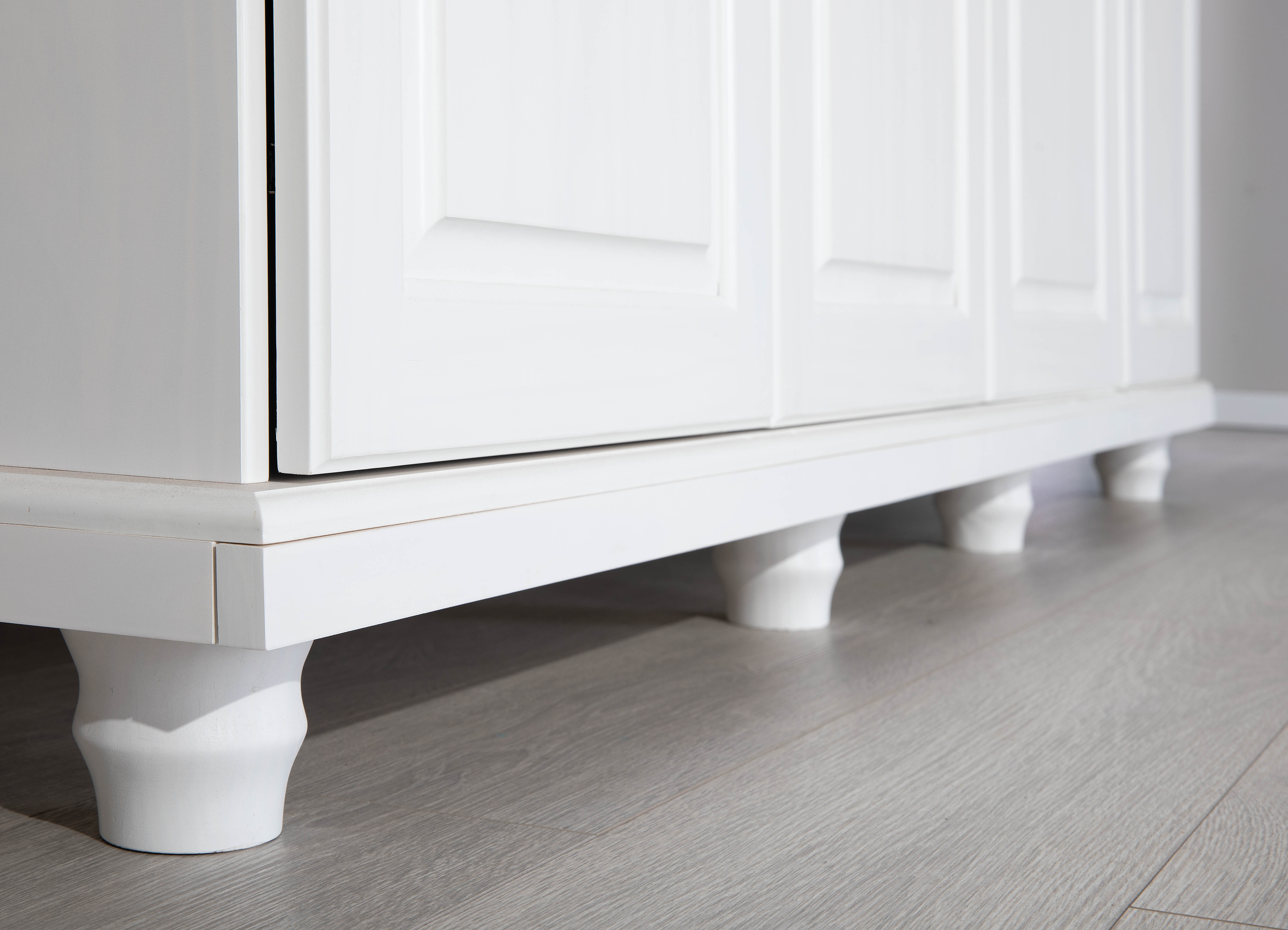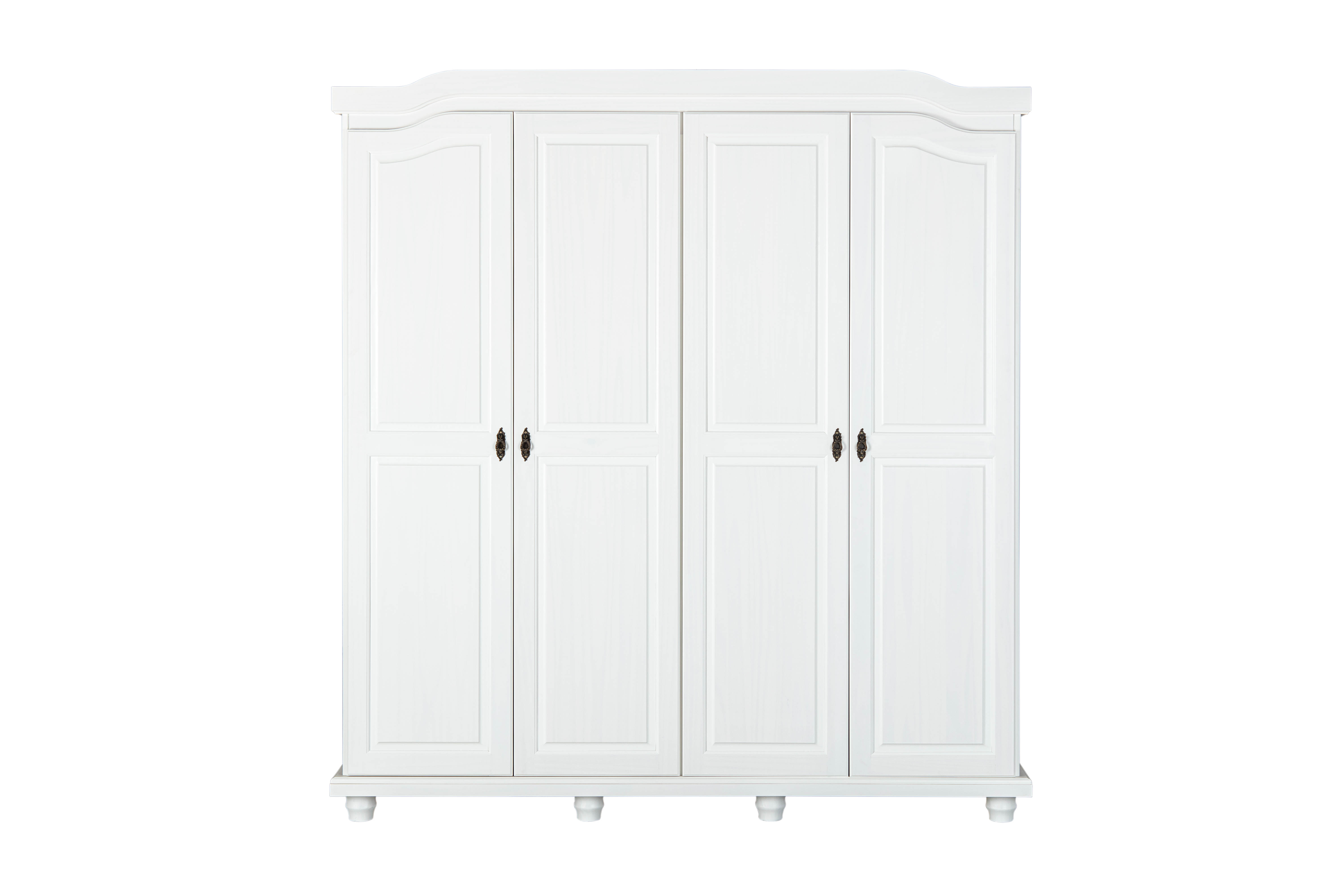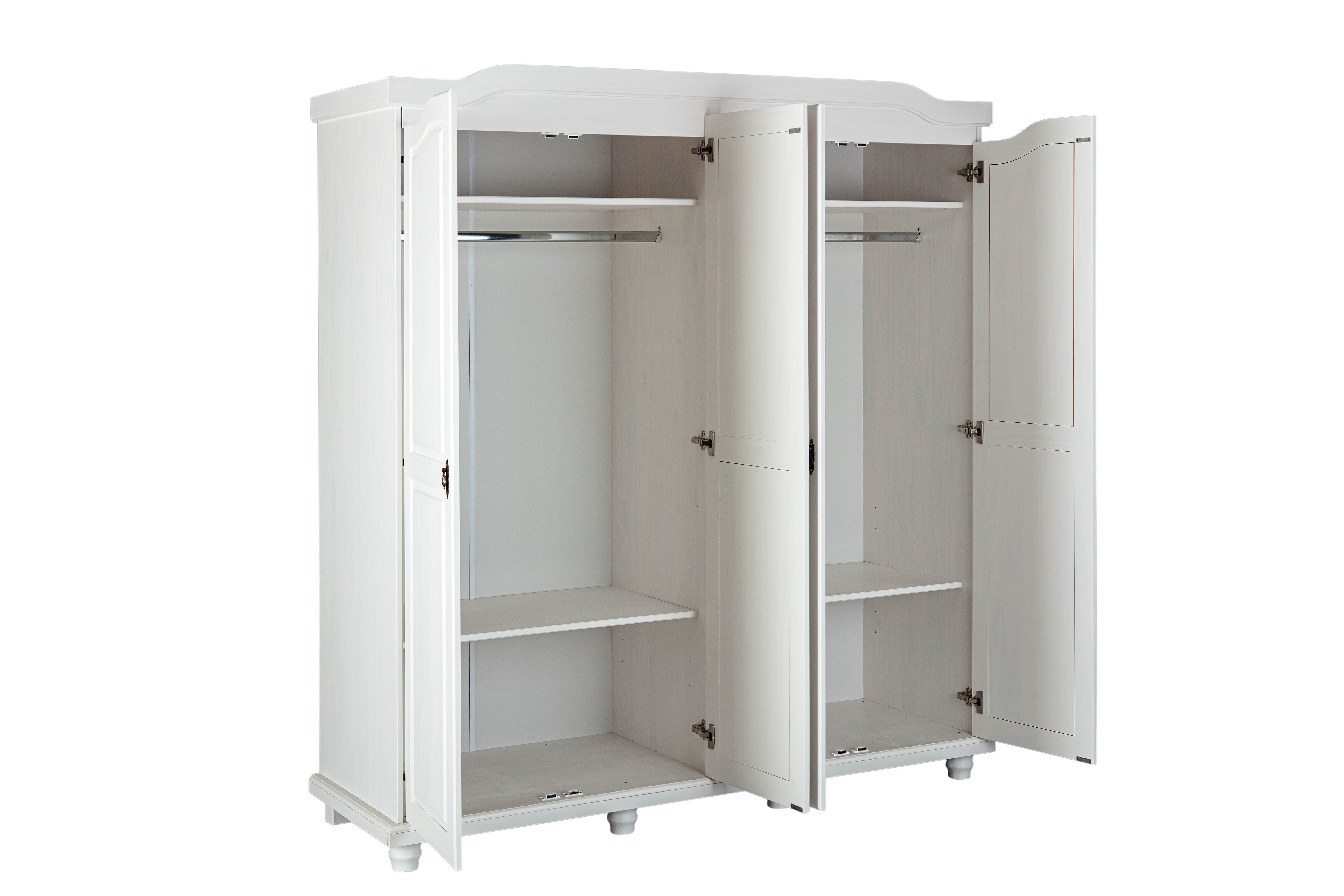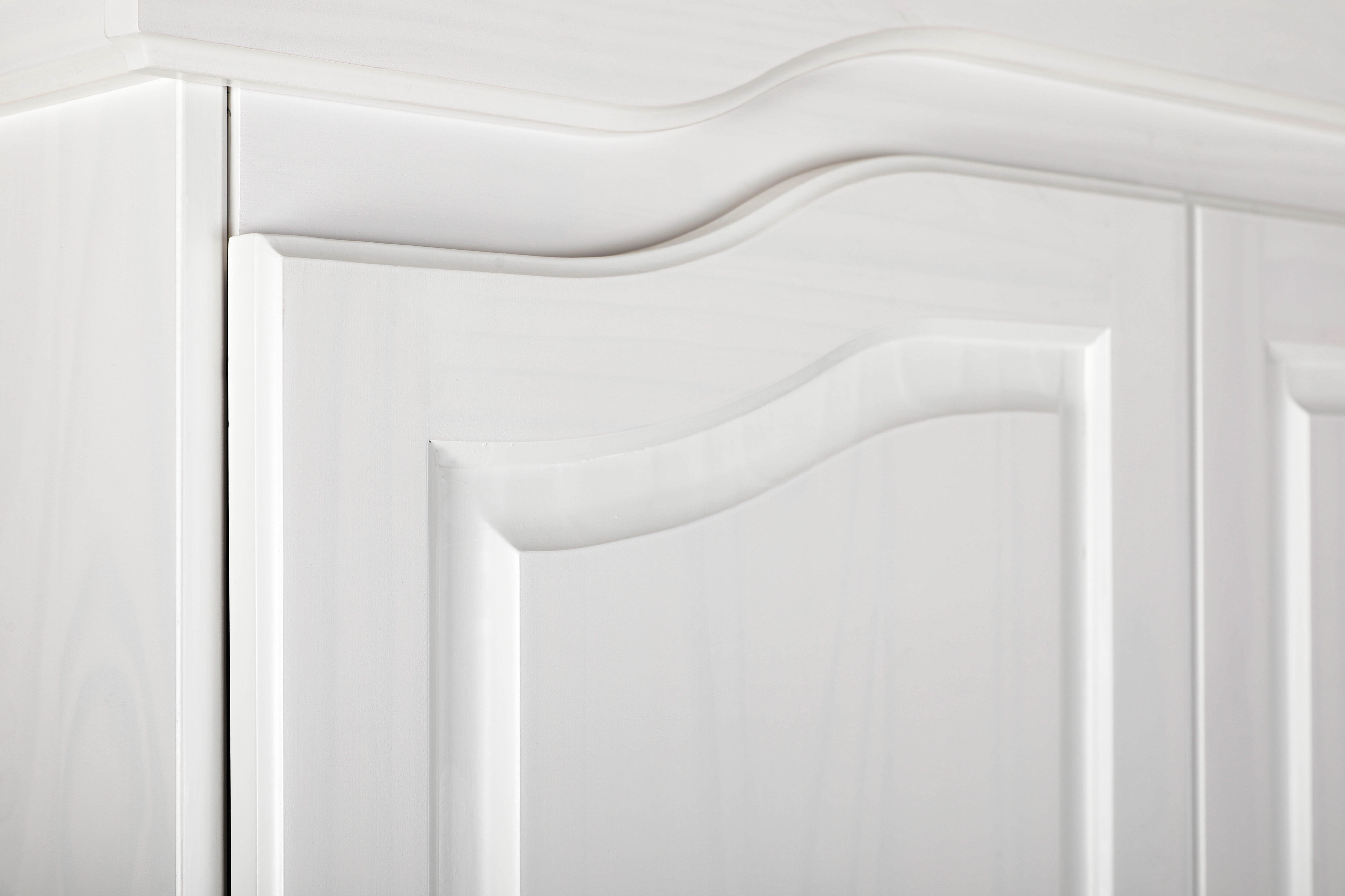 La finition blanche transparente de l’armoire 4 portes laisse apparaître les veines naturelles du bois massif.