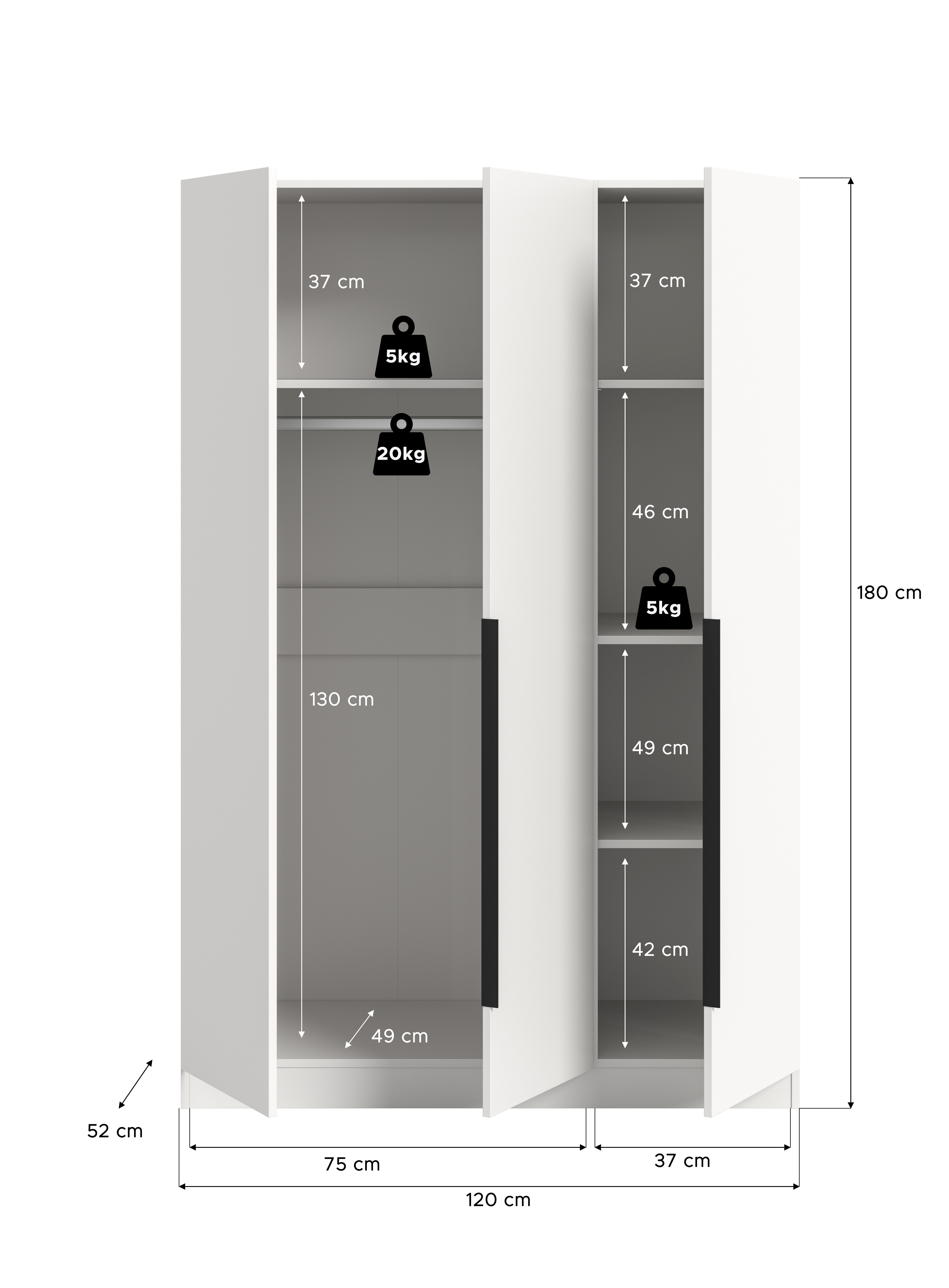 Cette armoire 3 portes est la solution idéale pour ranger vos vêtements de façon stylée et faire régner l’ordre dans votre intérieur. Imaginez le confort de trouver rapidement la tenue qu’il vous faut chaque matin en gardant une vue d’ensemble claire : une sensation de légèreté qui simplifie le quotidien. Avec son design moderne, cette armoire s’intègre élégamment dans toutes les pièces et séduit par sa fabrication de qualité. La barre de penderie pratique offre un suffisamment de place pour suspendre vos vêtements préférés, tandis que les tablettes amovibles permettent de ranger les vêtements pliés ou les accessoires. Les surfaces faciles d’entretien se nettoient en un clin d’œil pour que votre armoire conserve son bel aspect pendant longtemps.