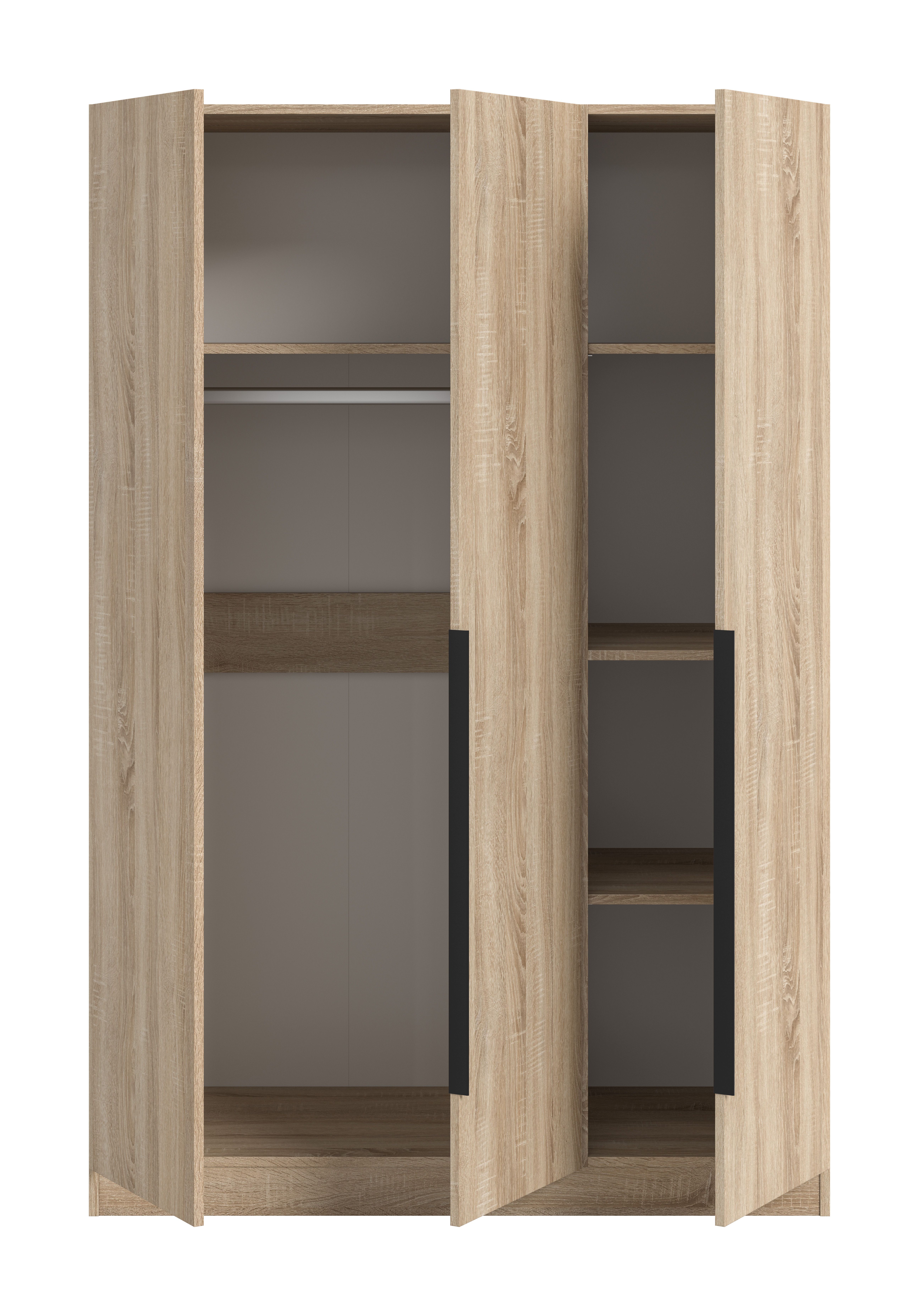Cette armoire 3 portes est la solution idéale pour ranger vos vêtements de façon stylée et faire régner l’ordre dans votre intérieur. Imaginez le confort de trouver rapidement la tenue qu’il vous faut chaque matin en gardant une vue d’ensemble claire : une sensation de légèreté qui simplifie le quotidien. Avec son design moderne, cette armoire s’intègre élégamment dans toutes les pièces et séduit par sa fabrication de qualité. La barre de penderie pratique offre un suffisamment de place pour suspendre vos vêtements préférés, tandis que les tablettes amovibles permettent de ranger les vêtements pliés ou les accessoires. Les surfaces faciles d’entretien se nettoient en un clin d’œil pour que votre armoire conserve son bel aspect pendant longtemps.