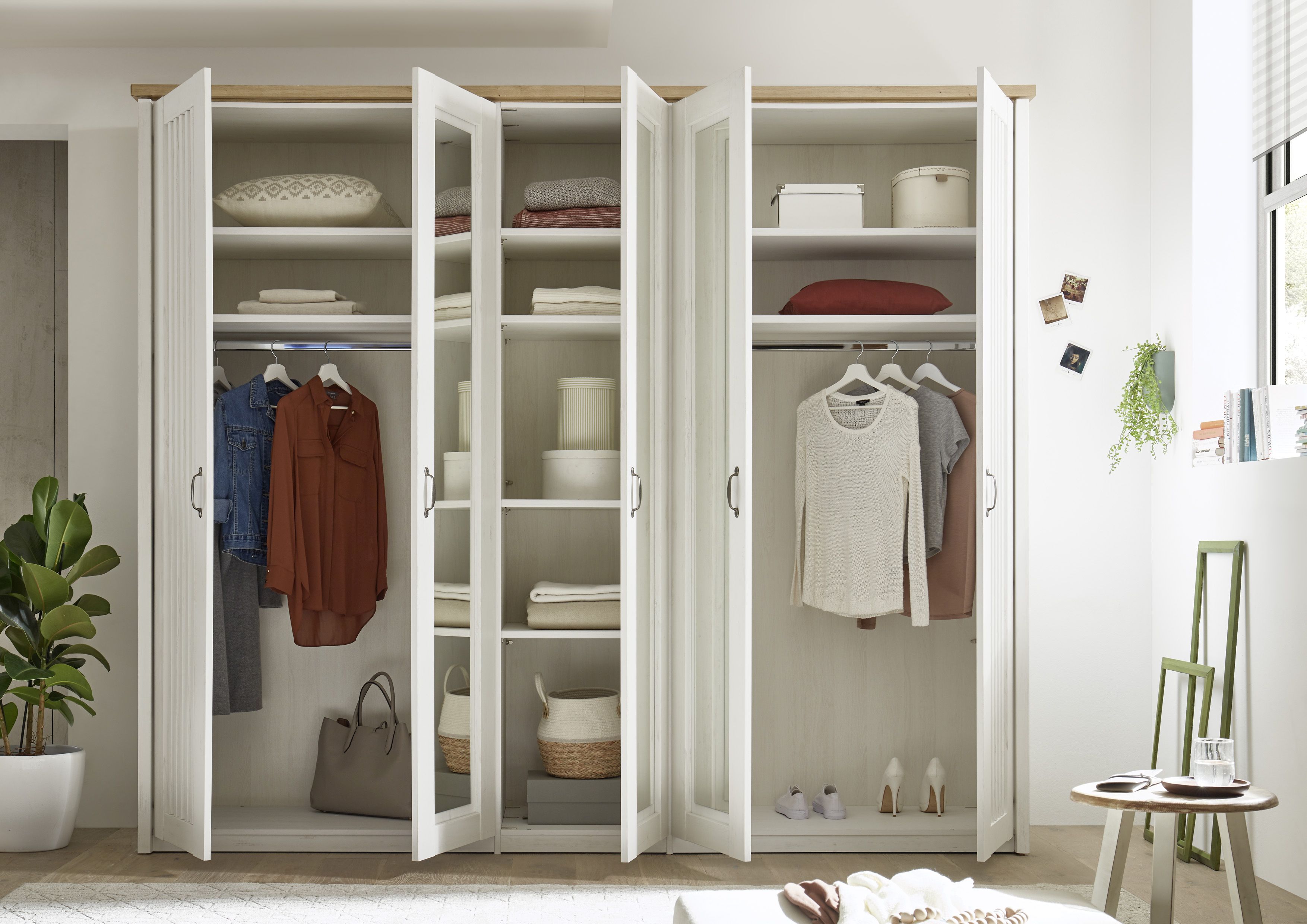 Répartition intérieure : 2 parois médianes et, pour chaque compartiment à gauche et à droite, 2 tablettes et 1 barre de penderie ; au centre : 4 tablettes