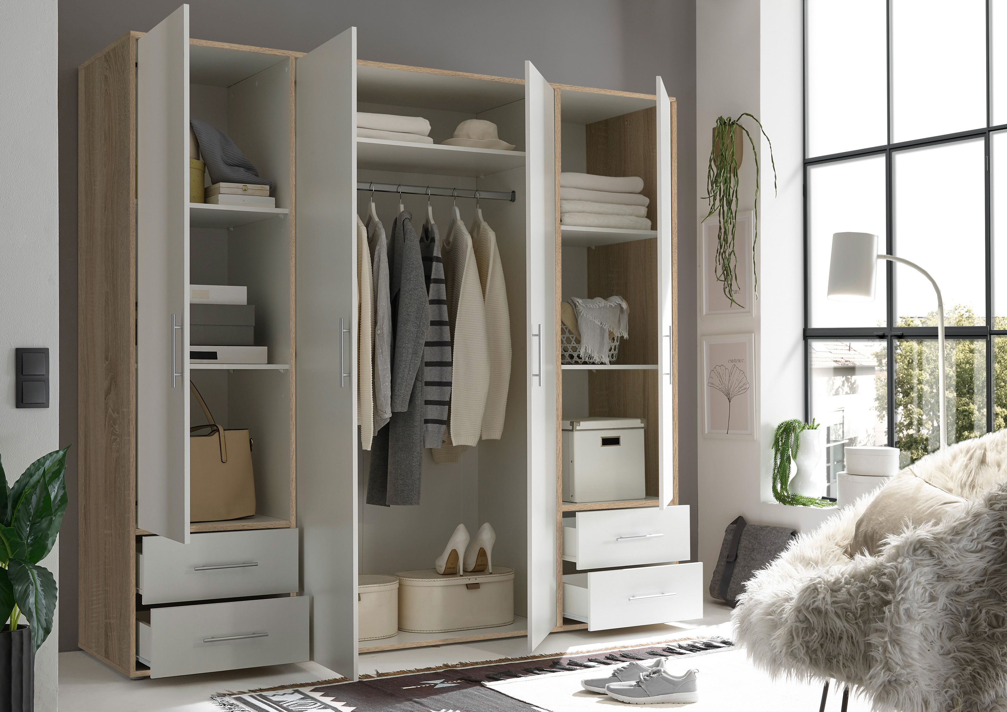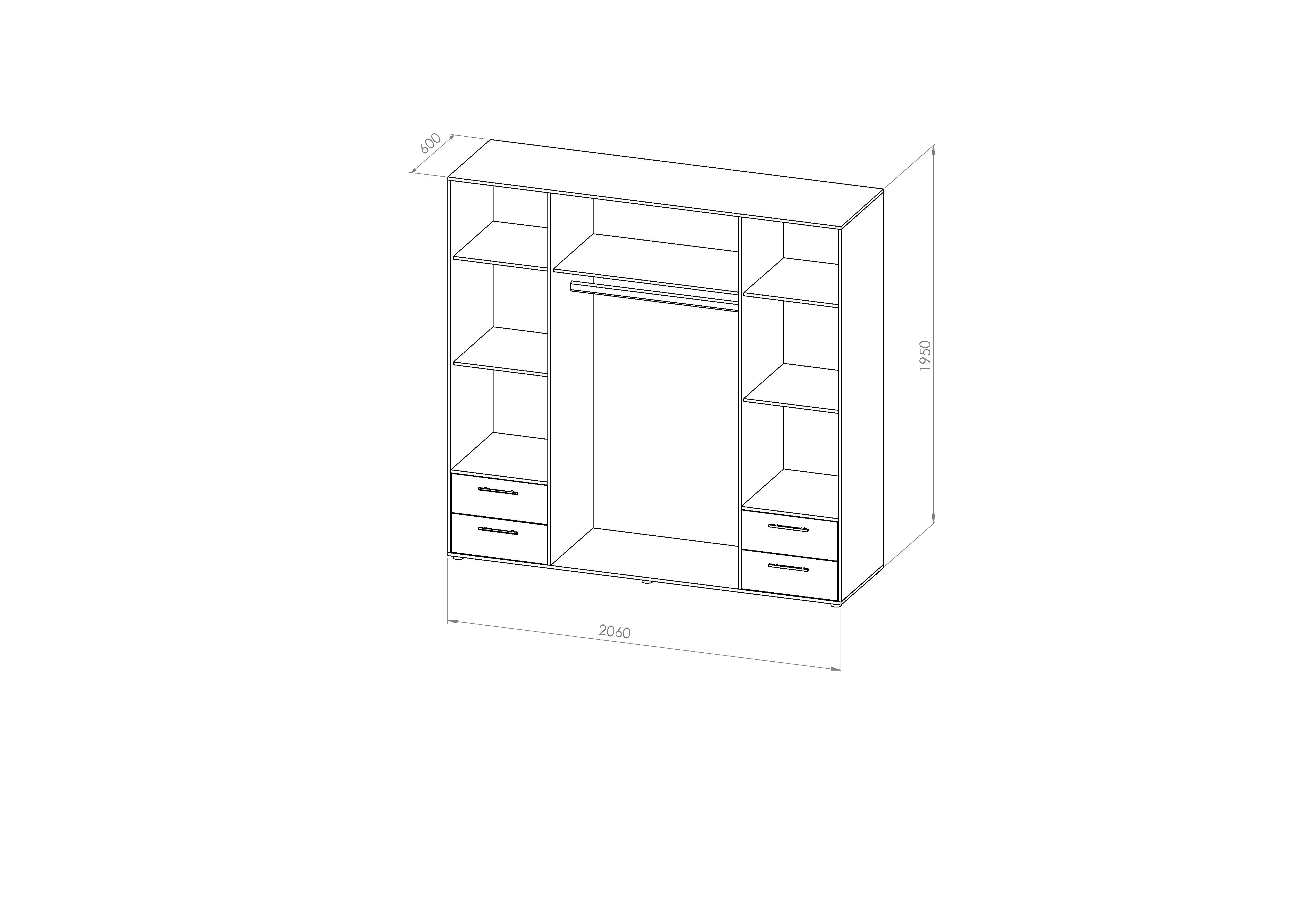Répartition intérieure : 2 parois médianes ; à gauche et à droite : 2 tablettes ; au centre : 1 tablette et 1 barre de penderie
