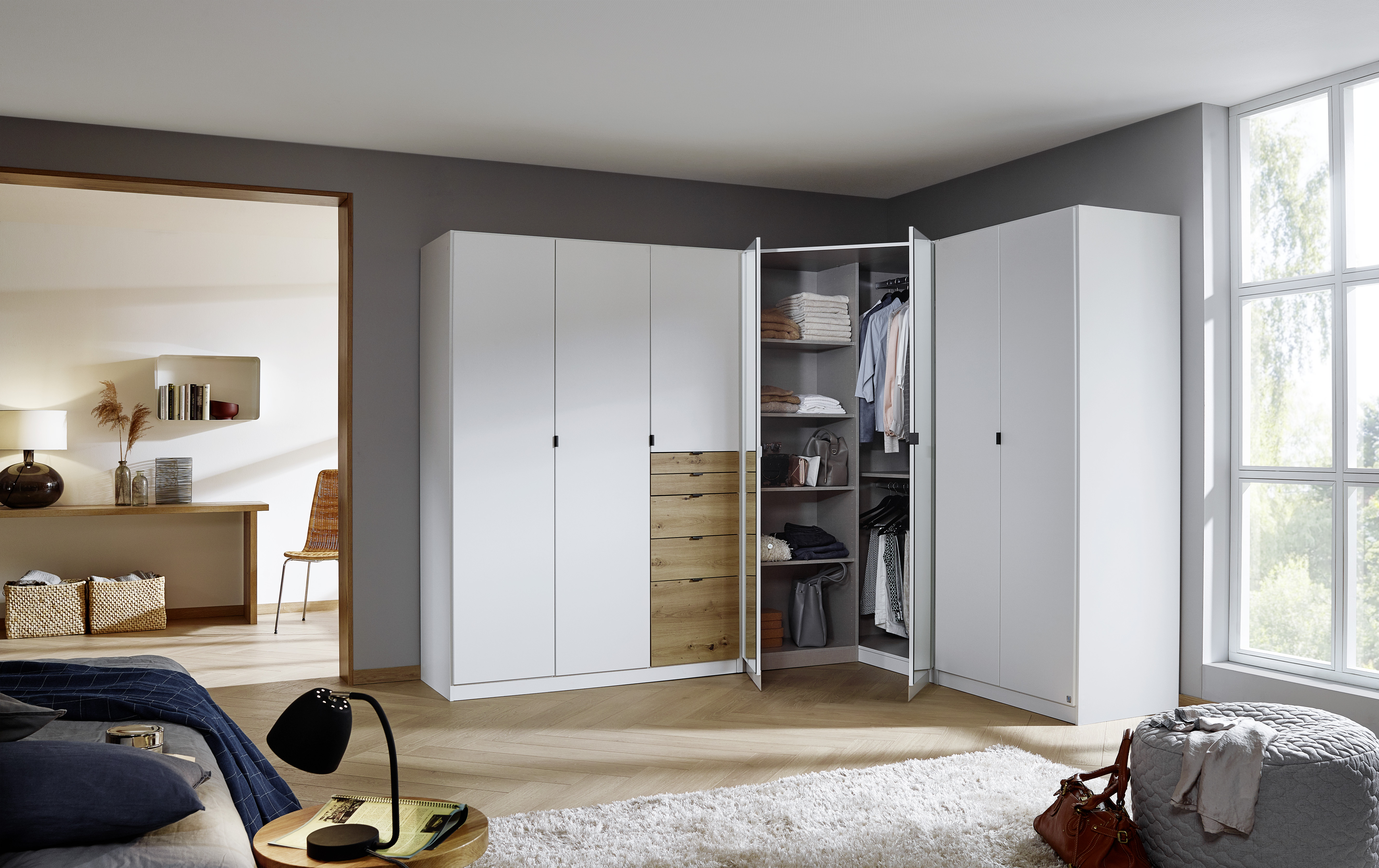 1 armoire à portes battantes (3 portes, 5 tiroirs), 1 armoire d’angle à portes battantes et 1 armoire à portes battantes (2 portes)
