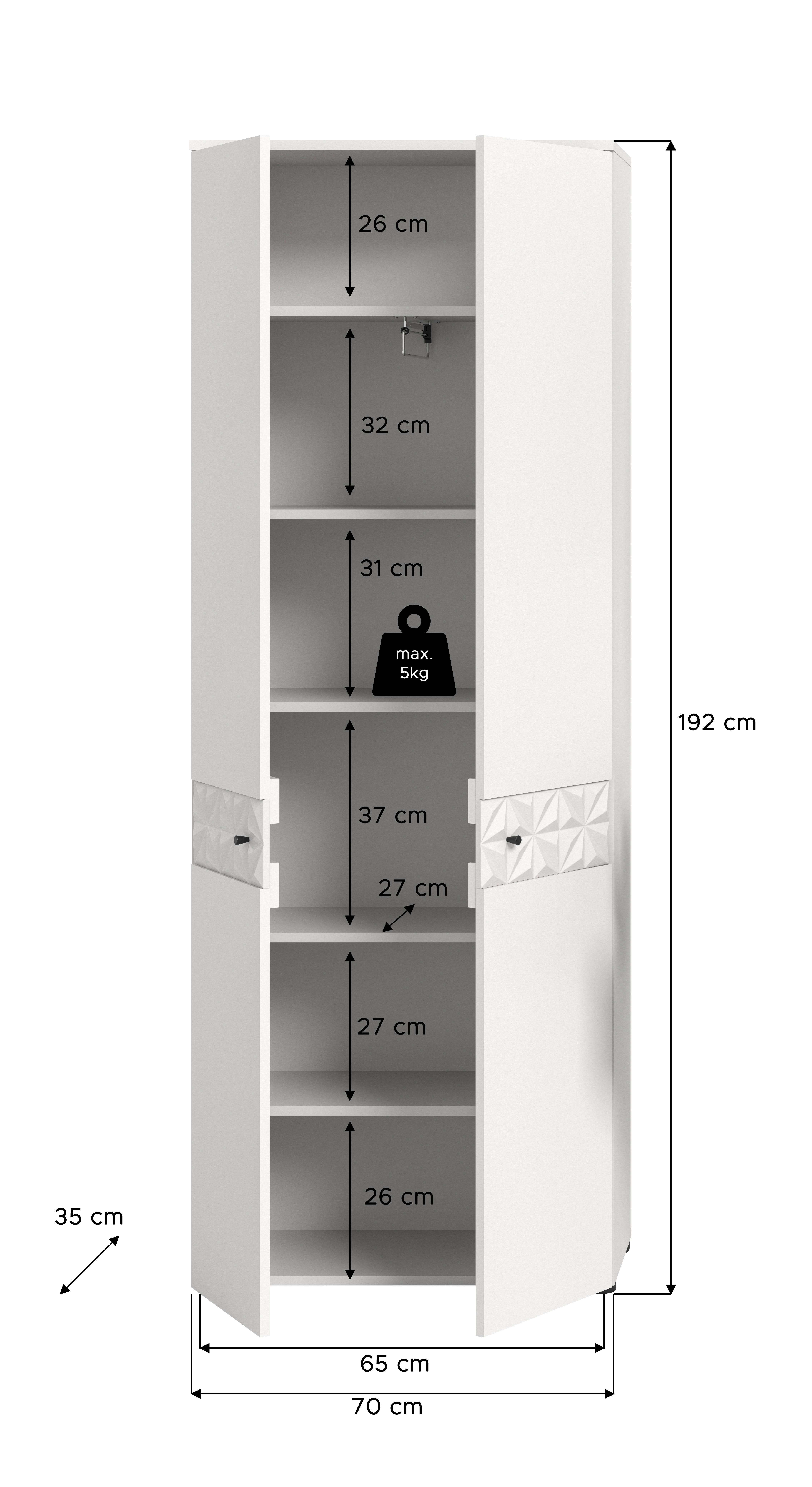 • Utilisation : spécialement conçue pour le couloir ou l’entrée, cette armoire constitue une solution fonctionnelle pour organiser les vêtements et optimiser l’espace disponible.
