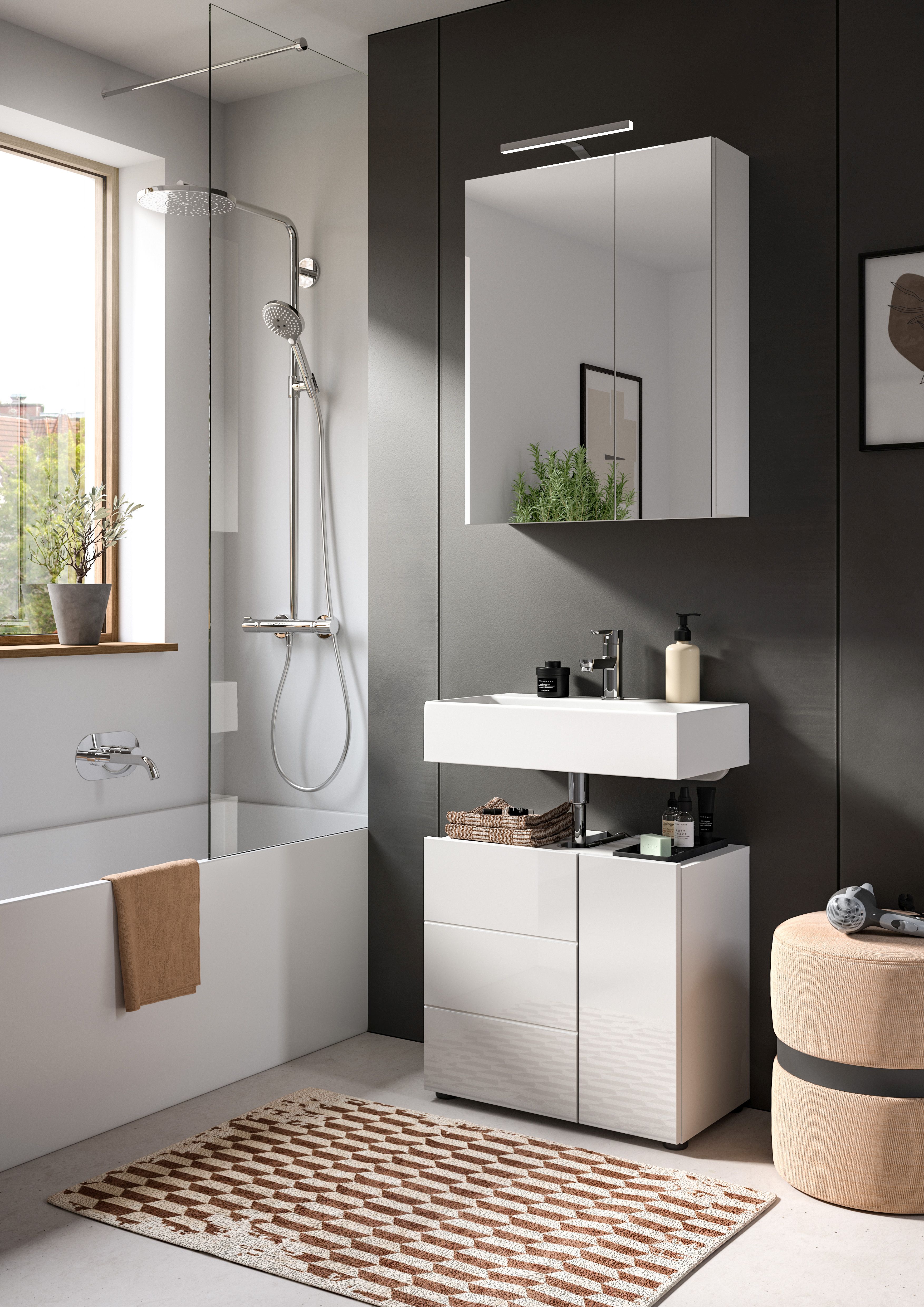 - Fonctionnalité : l’armoire de toilette n’offre pas seulement un espace de rangement pratique pour les médicaments, le maquillage et les accessoires de bain ; elle dispose également d’un miroir intégré pour le rituel beauté au quotidien. Le miroir et l’espace de rangement disponible dans l’armoire de toilette permettent à la fois d’économiser de la place et de faire régner l’ordre dans la salle de bains.