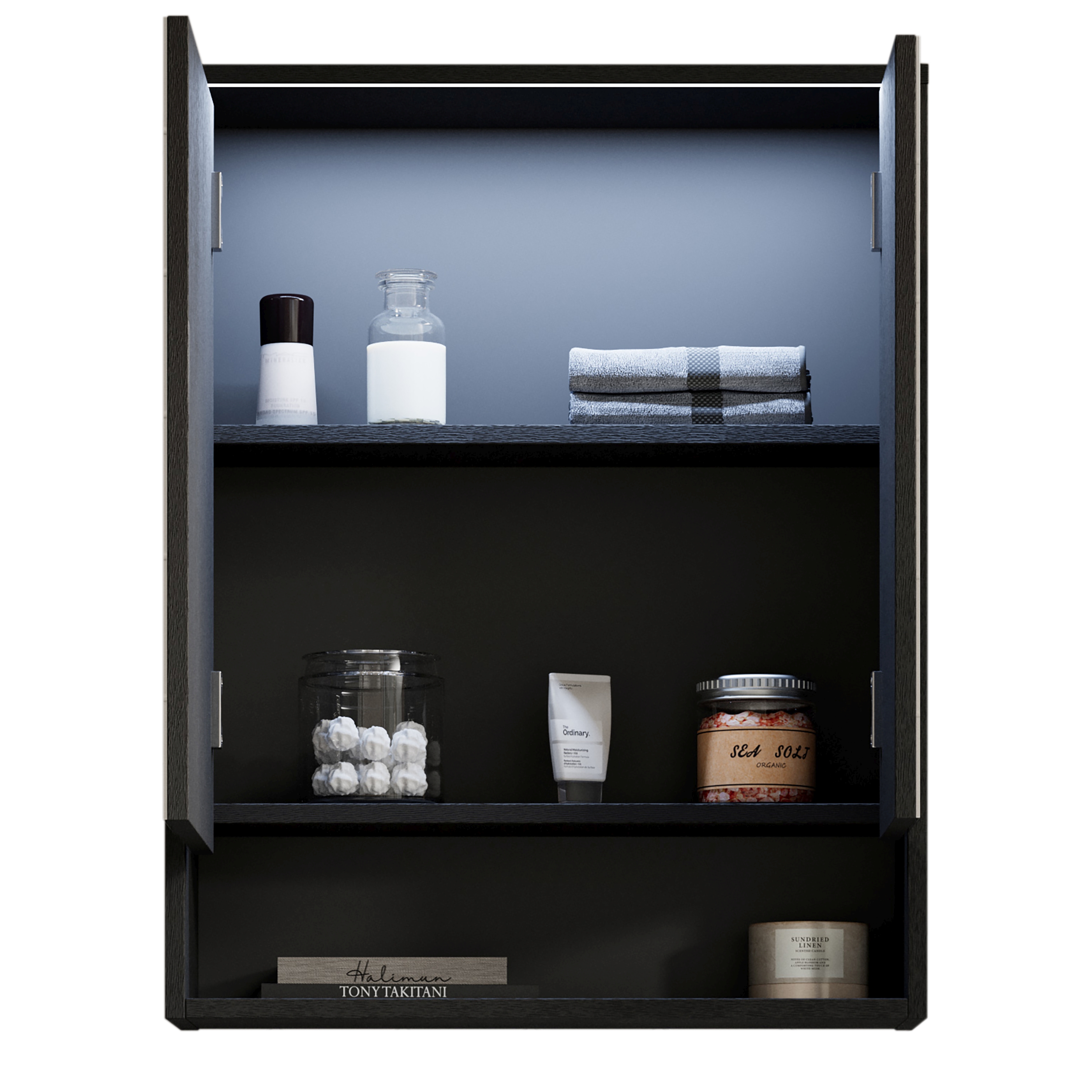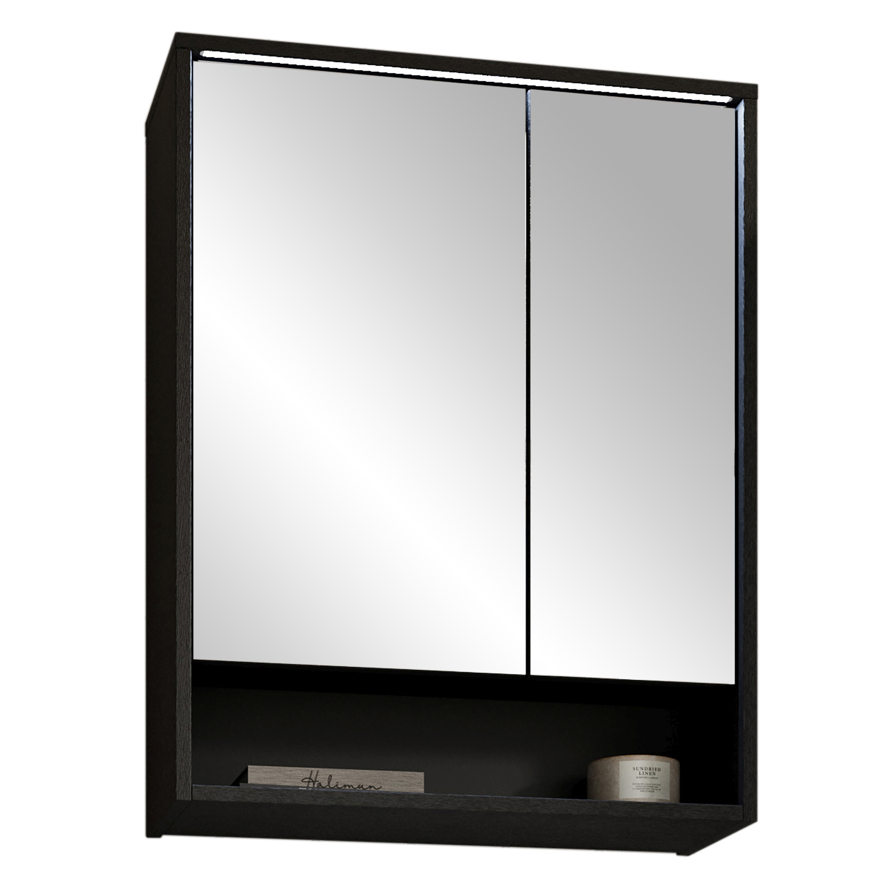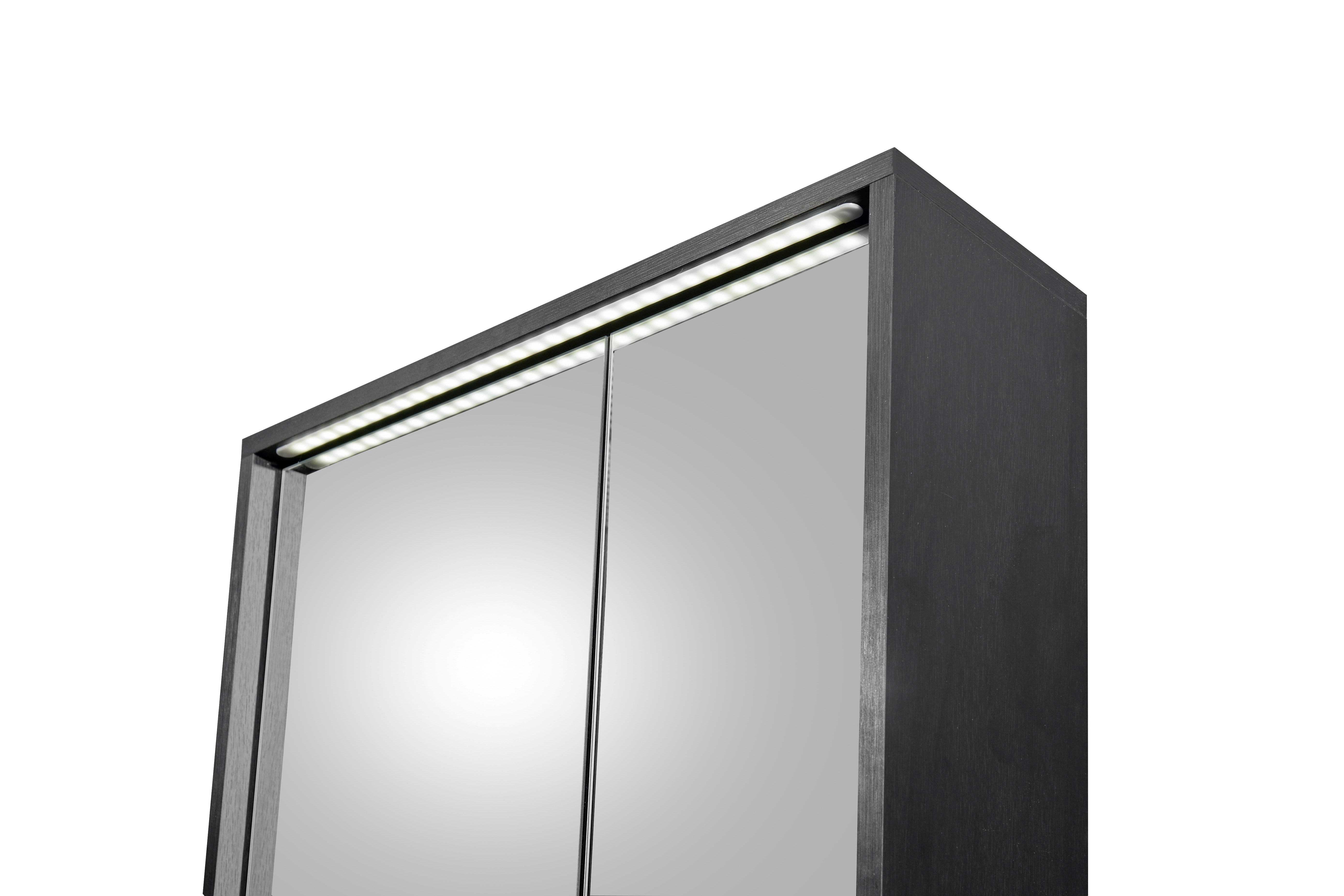 Façade : MDF (panneaux de fibres de bois de densité moyenne) thermoformé ton noir graphite, PPSM / miroir
