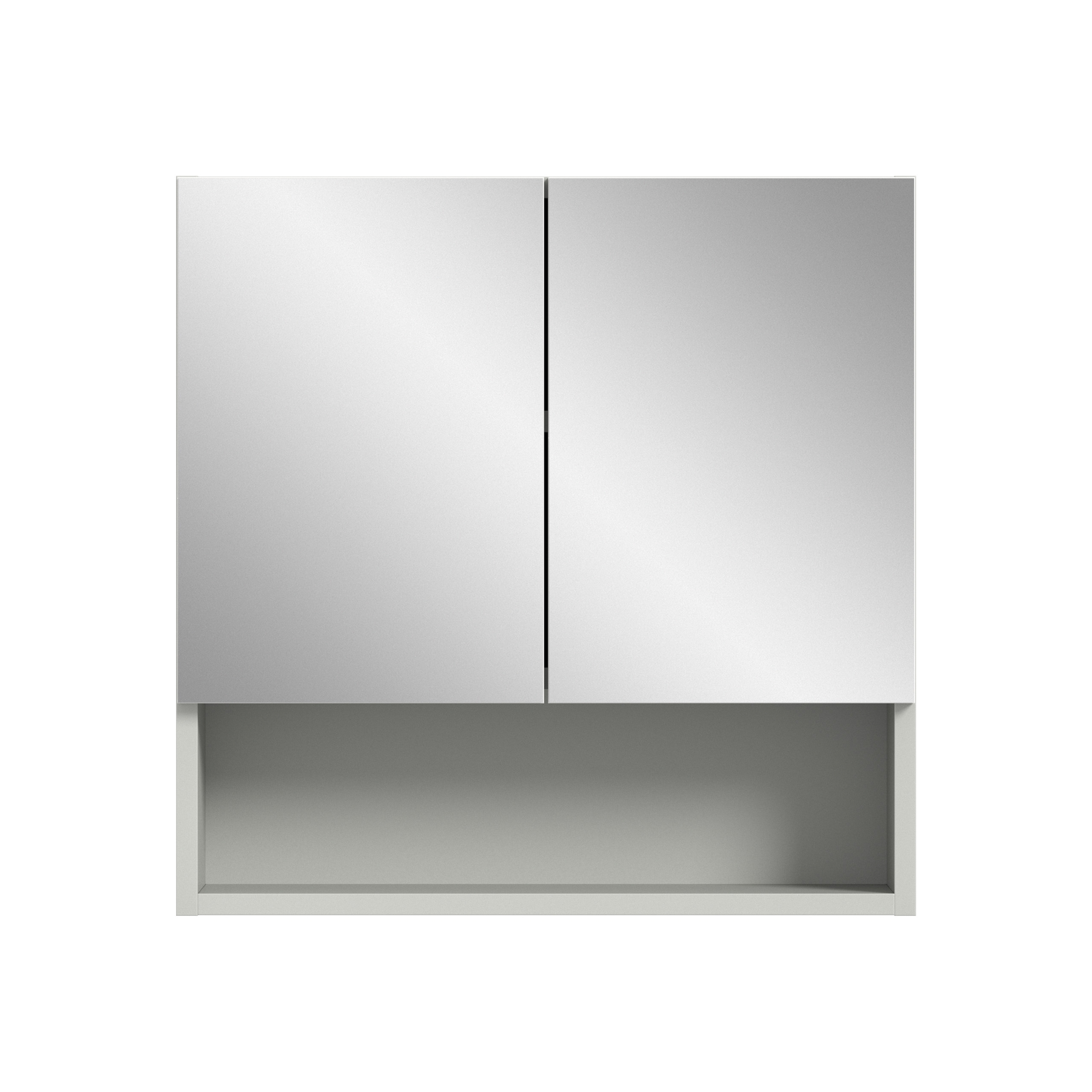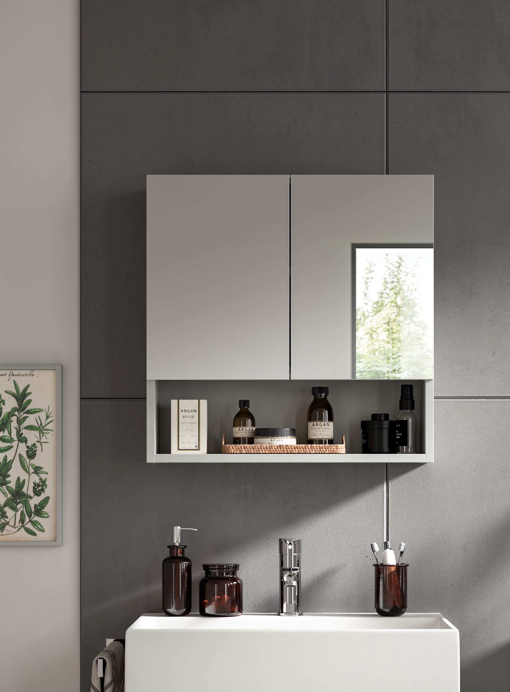 - Design/style : armoire de toilette moderne avec une façade miroir élégante dans un décor uniforme ton gris clair : elle associe élégance, sobriété et fonctionnalité pour la salle de bains.