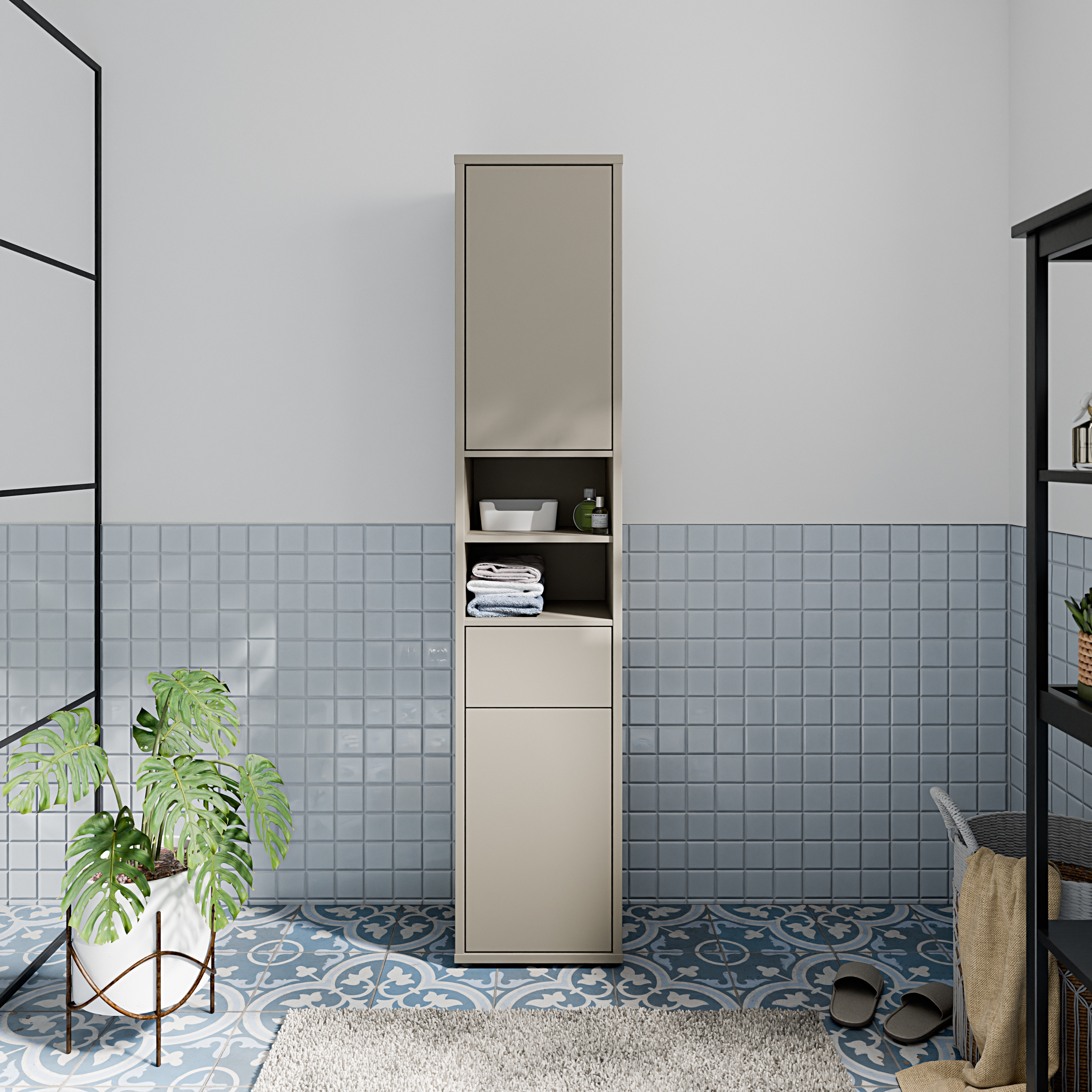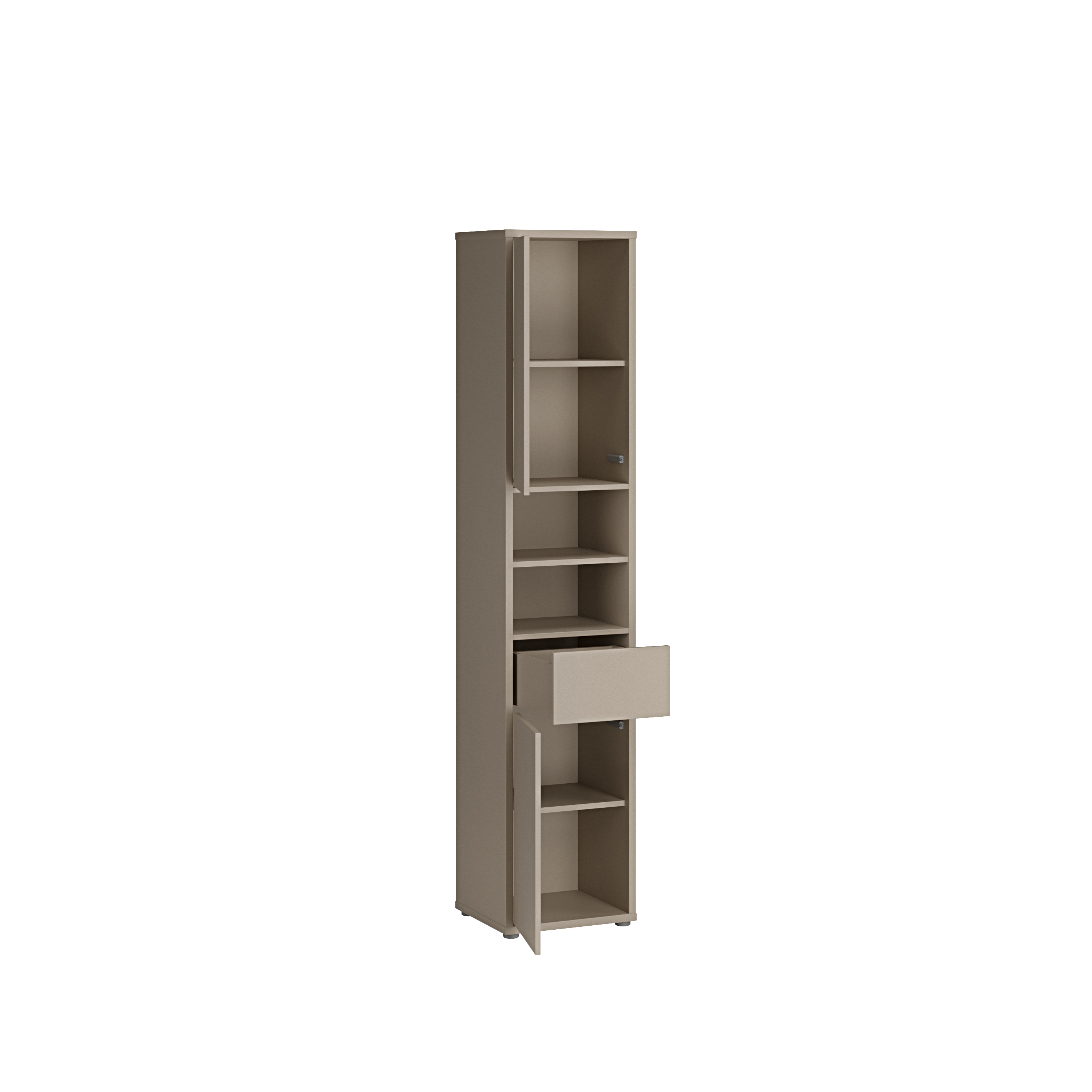 Cette armoire haute de couleur taupe (U88) offre un espace de rangement fonctionnel pour votre salle de bains. Equipee de deux portes, de deux etageres, d'un tiroir et d'un compartiment ouvert, elle permet de ranger proprement et a portee de main les serviettes, les produits de soin et les accessoires de salle de bains. La couleur uniforme confere un aspect harmonieux a l'ensemble et se combine facilement avec les meubles de salle de bains existants. Cette armoire compacte est ideale pour les petites pieces et exploite de maniere optimale l'espace disponible. Une solution pratique pour le quotidien : stable, facile d'entretien et abordable. Disponible chez MEGA Möbel, en ligne ou dans votre magasin local.