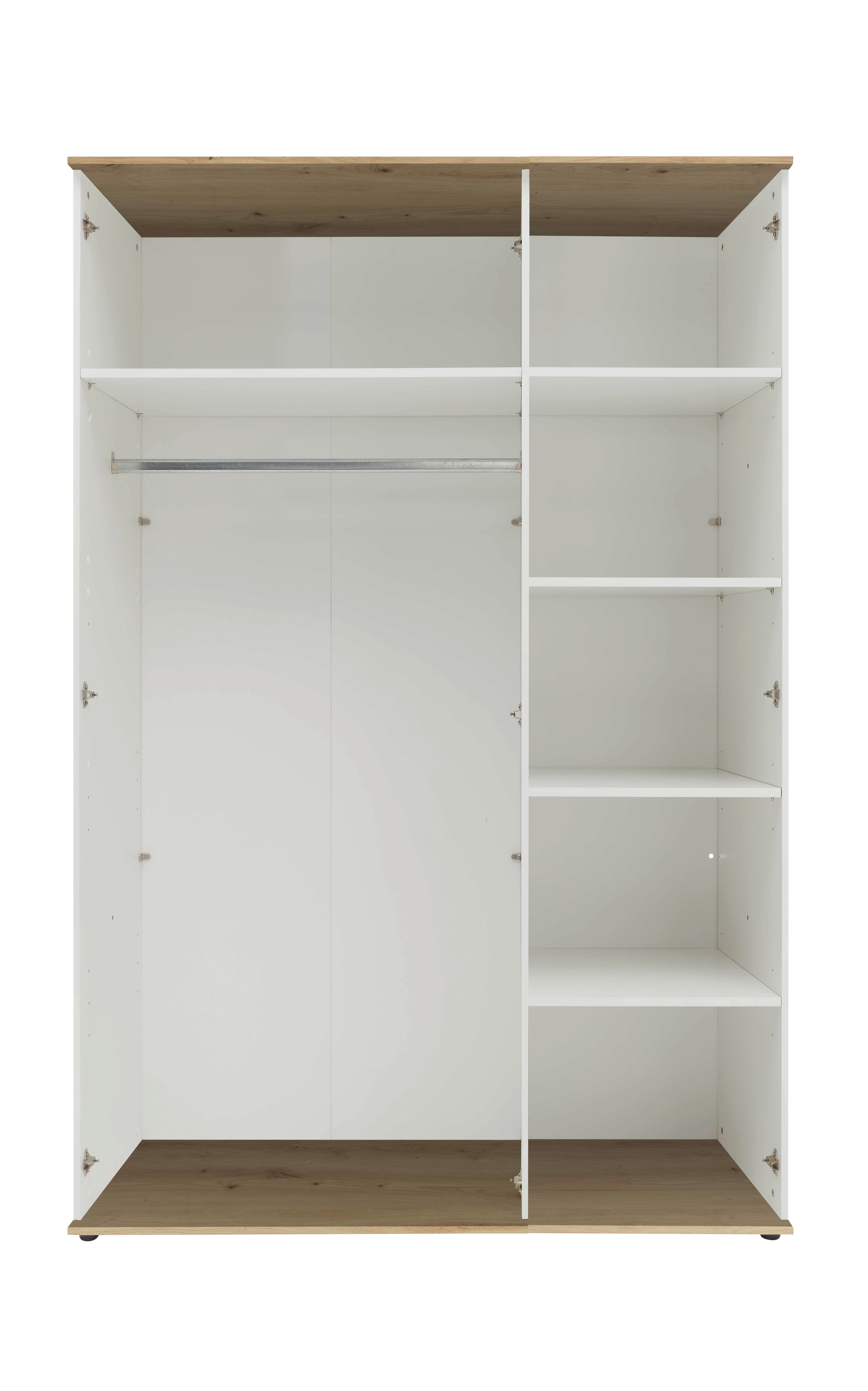 Cette armoire à trois portes séduit par son design moderne et son agencement intérieur bien pensé. Le corps en imitation bois de chêne Artisan confère au meuble un aspect chaleureux et naturel, tandis que la façade en Macadamia lui donne un look élégant et intemporel. Les poignées en métal noir apportent une touche de style et soulignent son caractère moderne. À l'intérieur, l'armoire offre un compartiment à linge pratique, une tringle à vêtements solide ainsi que cinq étagères pour un rangement bien organisé. Avec ses dimensions d'environ 136 x 210 x 58 cm, cette armoire est idéale pour une chambre à coucher ou un dressing et permet de garder de l'ordre tout en occupant un espace réduit.