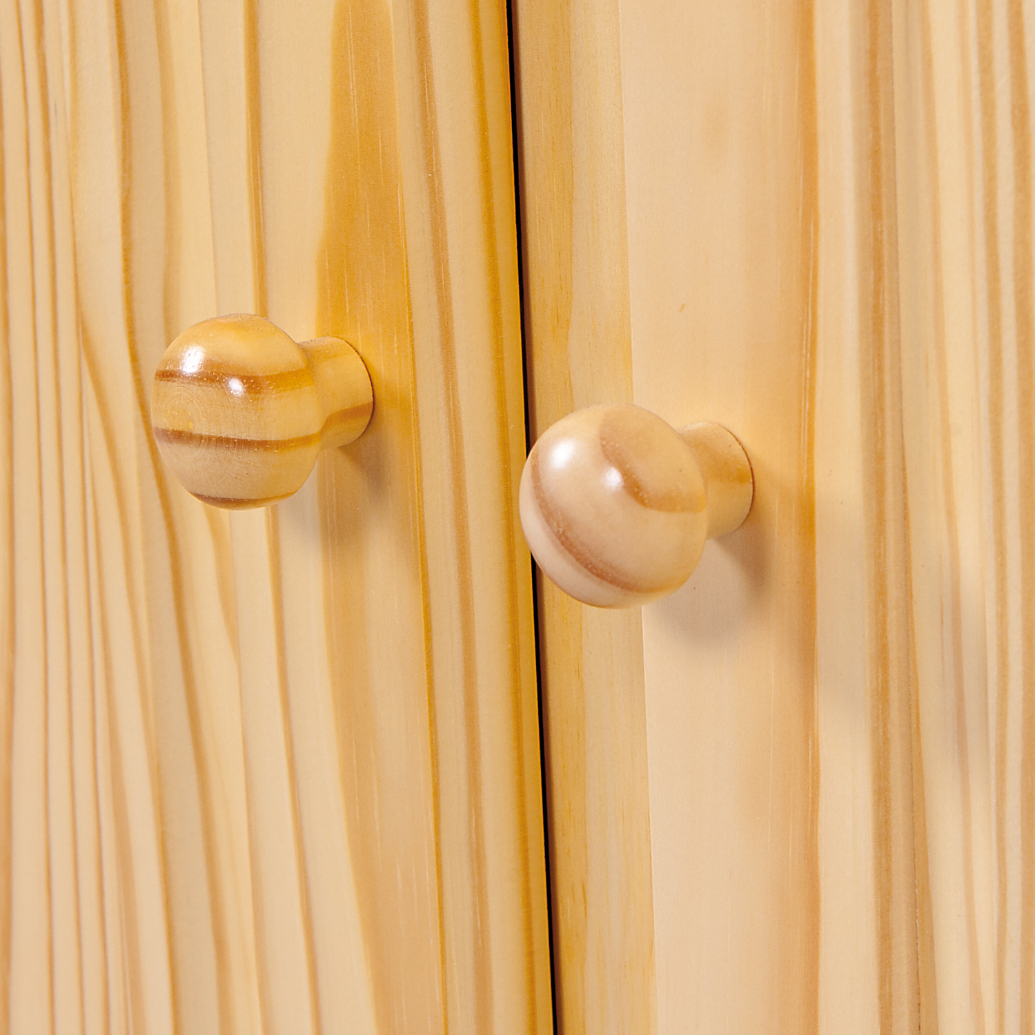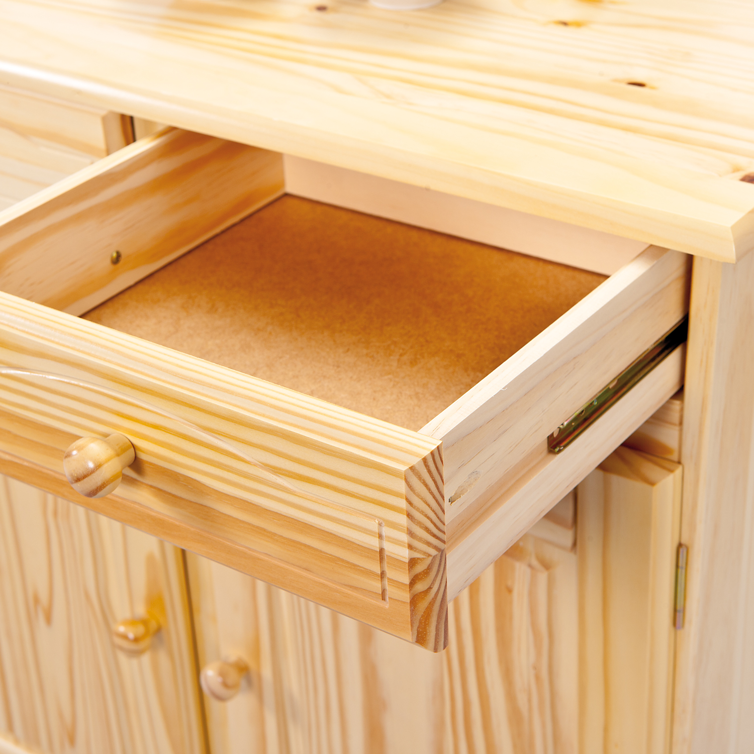 La surface en pin massif (pin Tadea) est scellée avec un vernis transparent à faible teneur en COV (composés organiques volatils). Cela rend le meuble particulièrement facile d’entretien, résistant et hydrofuge.