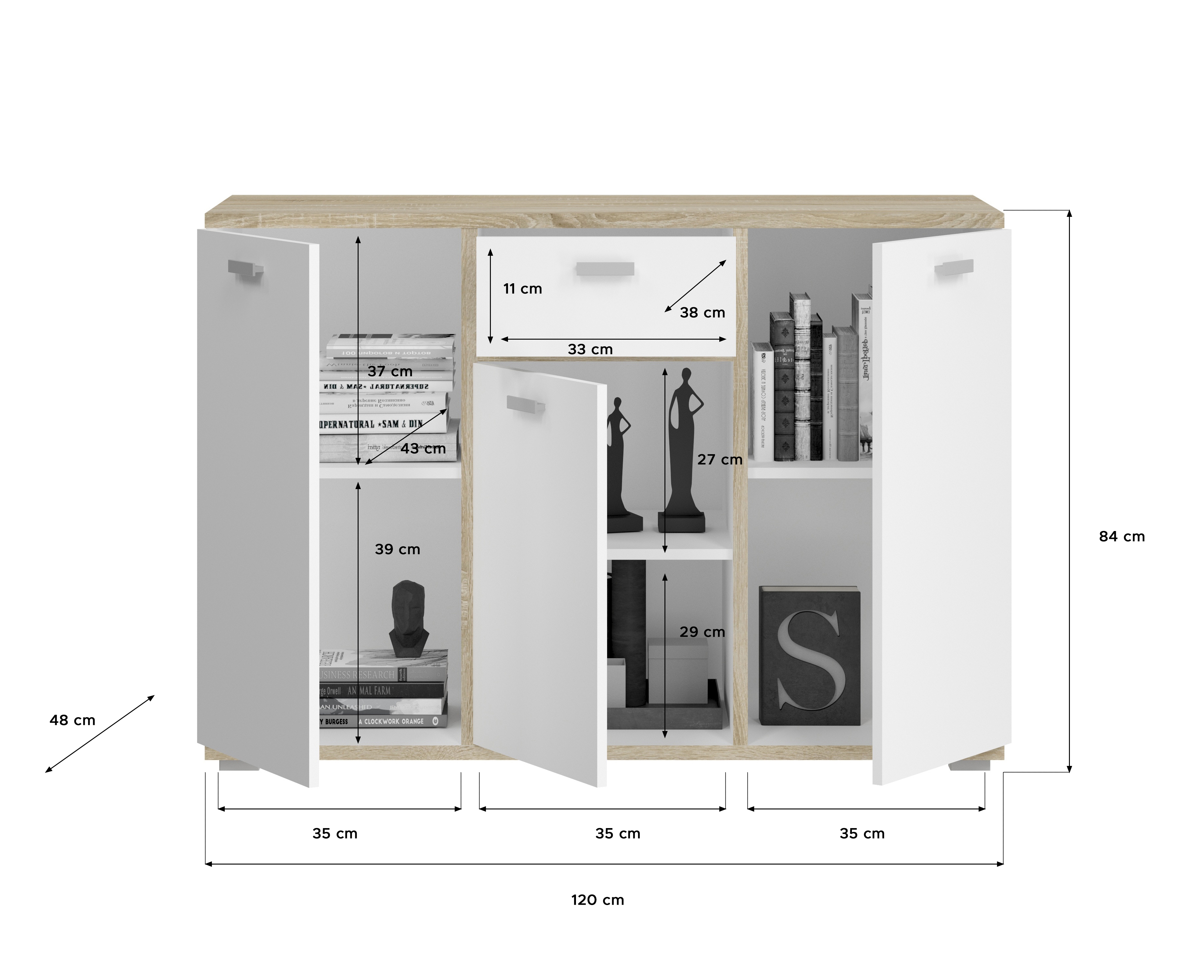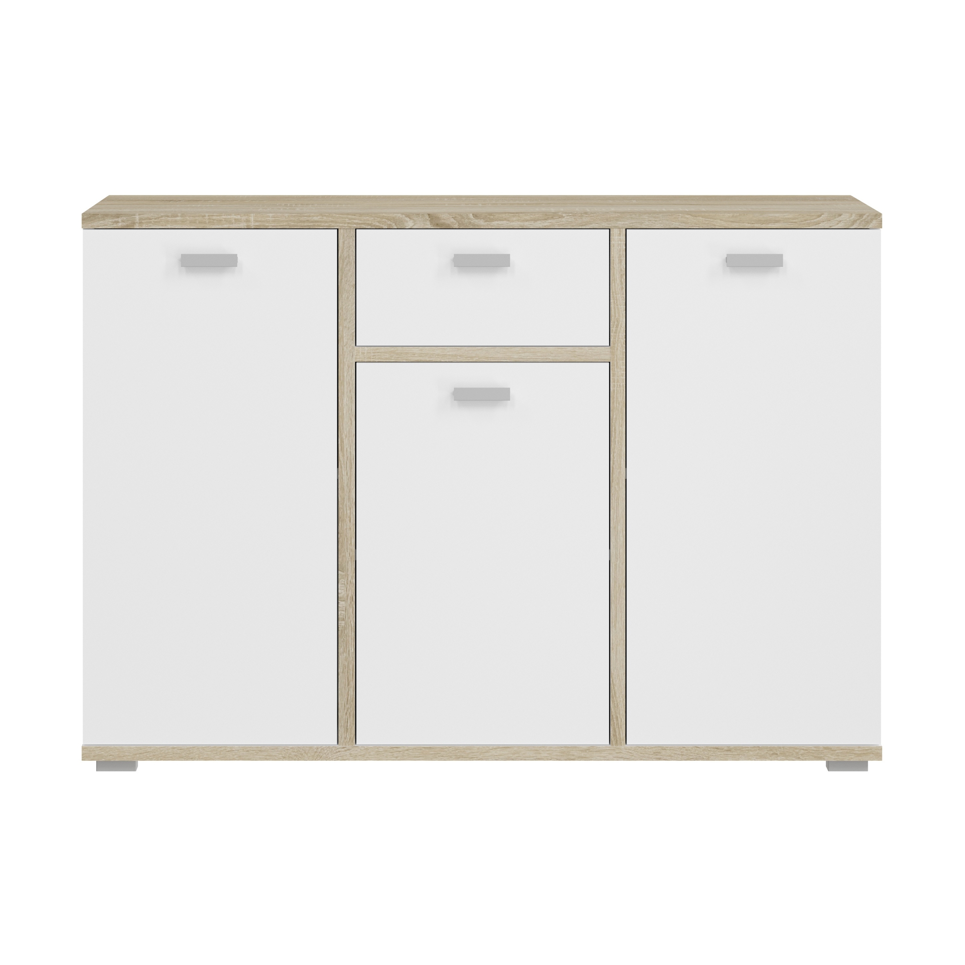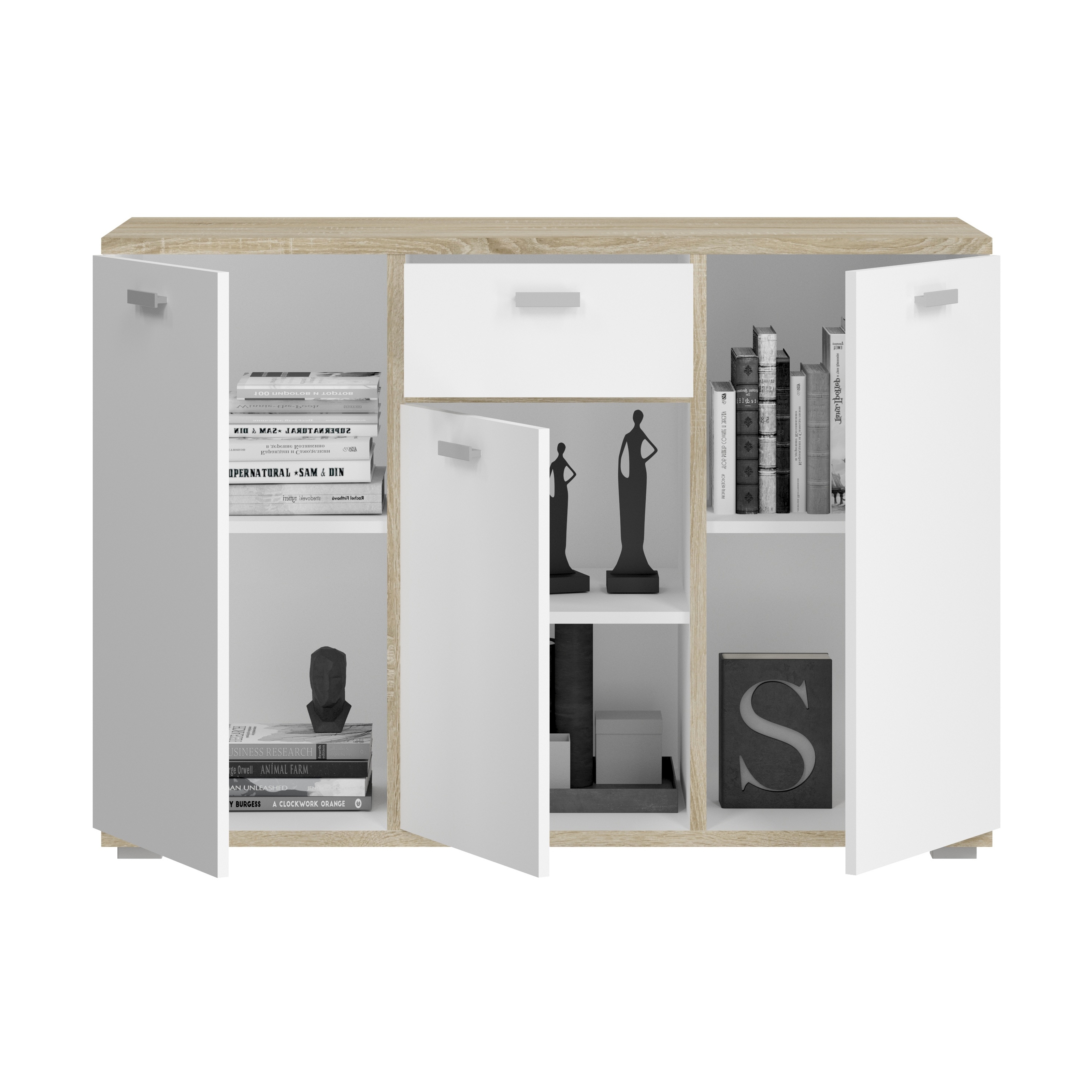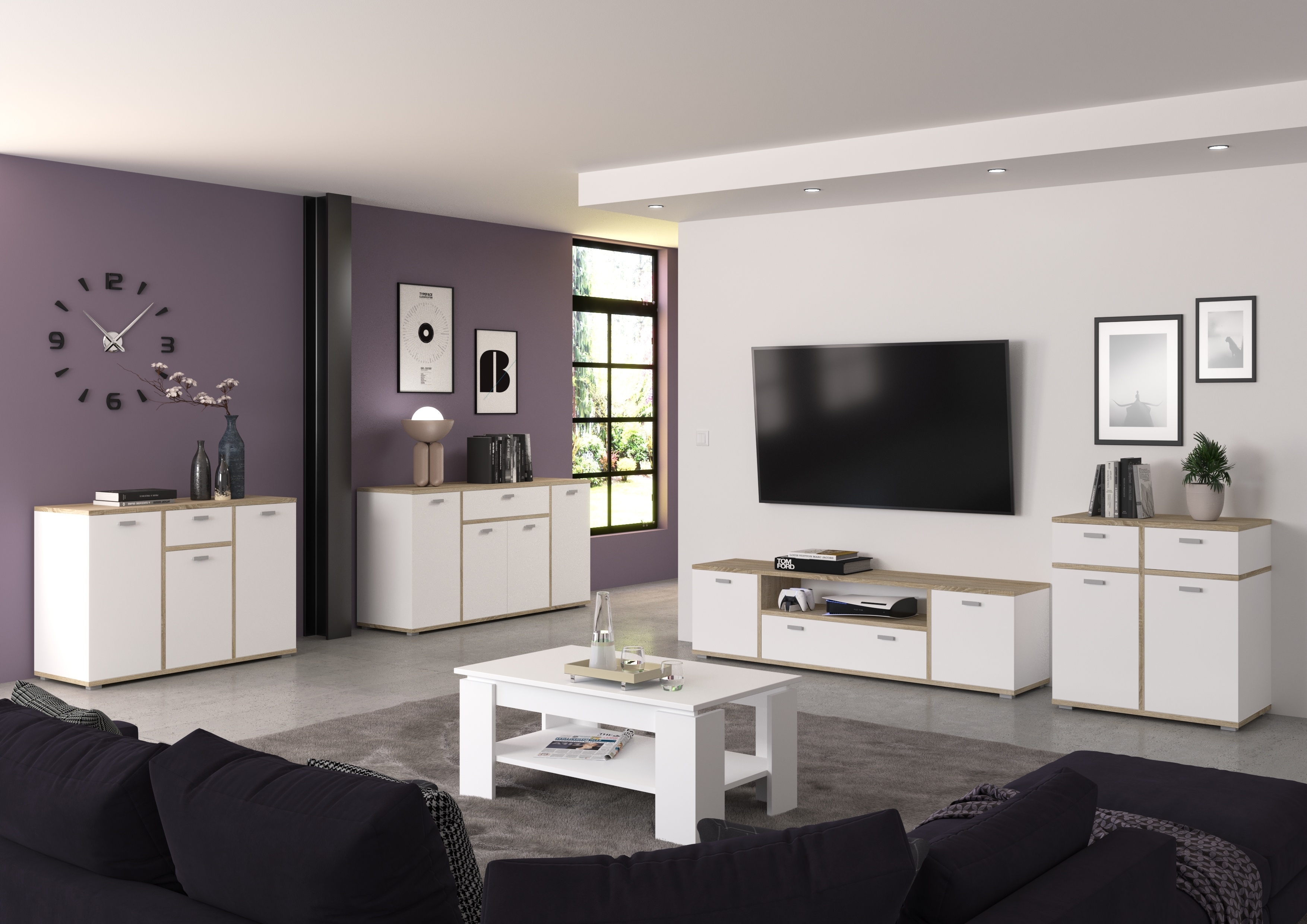 - Design/style : bahut tendance dans un élégant contraste ton blanc et décor chêne Sonoma clair ; ce modèle au look contemporain et polyvalent s’intègre parfaitement dans différents styles d’intérieur.