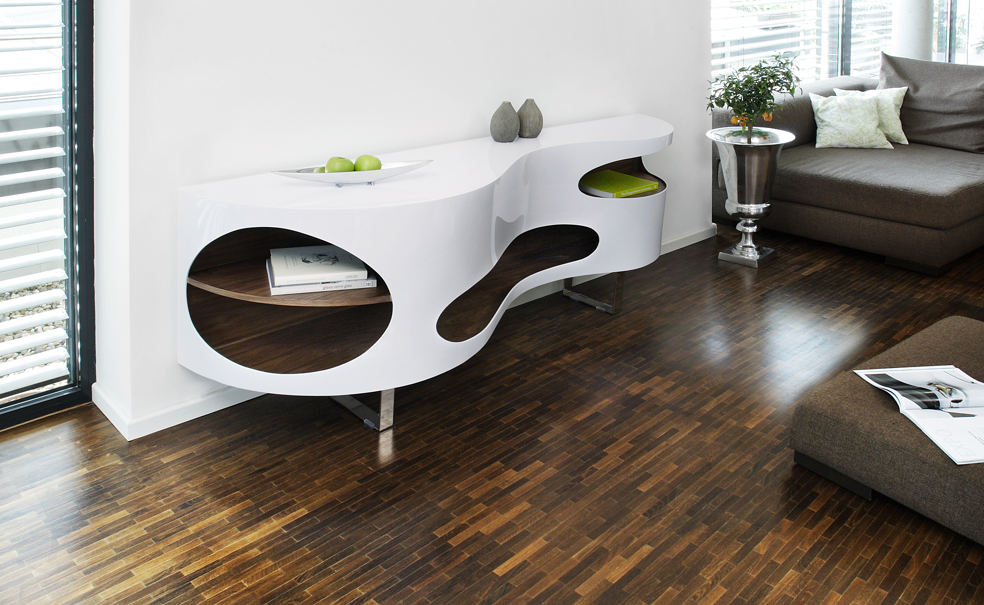 Le bahut de la série de mobilier Allant est proposé dans un design exceptionnel. La surface blanche contraste avec le bois de noyer foncé. Les ouvertures asymétriques dans une forme légèrement incurvée offrent de la place pour des livres, des objets de décoration et bien plus encore.