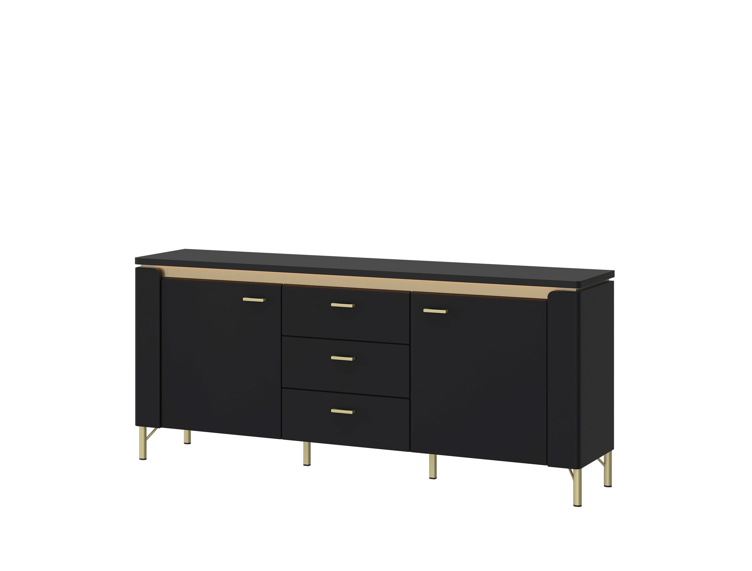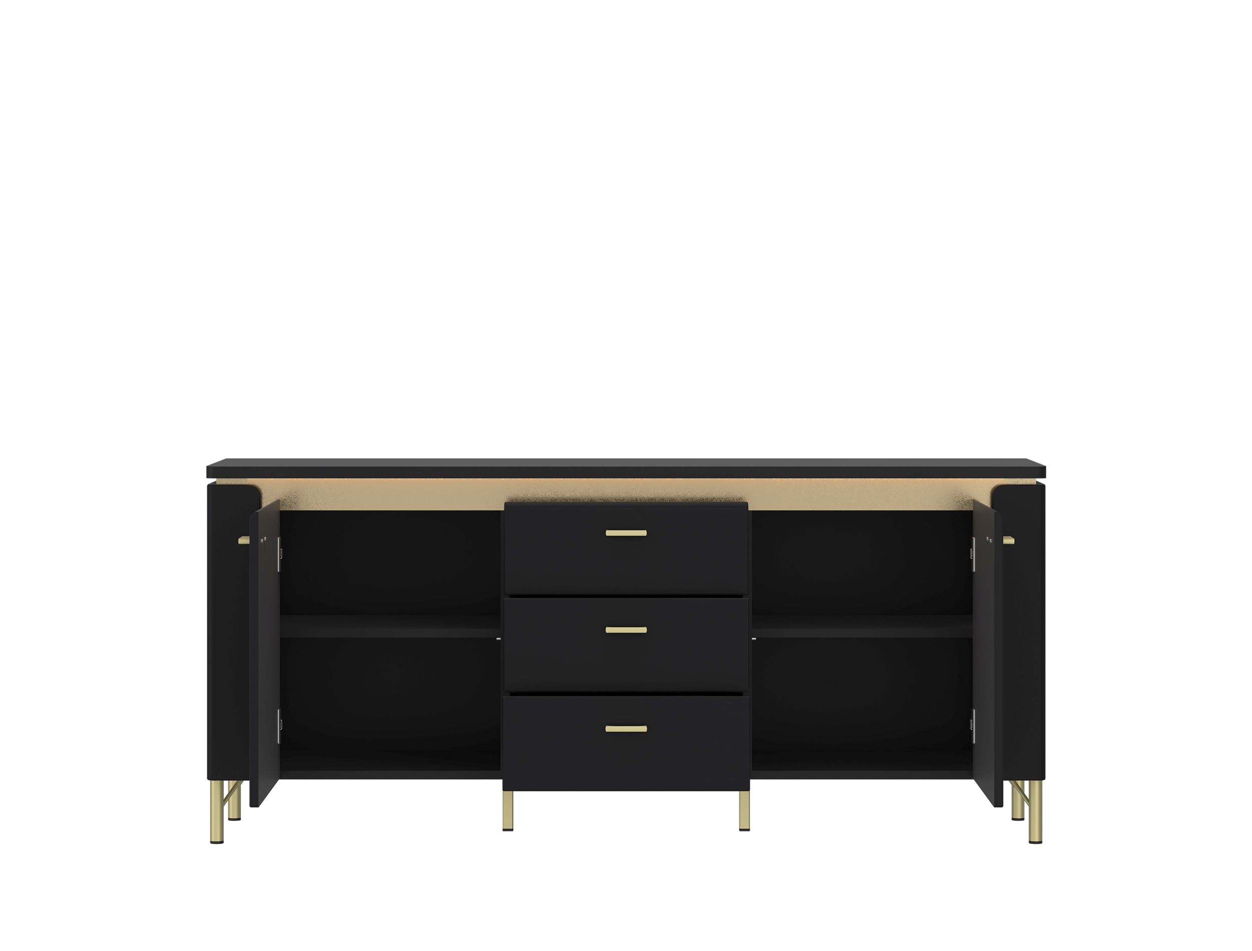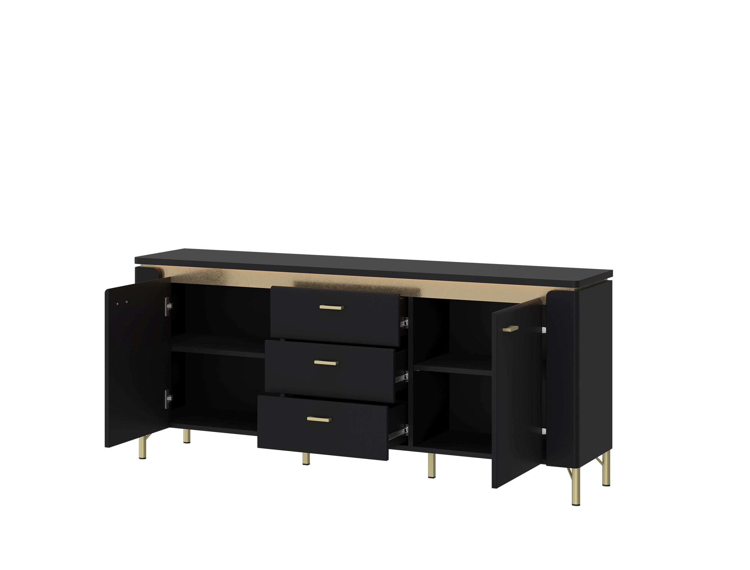 Caisson : ton noir et contrastes ton doré, plateau en MDF, panneau de particules surfacé mélaminé (PPSM)
