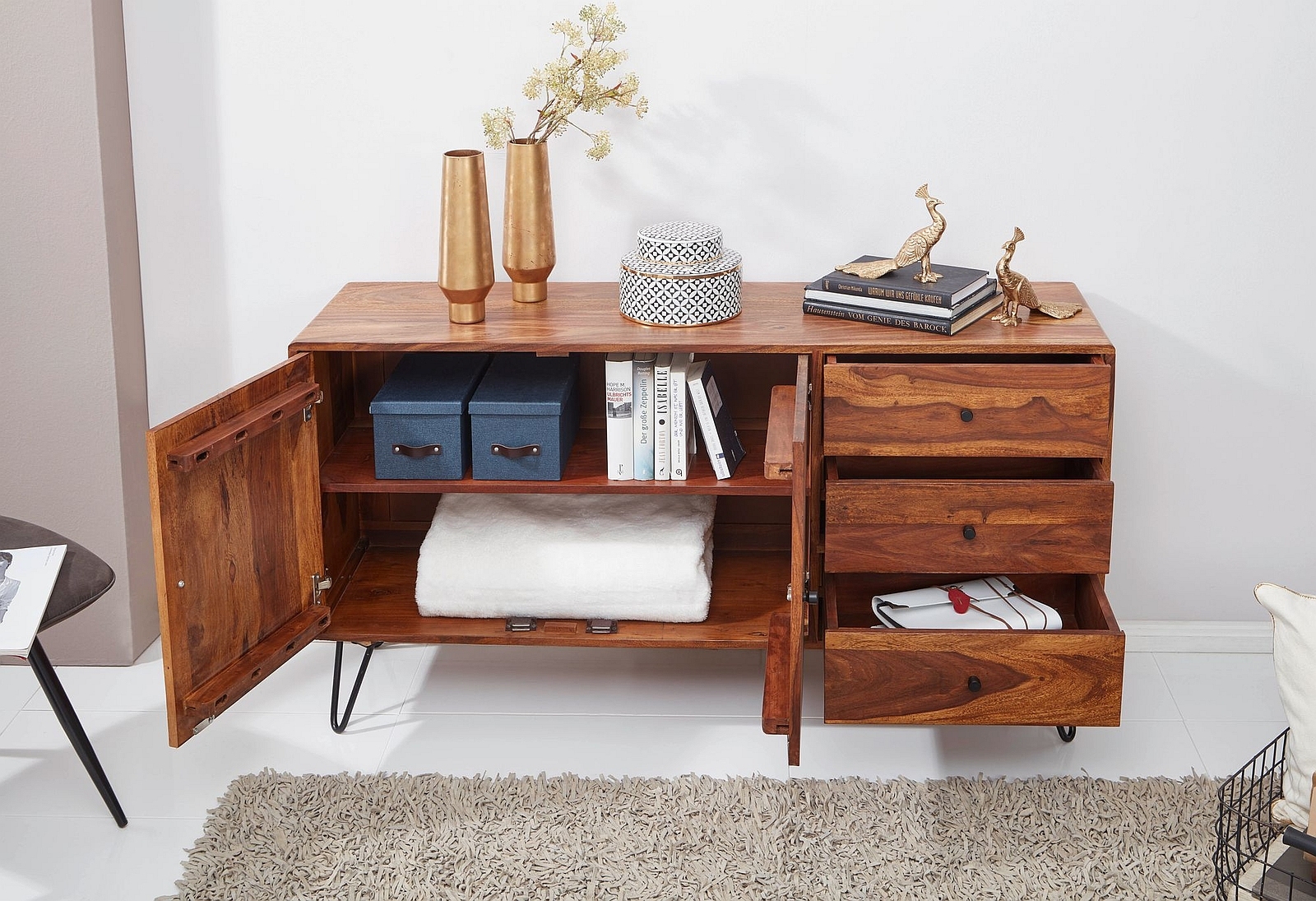 - ORIGINAL ✔ Le bahut solide en bois de sheesham exotique apporte une bouffée d’air frais dans votre intérieur. Grâce à un savant mélange de style rustique robuste et d’éléments de design tendance, l’aspect de ce bahut vous convaincra sur toute la ligne ! Au total, deux compartiments et trois tiroirs vous offrent également l’espace de rangement dont vous avez besoin dans votre maison.