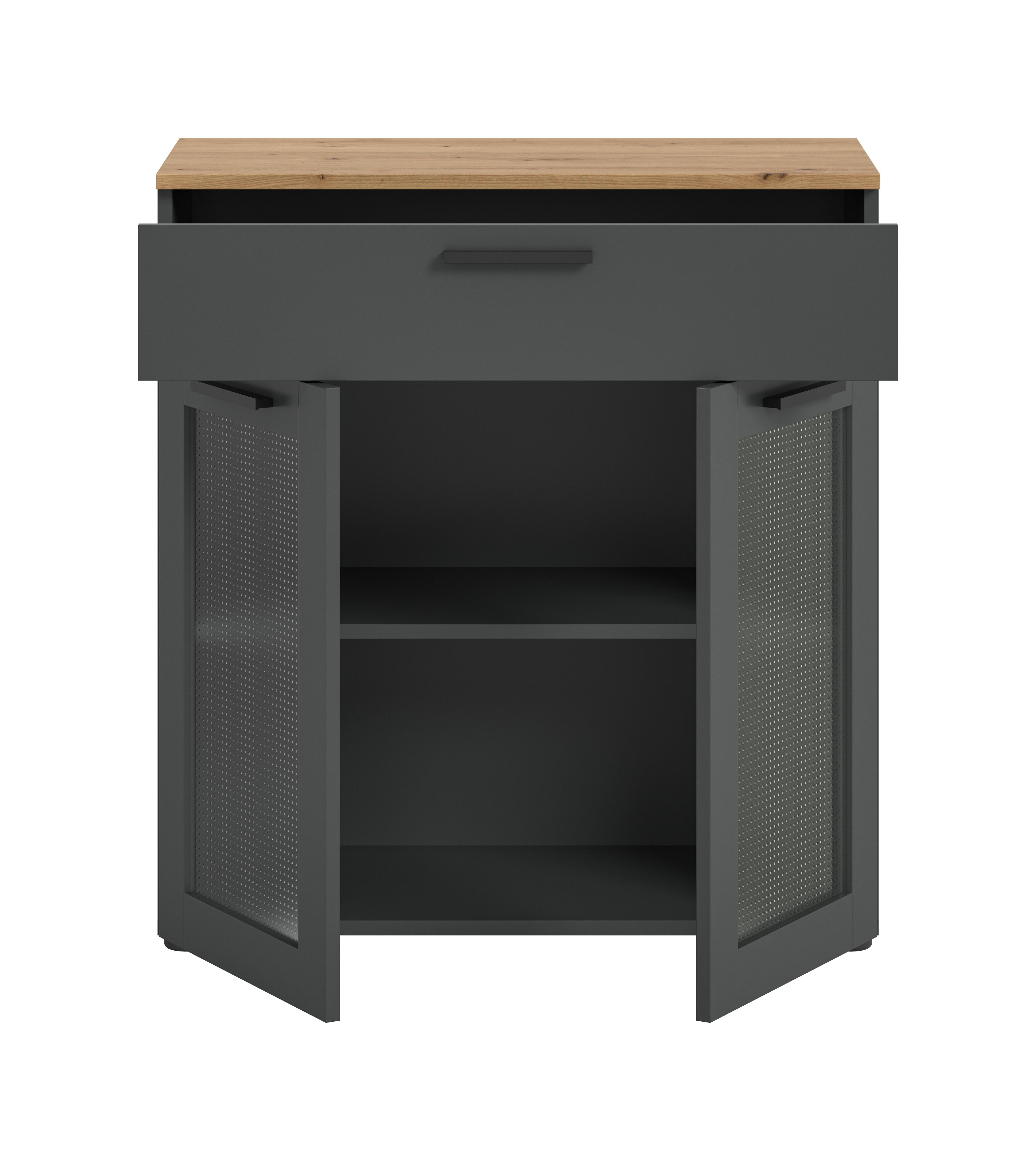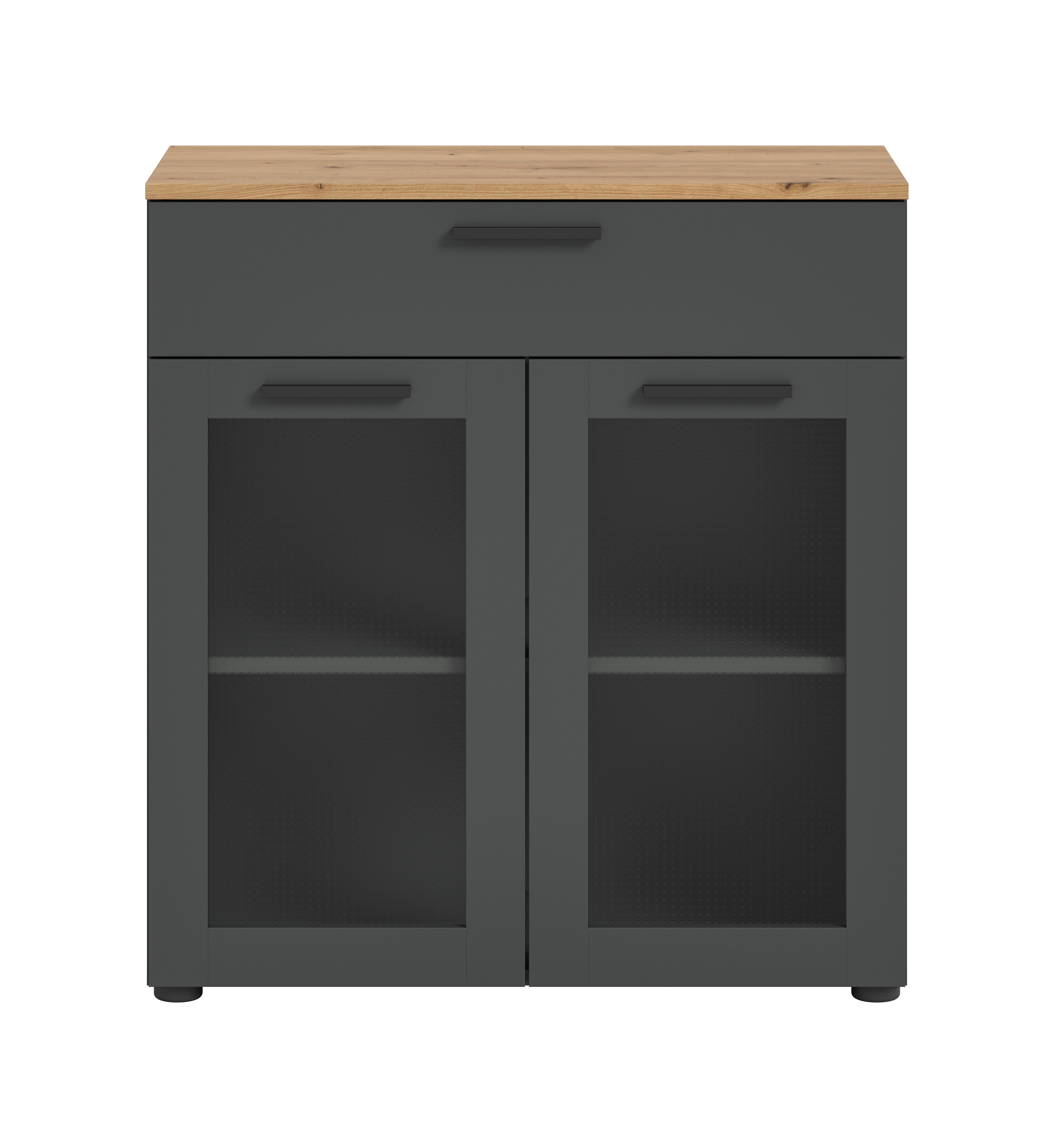 Découvrez la combinaison parfaite entre élégance et fonctionnalité ! Ce bahut moderne décor ton gris basalte, rehaussé de chêne Artisan stylé et d’éléments en verre, offre un généreux espace de rangement. Les deux portes vitrées ajoutent une touche décorative, tandis que le tiroir discret apporte un espace de stockage supplémentaire pour les petits objets. Parfait pour un intérieur minimaliste ou contemporain.