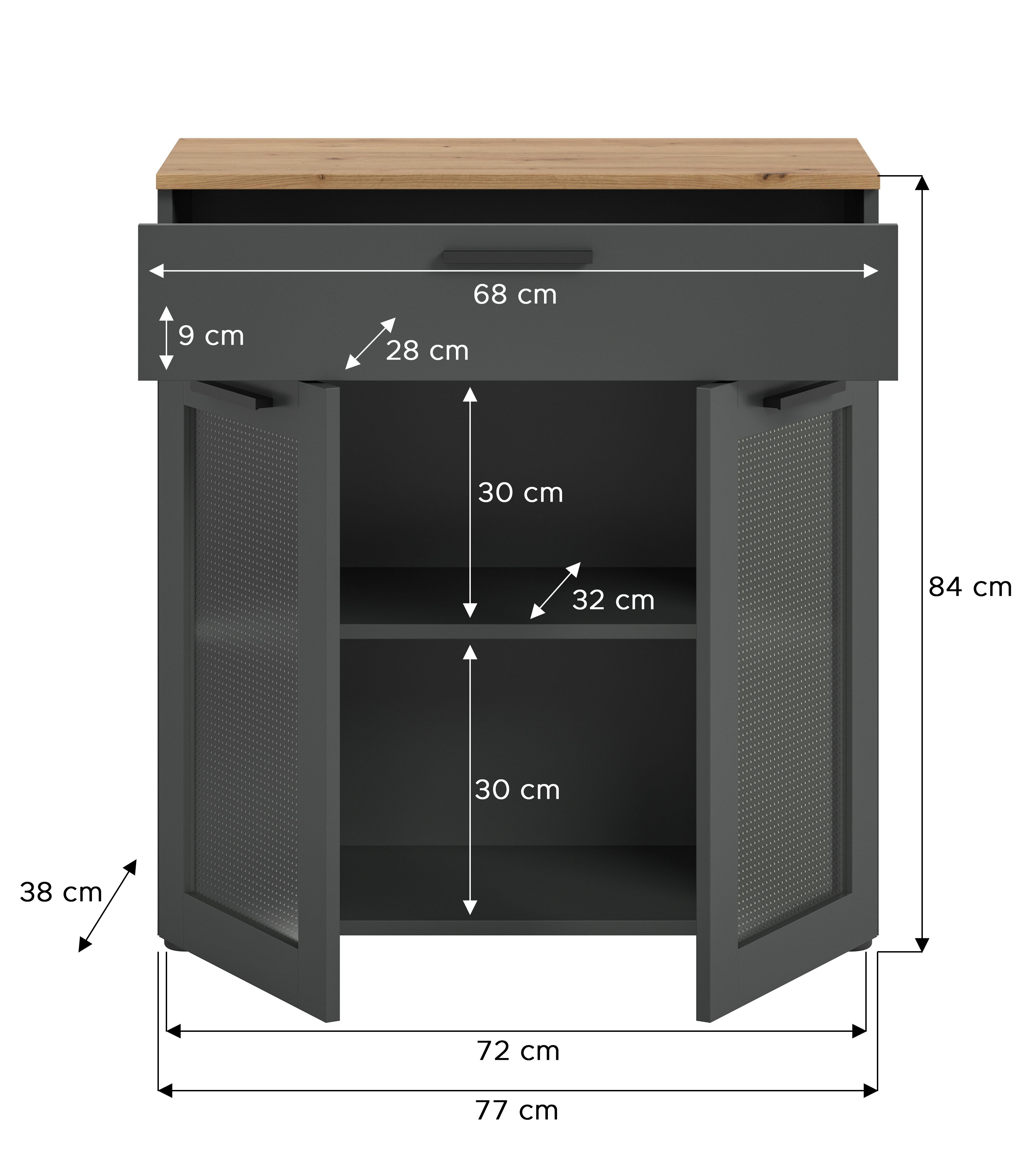 • Fonctionnalité : avec un vaste espace de rangement derrière deux portes et un tiroir, ce bahut offre suffisamment de place pour stocker vêtements, livres, documents ou objets personnels. L’agencement réfléchi des compartiments et les dimensions pratiques en font un meuble fonctionnel pour l’organisation et le rangement.