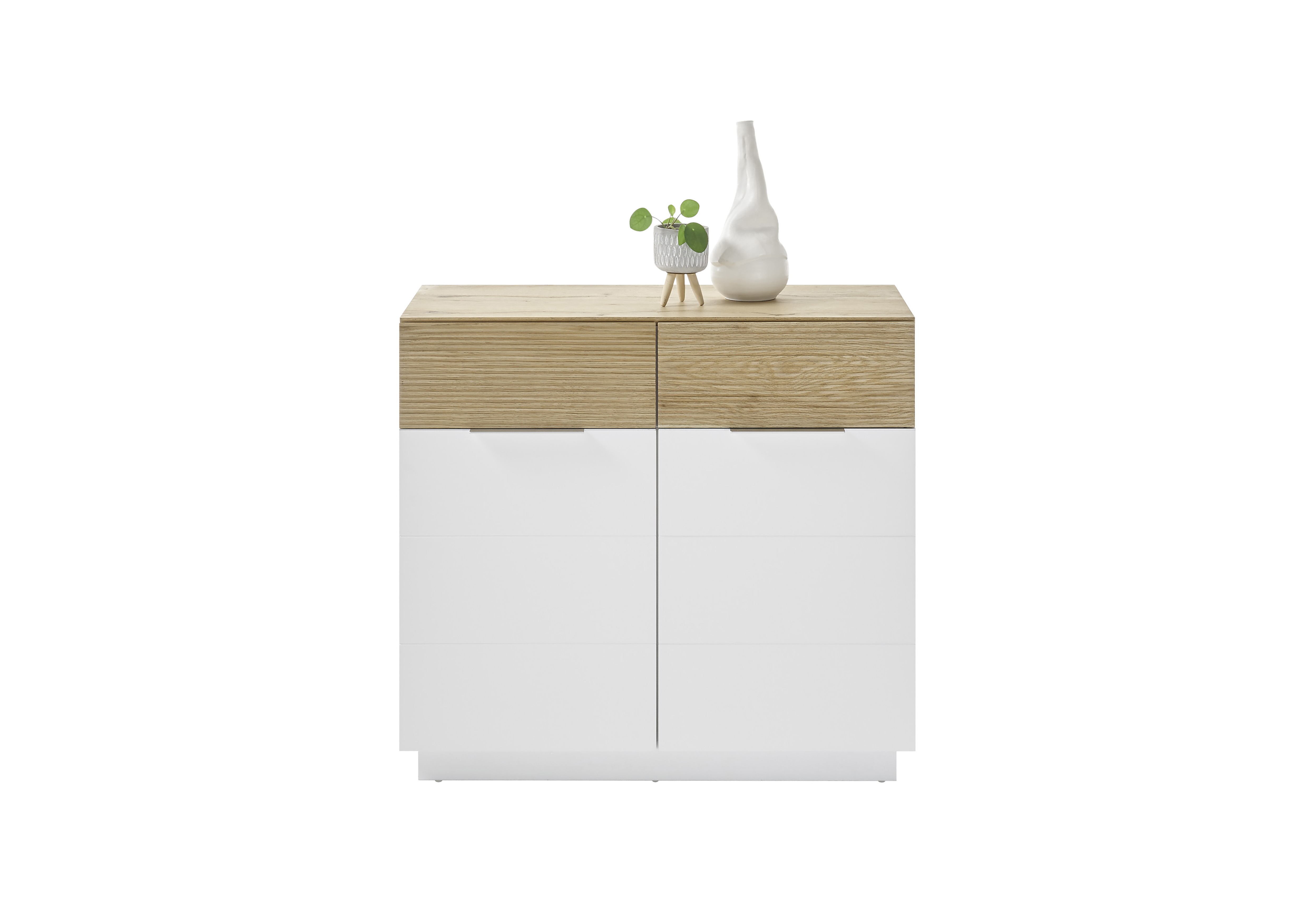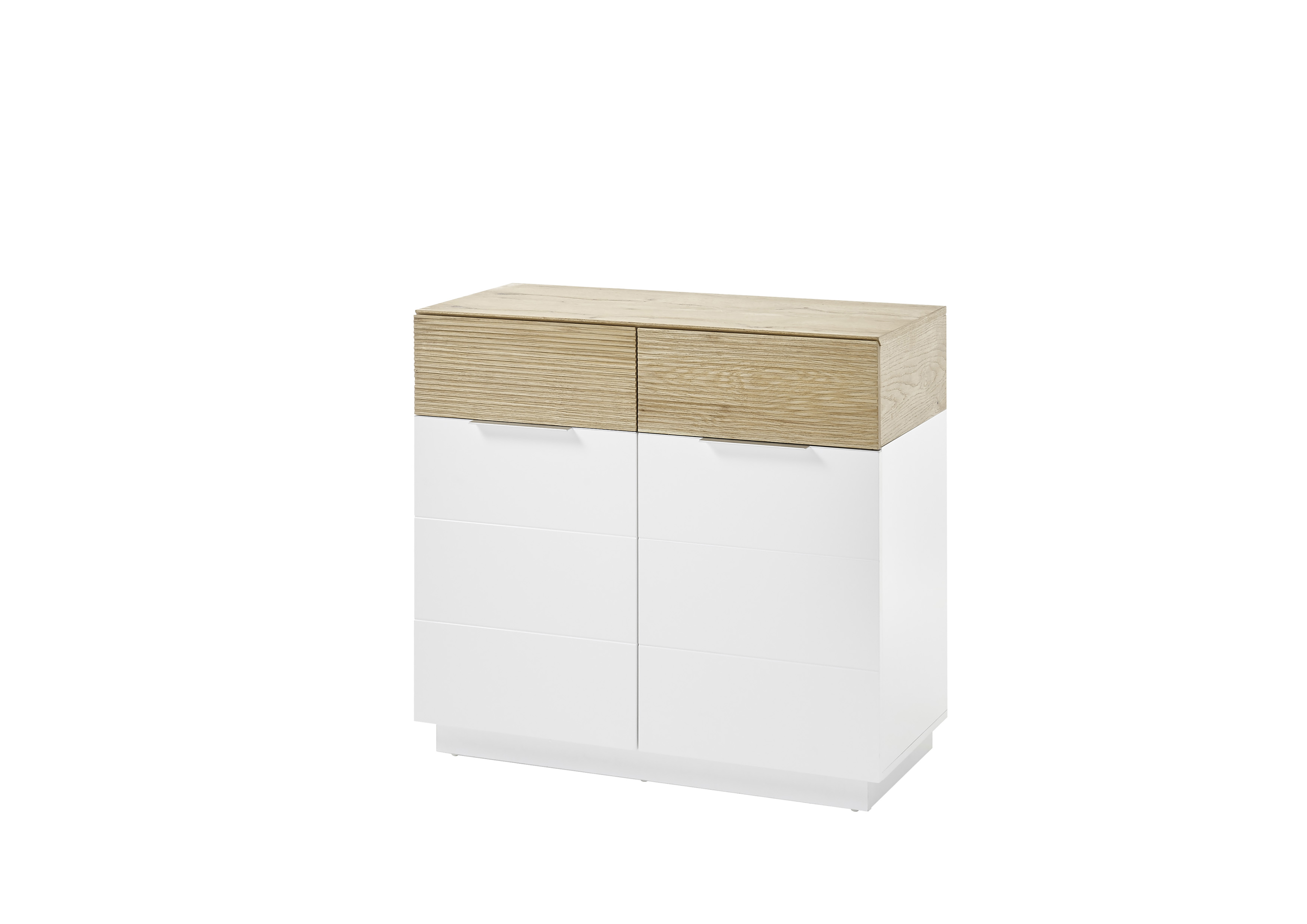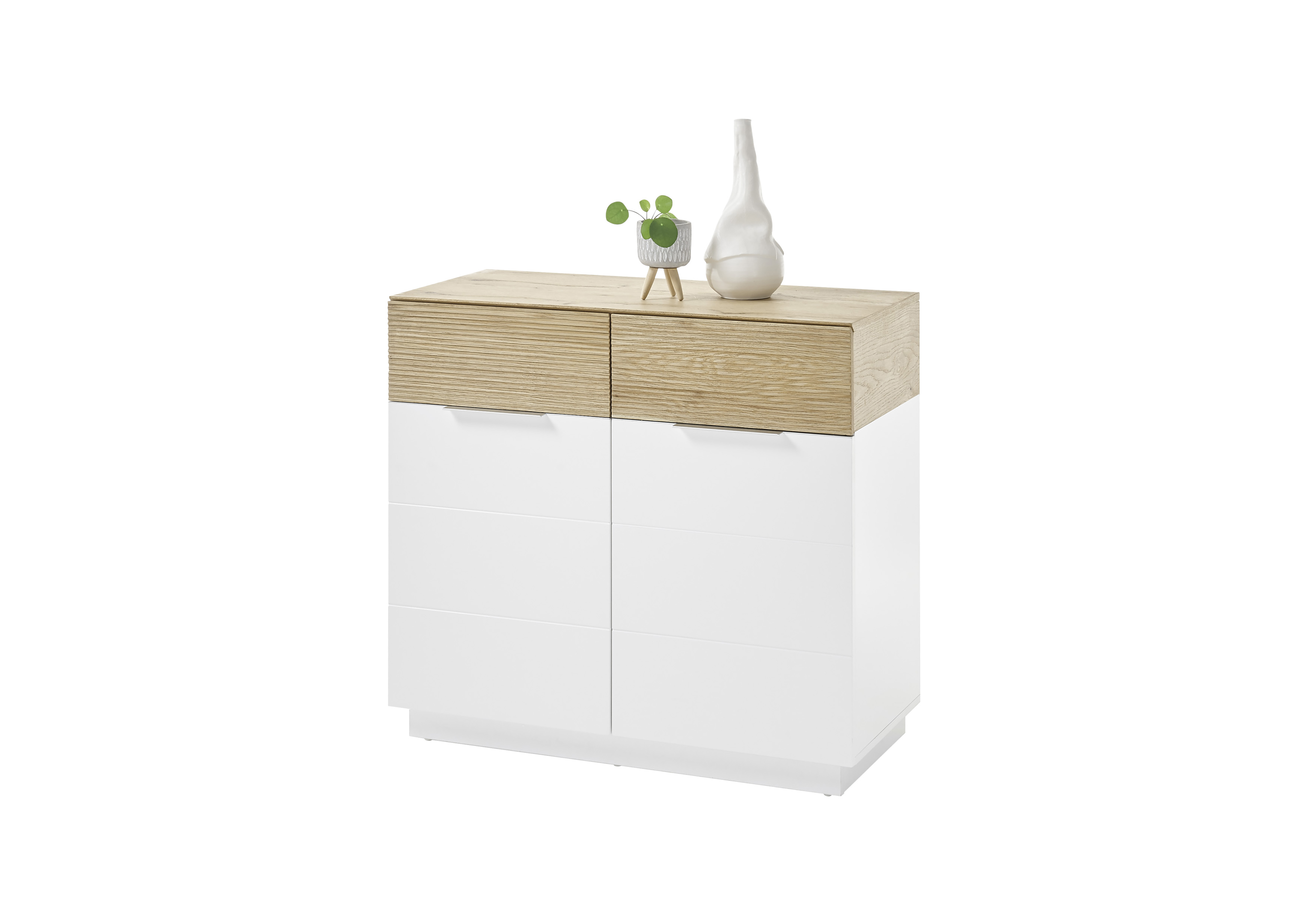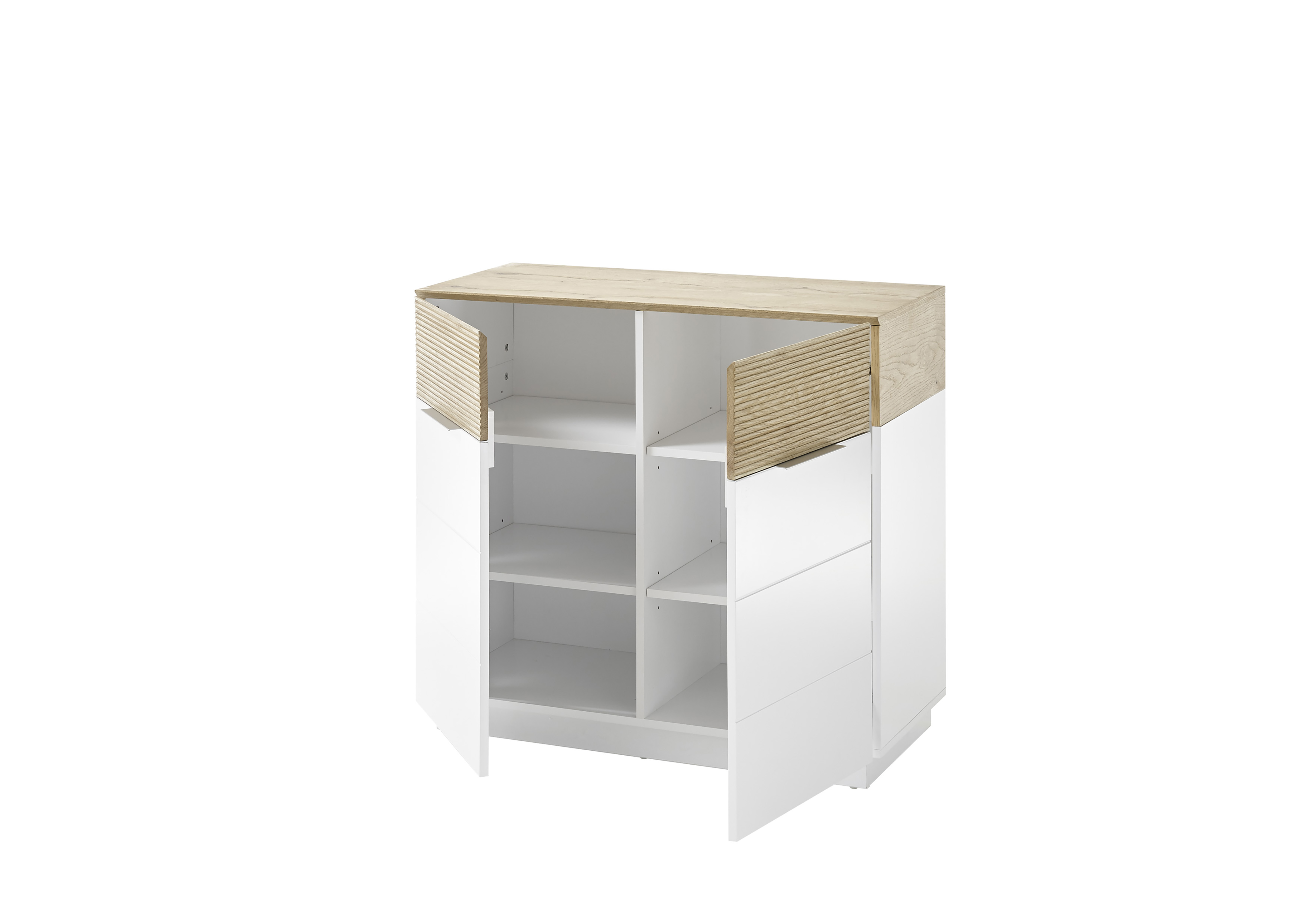 Façade : chêne massif (Pologne) à rainures et partie laquée ton blanc mat