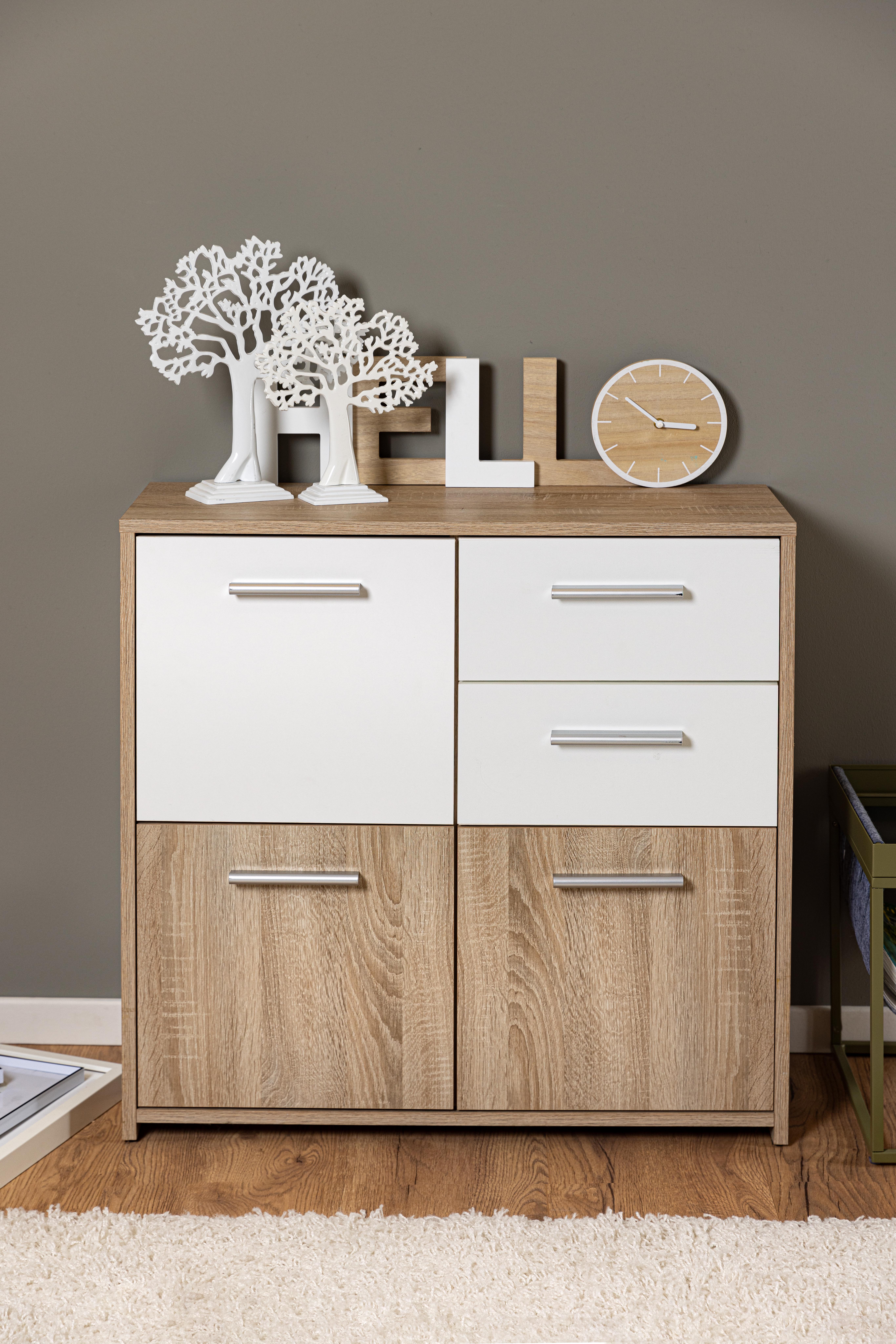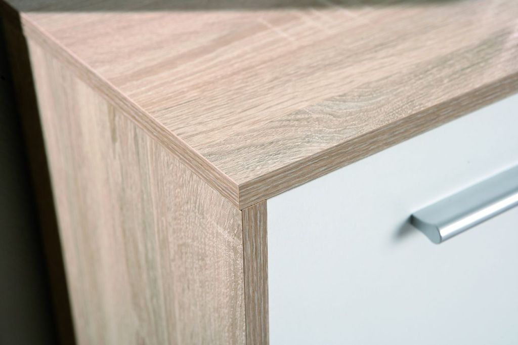 La surface, dans les tons tendance décor chêne Sonoma et blanc, confère au meuble un aspect à la fois moderne et chaleureux.