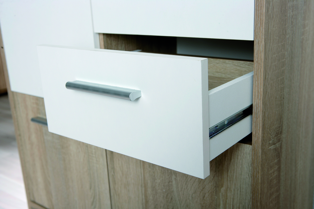 Avec 2 tiroirs montés sur rails métalliques et 3 portes au total, le bahut Eboli offre un vaste espace de rangement à utiliser selon vos besoins.