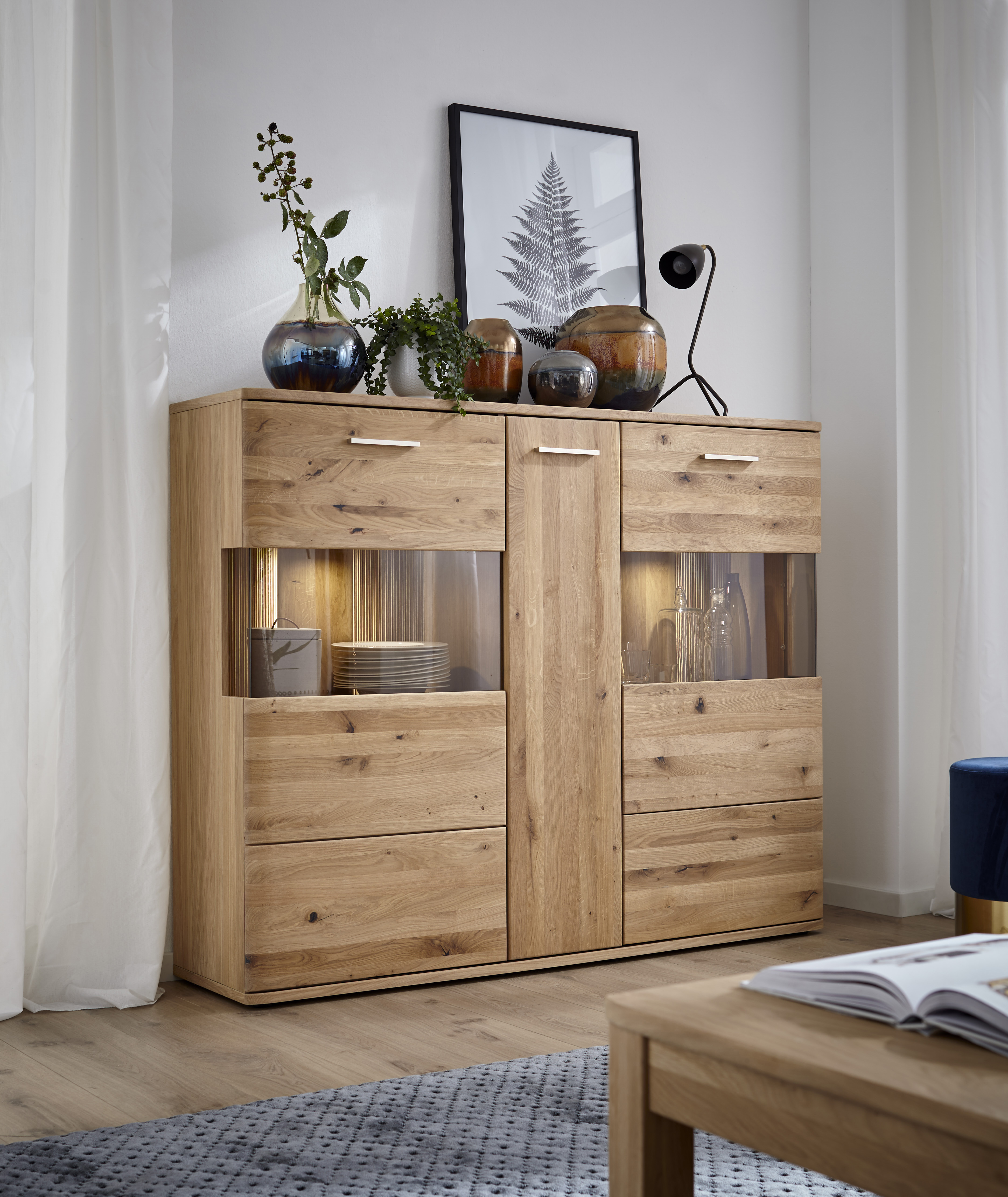 Caisson : extérieur placage chêne bianco, surface huilée / intérieur décor bois