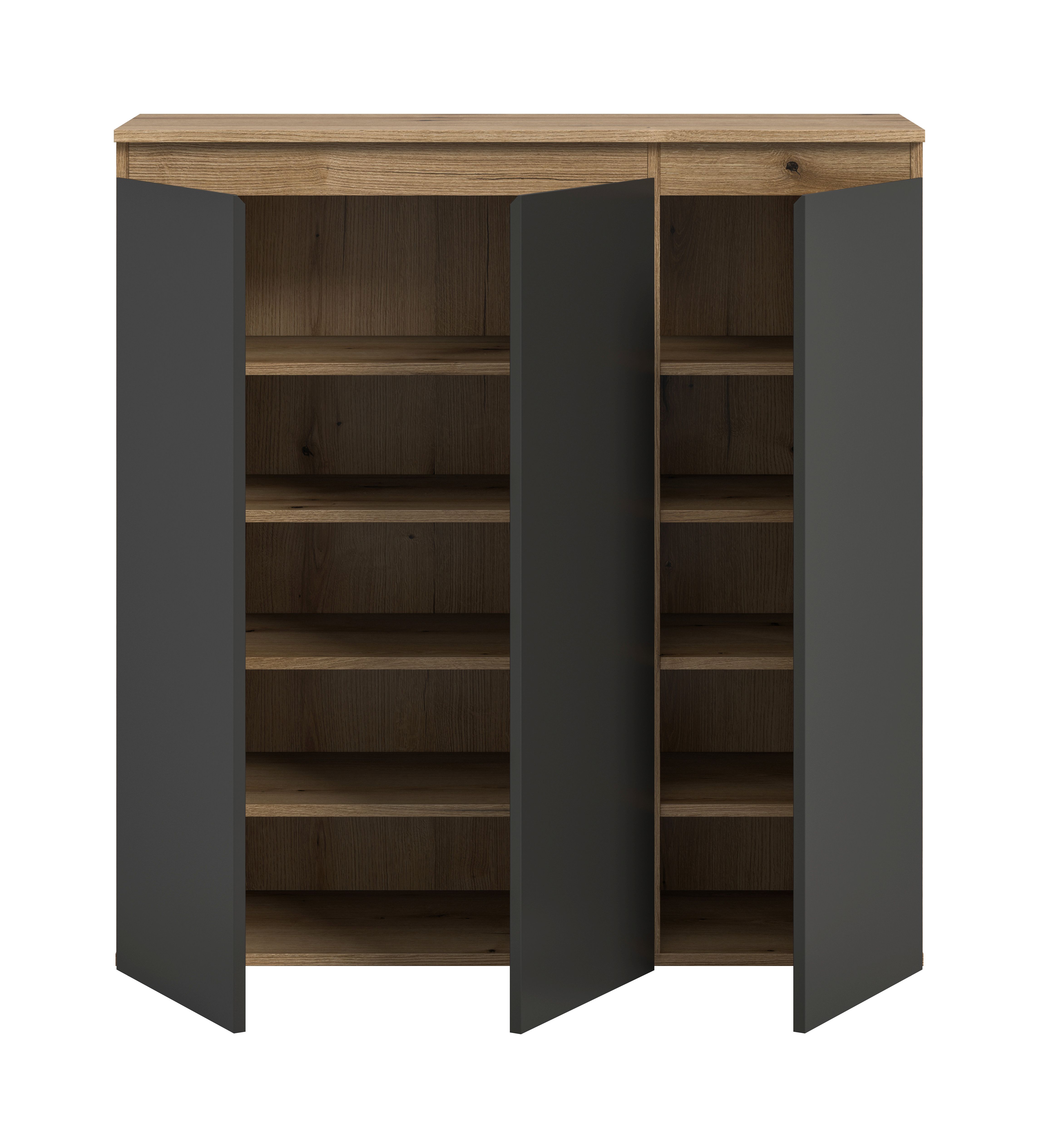 Compact, moderne et polyvalent : ce bahut haut dans un décot chêne Evoke et ton anthracite (dimensions : 105 x 111 x 37 cm) est la solution idéale pour les petits espaces. Grâce à ses 8 tablettes réglables individuellement, il offre suffisamment de place pour les vêtements, chaussures, classeurs ou articles ménagers. Son design épuré aux lignes droites lui permet de s’adapter à tous les styles d’intérieur tout en conservant une allure moderne et discrète.