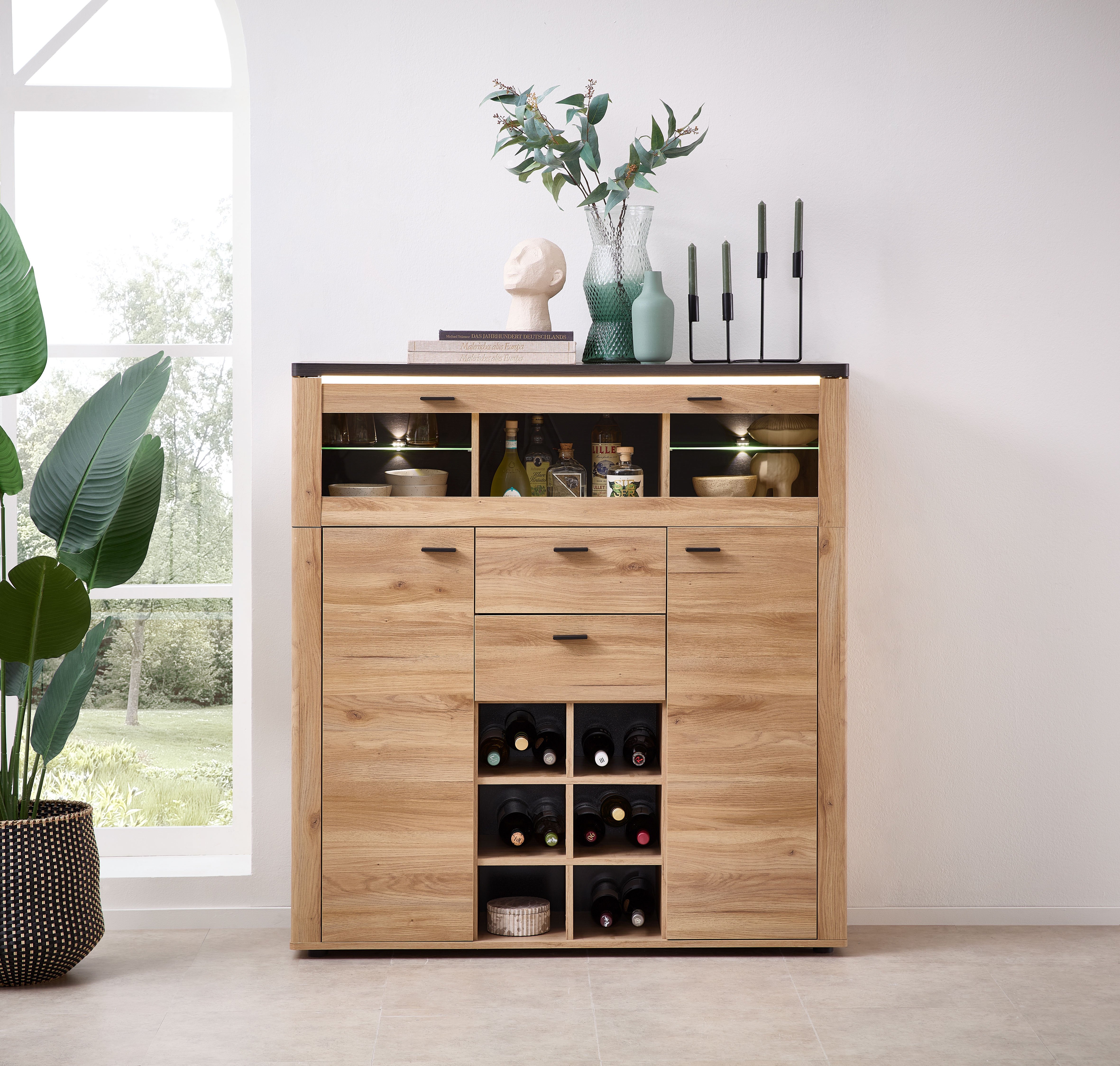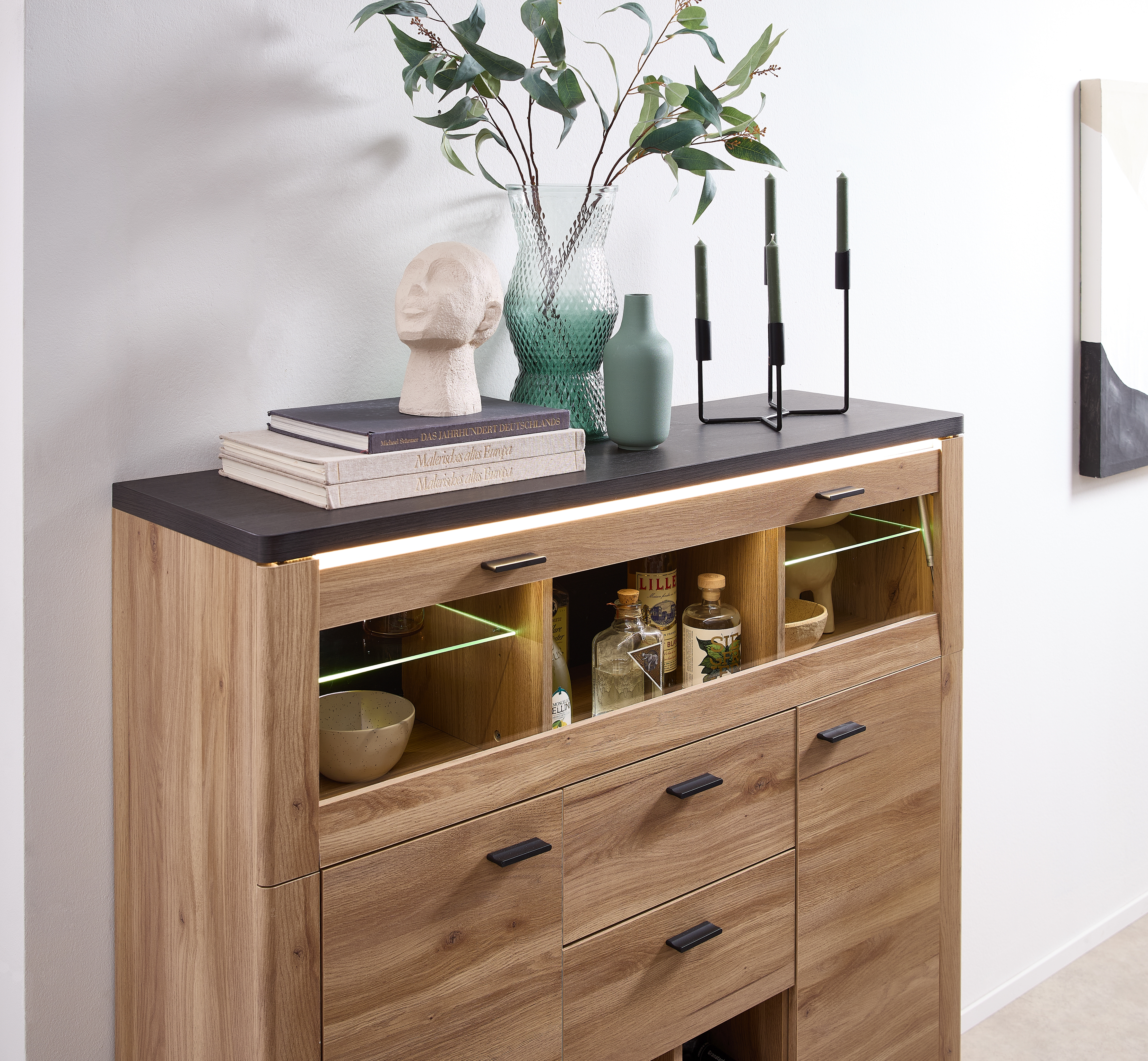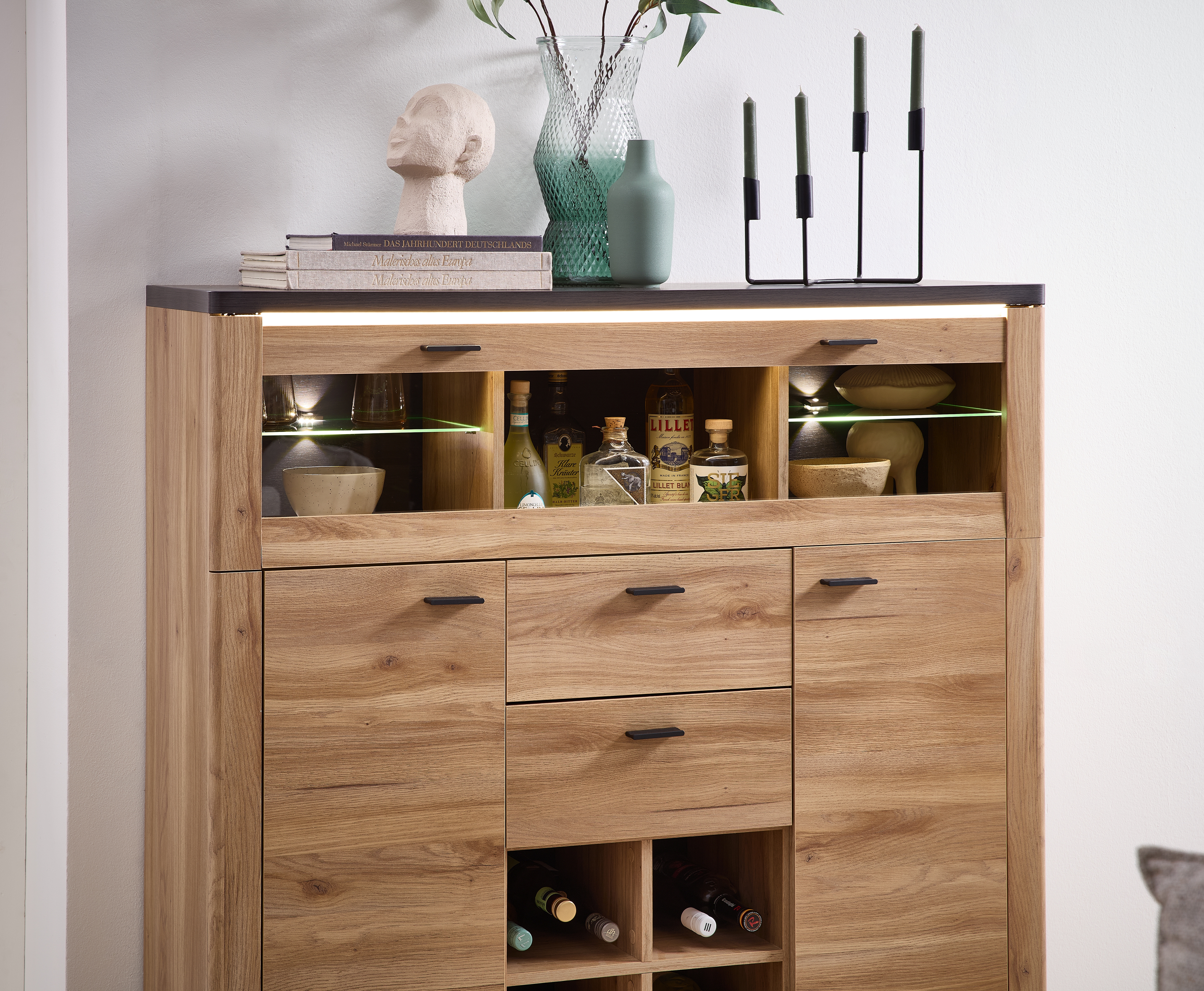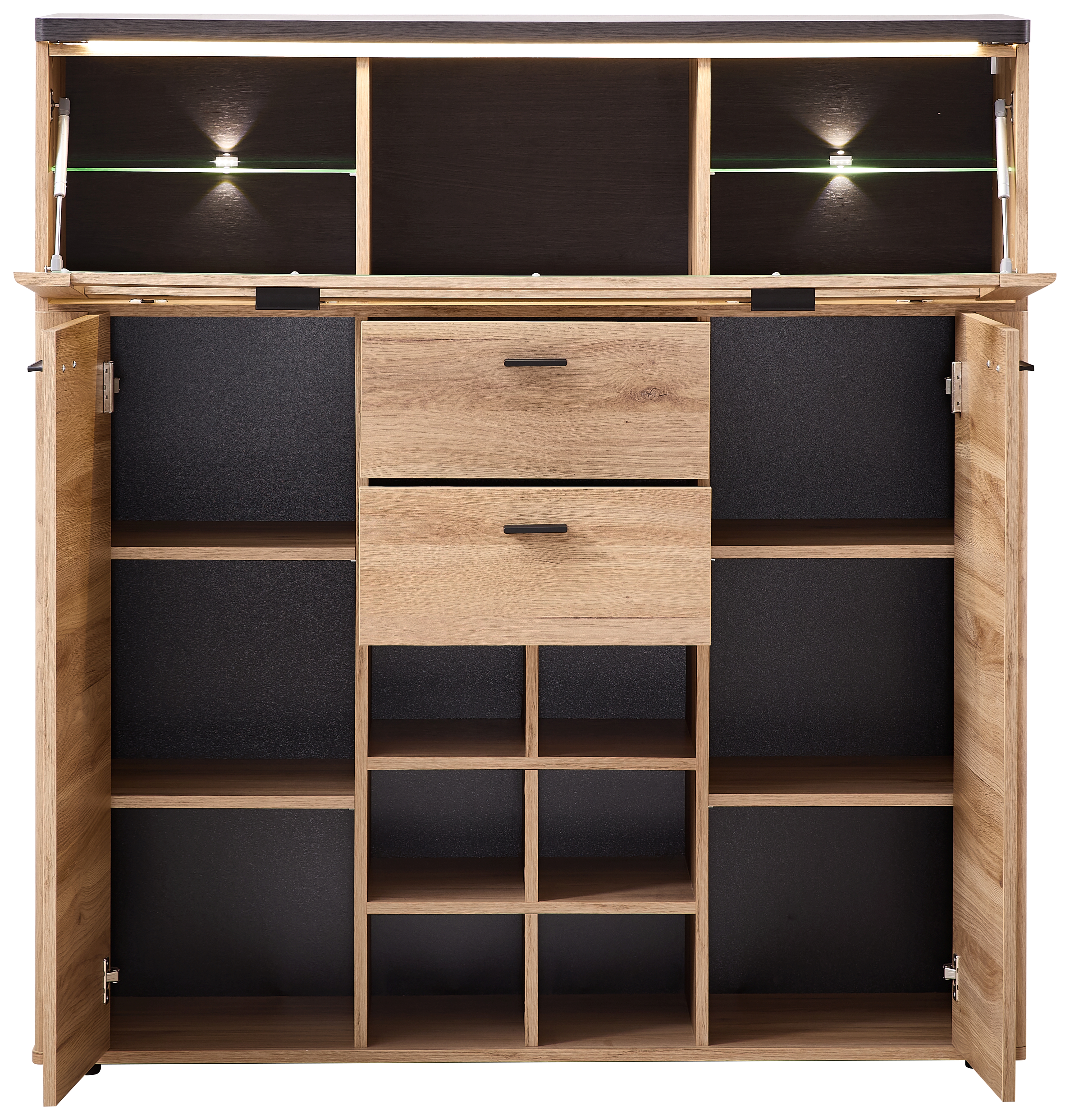 | Ausstattung Kommoden Phono Büro Regal: | Abattant(s), Casiers ouverts, Portes, Tiroirs, incl. éclairage | ||